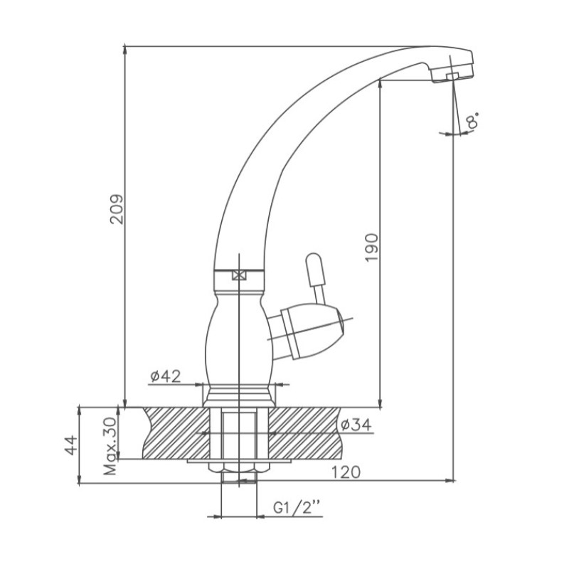 Вентильное управление. Изготовлен из металлического сплава. Изменение угла аэратора на 8 градусов. Максимальная глубина монтажа 30 мм. Монтажное отверстие 34 мм. Поворотный излив. Цвет хром. Кран предназначен только для использования холодной воды.