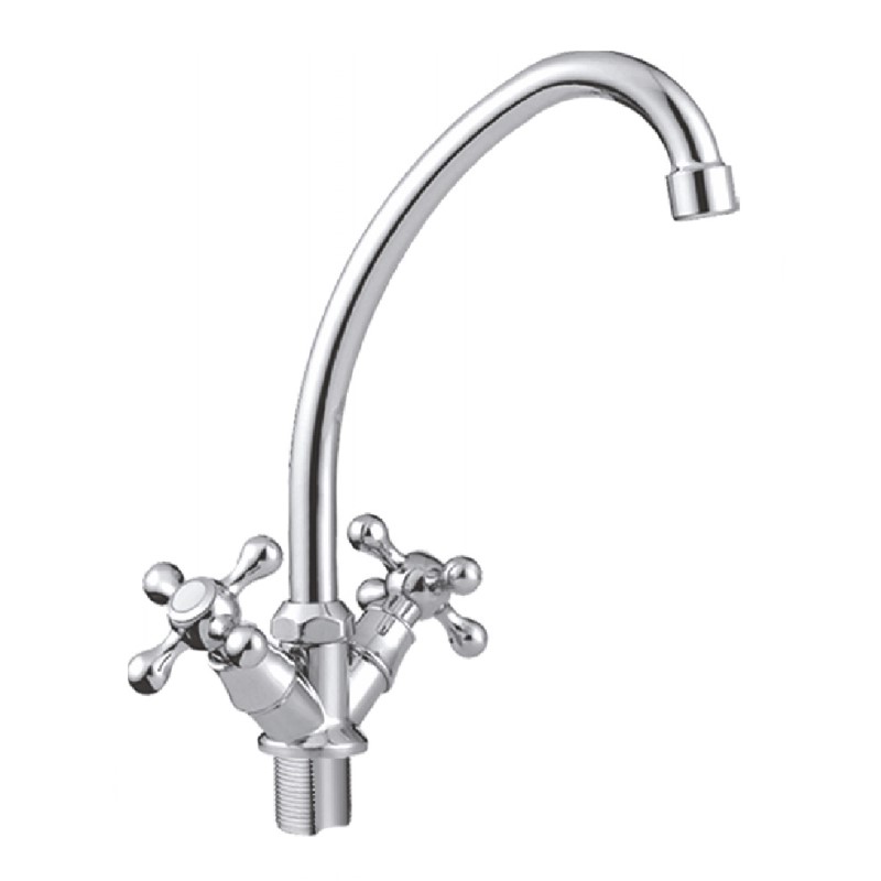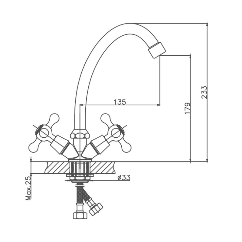 Вентильное управление. Изготовлен из металлического сплава. Максимальная глубина монтажа 25 мм. Монтажное отверстие 33 мм. Поворотный излив. Цвет хром.
