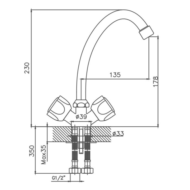 Вентильное управление. Изготовлен из металлического сплава. Максимальная глубина монтажа 35 мм. Монтажное отверстие 33 мм. Поворотный излив. Цвет хром.