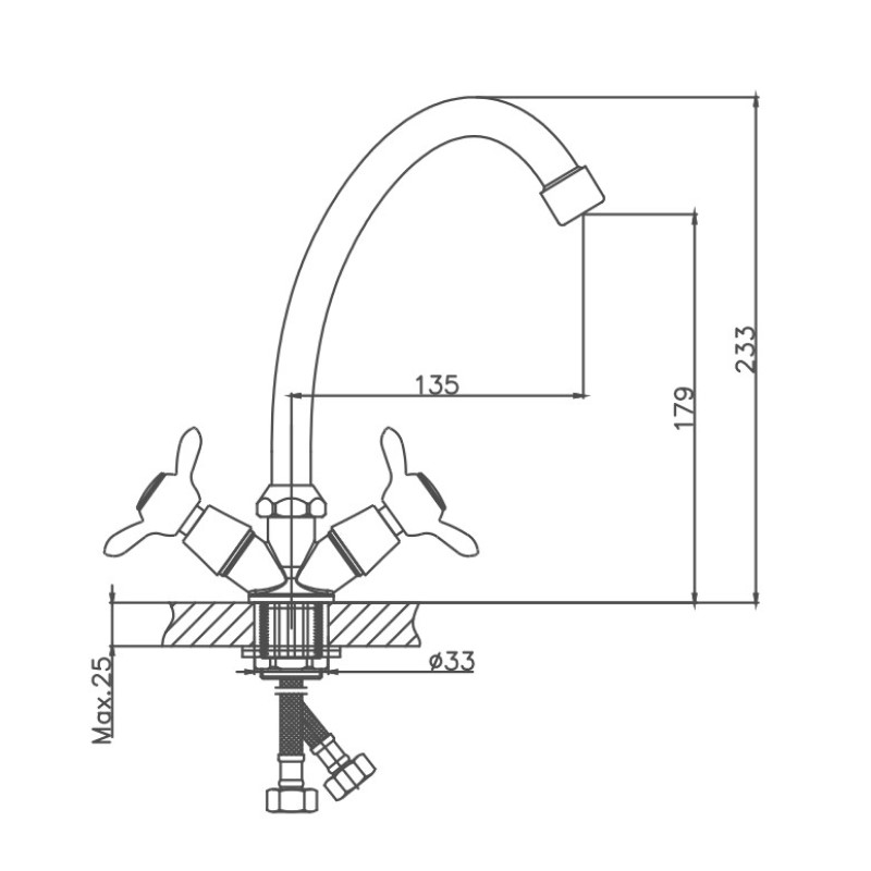 Вентильное управление. Изготовлен из металлического сплава. Максимальная глубина монтажа 25 мм. Монтажное отверстие 33 мм. Поворотный излив. Цвет хром.