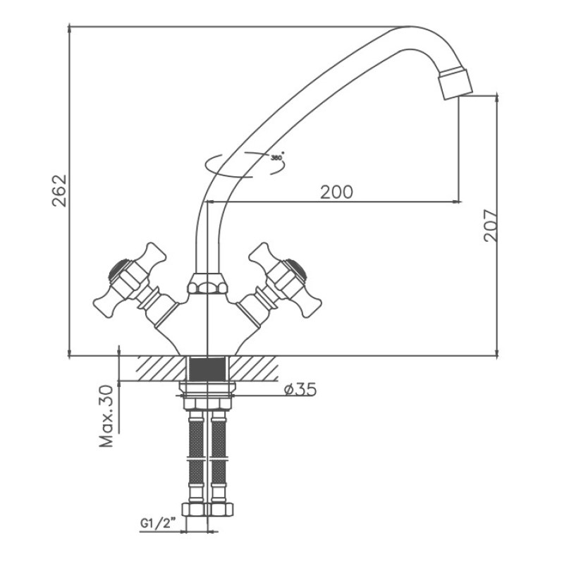 Вентильное управление. Изготовлен из металлического сплава. Максимальная глубина монтажа 30 мм. Монтажное отверстие 35 мм. Поворотный излив. Цвет хром.