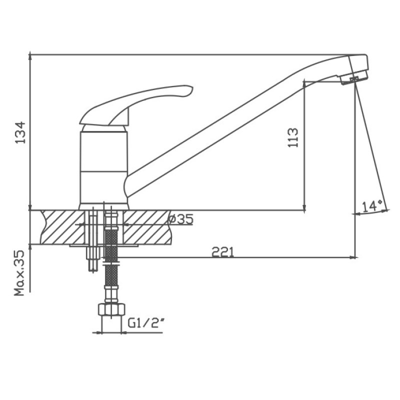 Керамический картридж 40 мм. Изготовлен из металлического сплава. Изменение угла аэратора на 14 градусов. Максимальная глубина монтажа 35 мм. Монтажное отверстие 35 мм. Поворотный излив. Цвет хром.