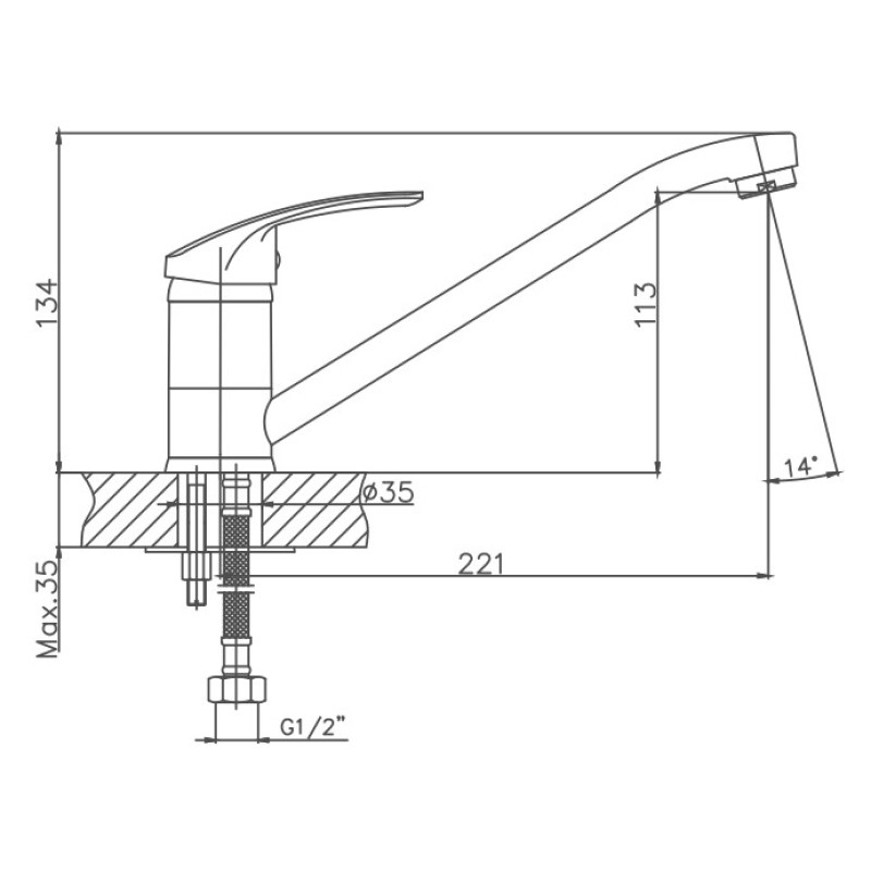 Керамический картридж 35 мм. Изготовлен из металлического сплава. Изменение угла аэратора на 14 градусов. Максимальная глубина монтажа 35 мм. Монтажное отверстие 35 мм. Поворотный излив. Цвет хром.