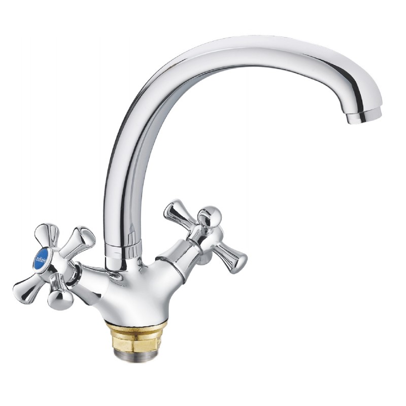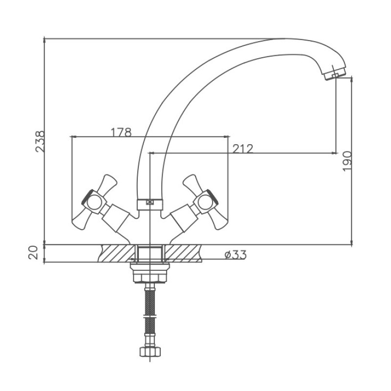 Вентильное управление. Изготовлен из металлического сплава. Максимальная глубина монтажа 20 мм. Монтажное отверстие 33 мм. Поворотный излив. Цвет хром.