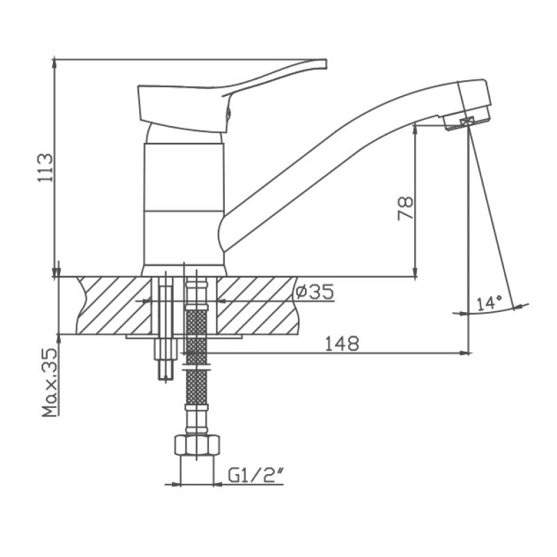 Керамический картридж 35 мм. Изготовлен из металлического сплава. Изменение угла аэратора на 14 градусов. Максимальная глубина монтажа 35 мм. Монтажное отверстие 35 мм. Поворотный излив. Цвет хром.