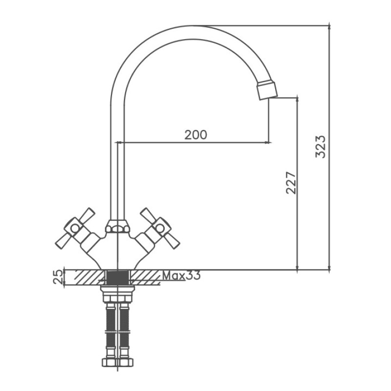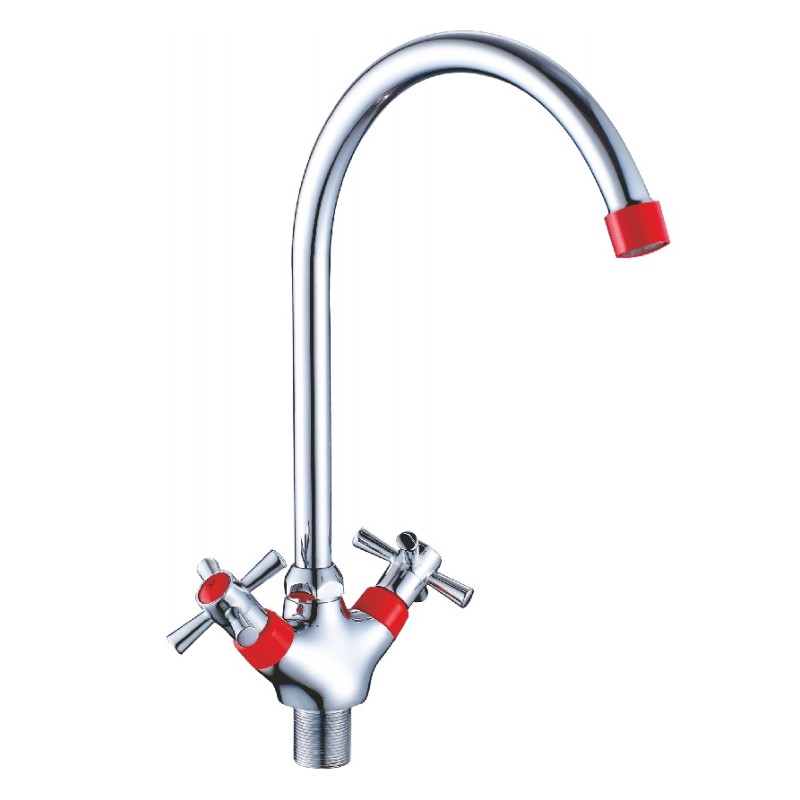 Вентильное управление. Изготовлен из металлического сплава. Максимальная глубина монтажа 25 мм. Монтажное отверстие 33 мм. Поворотный излив. Цвет красный/хром.