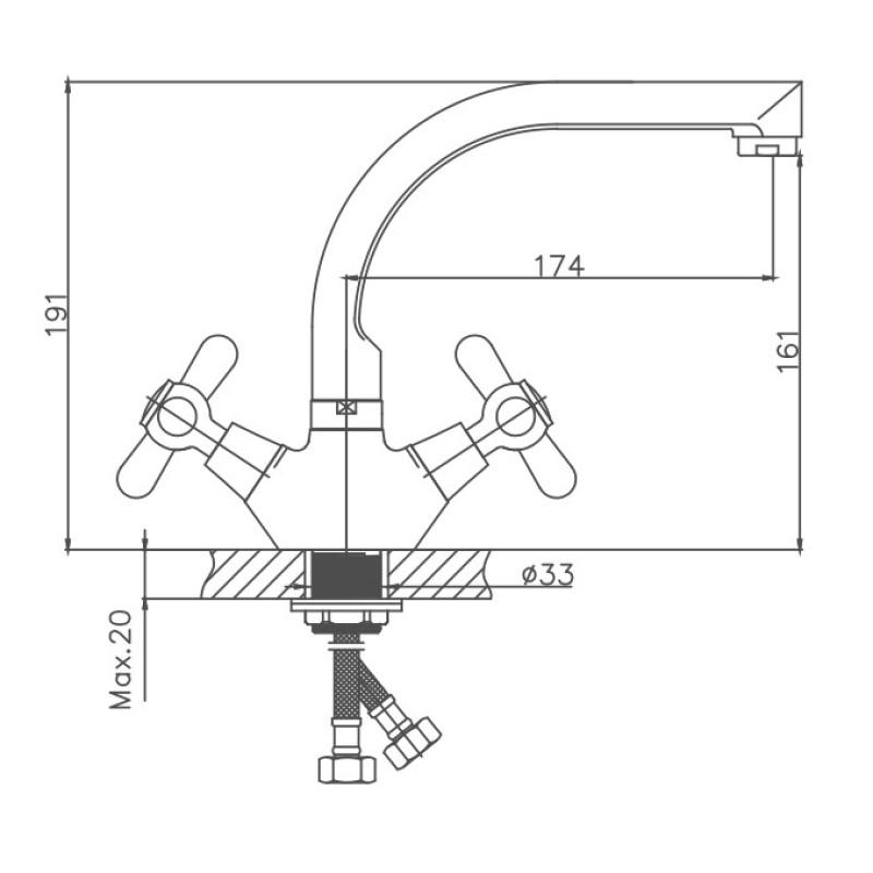 Вентильное управление. Изготовлен из металлического сплава. Максимальная глубина монтажа 20 мм. Монтажное отверстие 33 мм. Поворотный излив. Цвет хром.