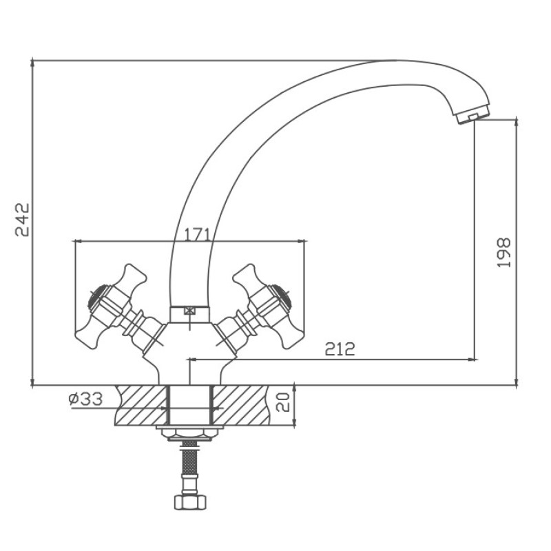 Вентильное управление. Изготовлен из металлического сплава. Максимальная глубина монтажа 20 мм. Монтажное отверстие 33 мм. Поворотный излив. Цвет хром.
