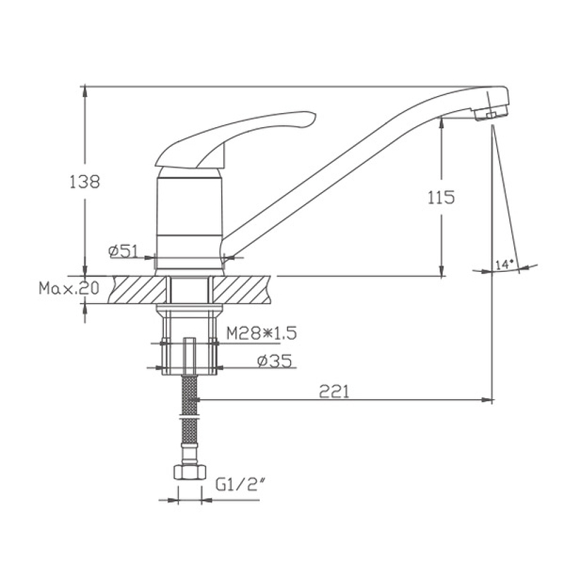 Керамический картридж 40 мм. Изготовлен из металлического сплава. Изменение угла аэратора на 14 градусов. Максимальная глубина монтажа 20 мм. Монтажное отверстие 28 мм. Поворотный излив. Цвет хром.