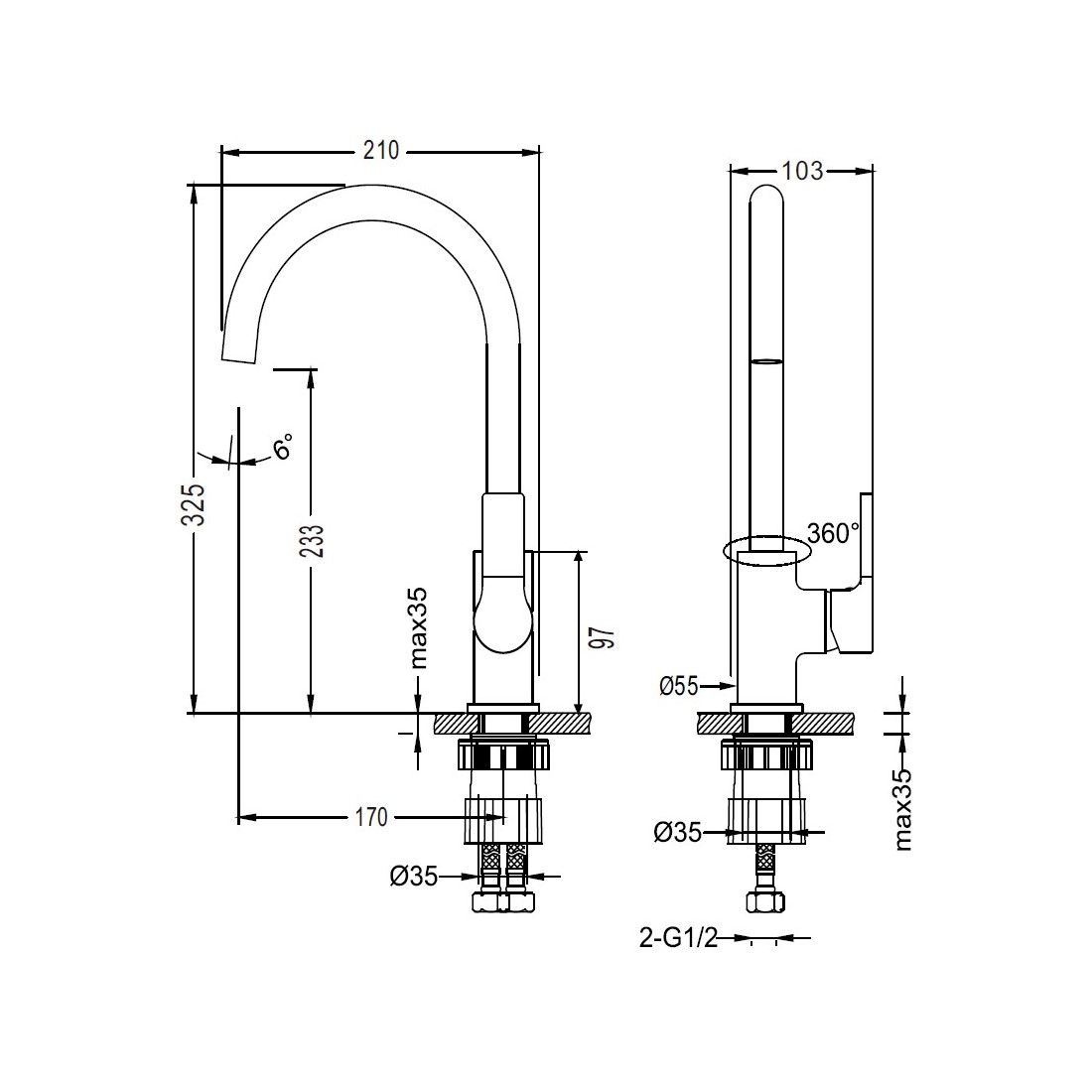 Поворотный излив оснащён аэратором, который позволяет равномерно распределять воду и смягчать её поток. Аэратор также способствует экономии воды за счёт смешивания её с воздухом.