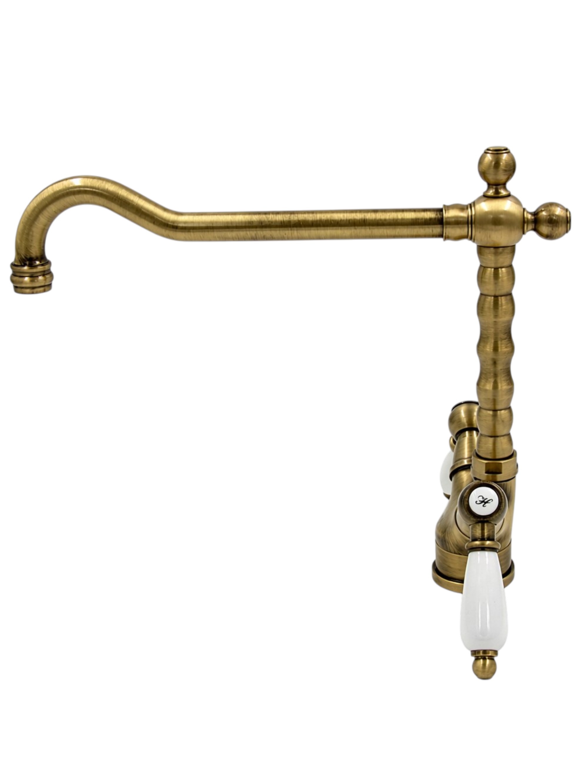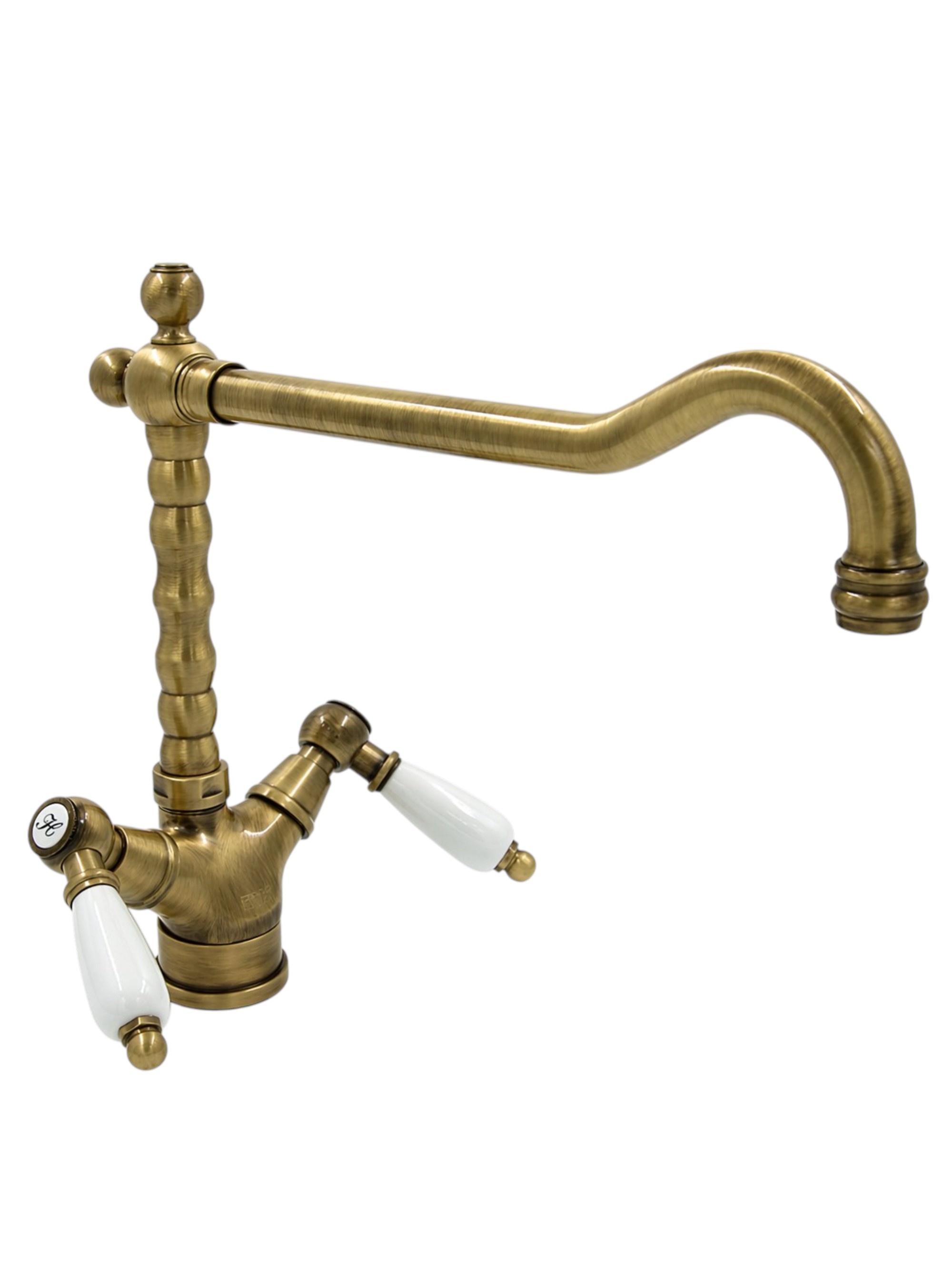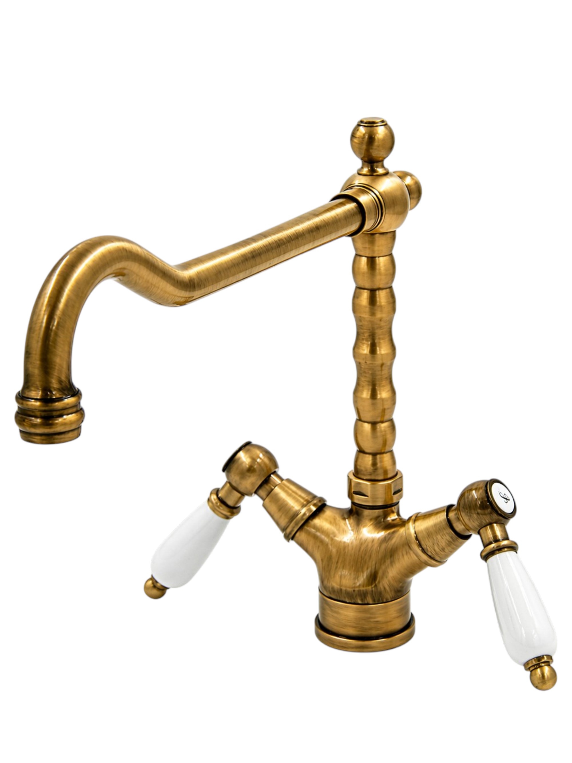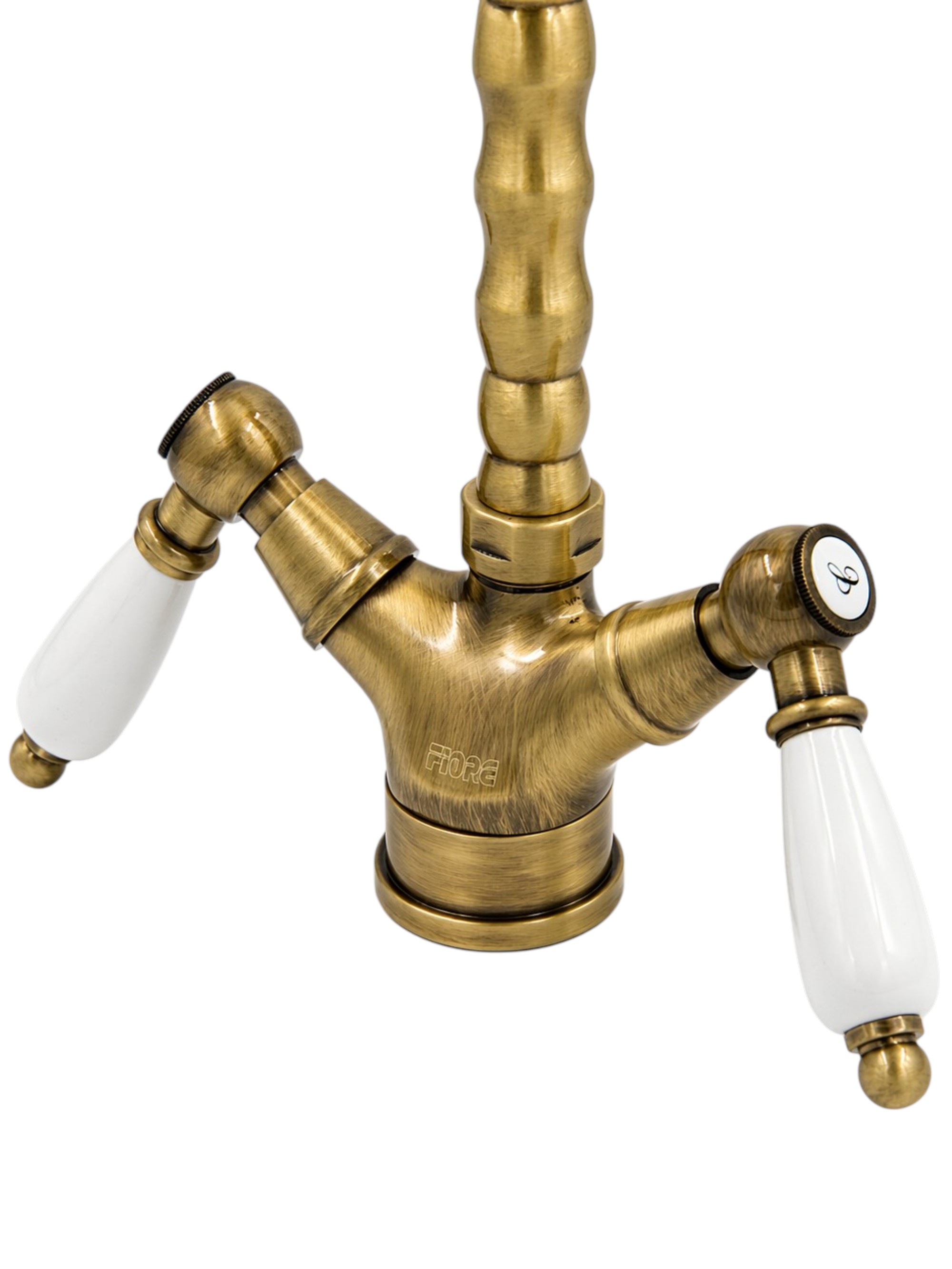 Смеситель для кухни Fiore COLONIALE 02ZZ0644, бронза. Этот кухонный смеситель в изысканном ретро-стиле с благородным бронзовым покрытием станет настоящим украшением вашей кухни. Он сочетает в себе утончённый итальянский дизайн, функциональность и долговечность. Длинный поворотный излив обеспечивает максимальный комфорт при мытье посуды и наполнении высоких ёмкостей, а вентильное управление добавляет особый шарм и простоту в использовании. Бронзовое покрытие — устойчиво к царапинам, потускнению и воздействию влаги.