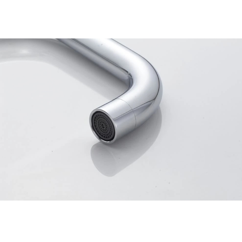 Излив этого кухонного смесителя оборудован аэратором, который помогает в экономии воды. Внутри аэратора воздух смешивается с водой, что образует насыщенную пузырьками струю, которая рассеивается на множество мелких потоков. Это делает струю более мягкой и объёмной, снижает разбрызгивание воды.
