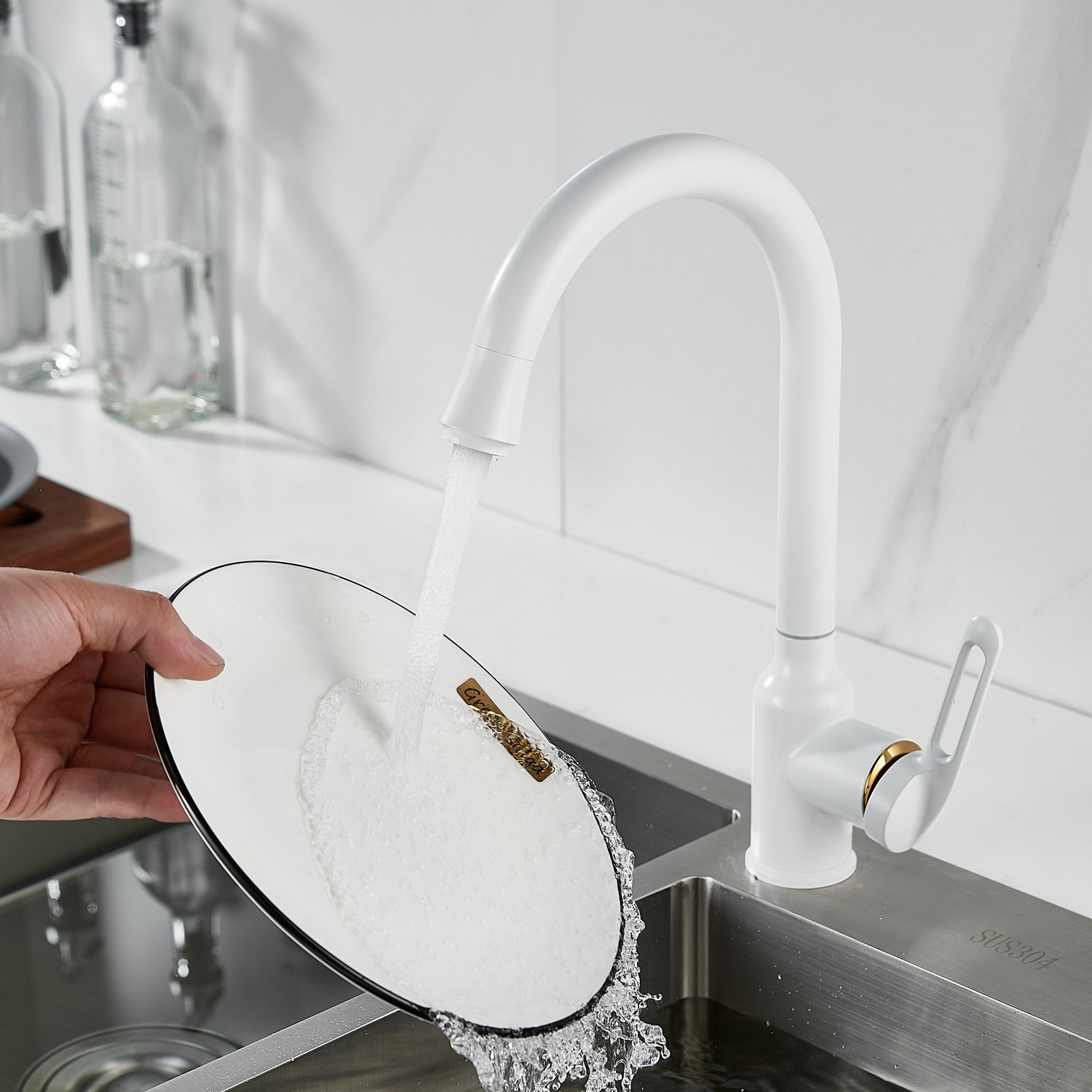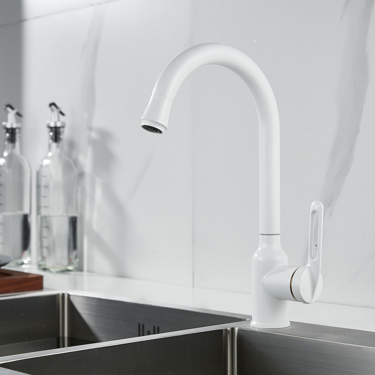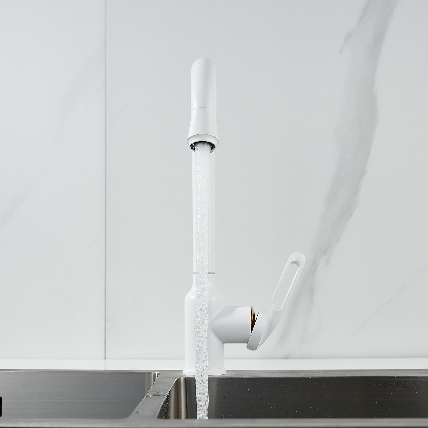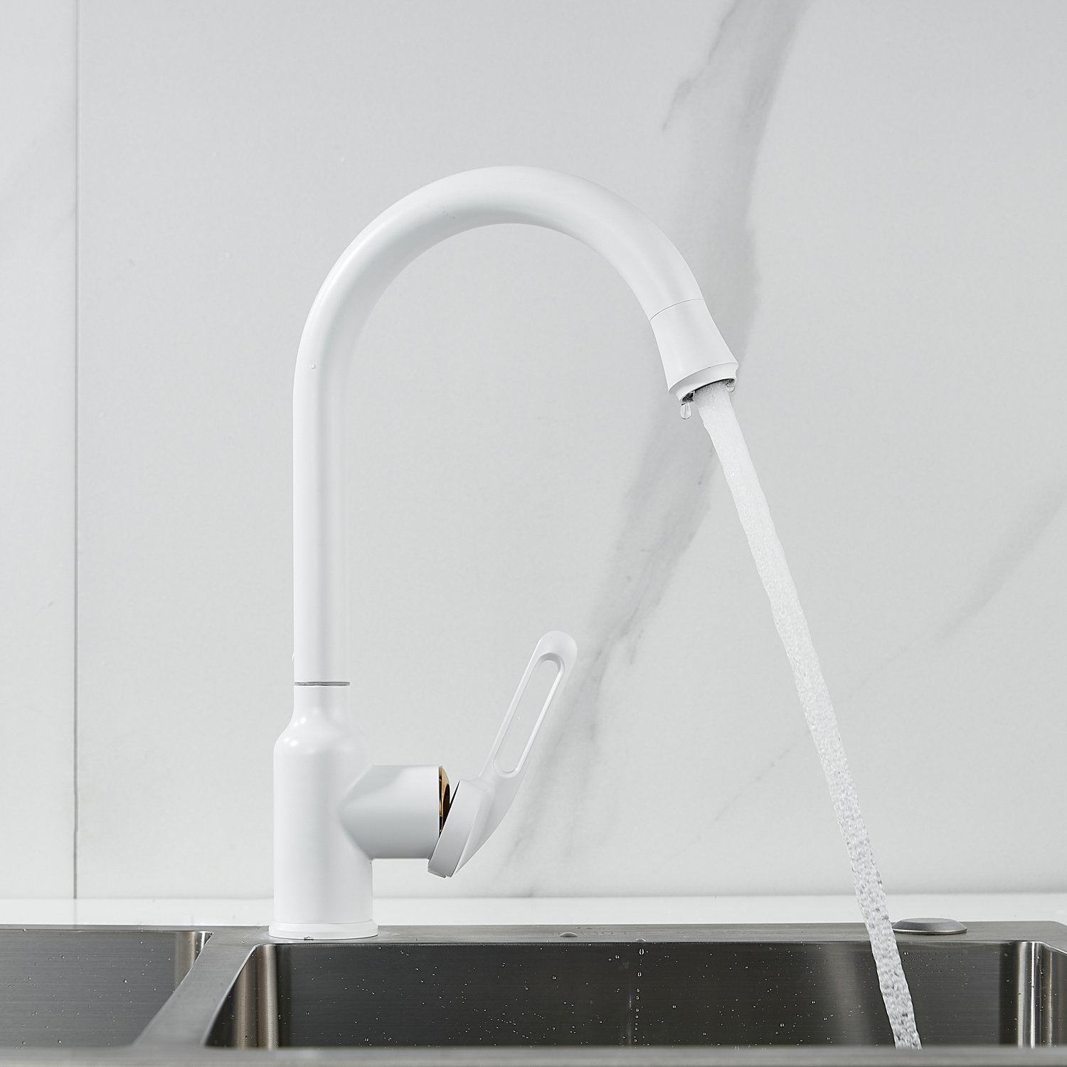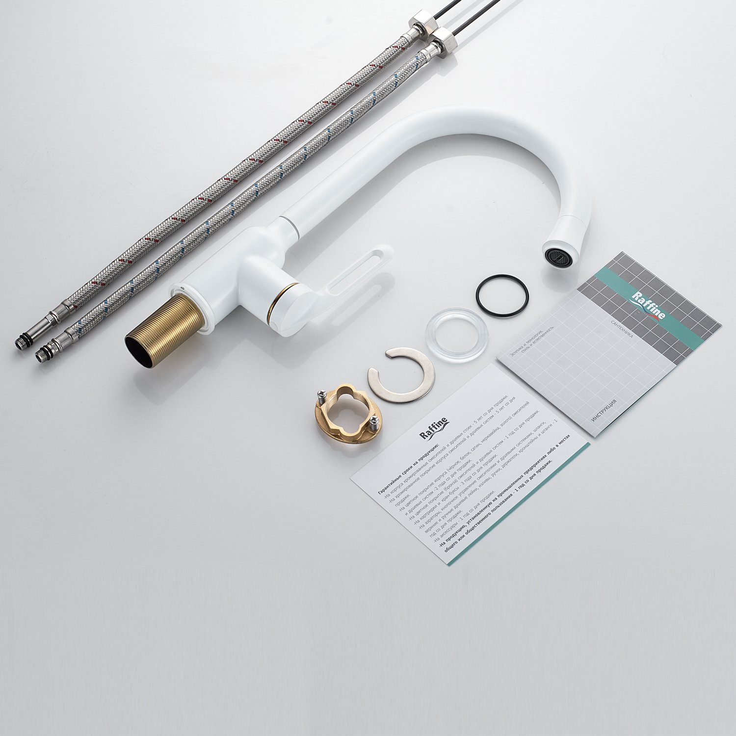 Смеситель для кухни Raffine F103C в нежном белом матовом цвете — стильное и надёжное решение для вашей кухни. Изготовлен из высококачественной нержавеющей стали, что гарантирует его прочность и долговечность.