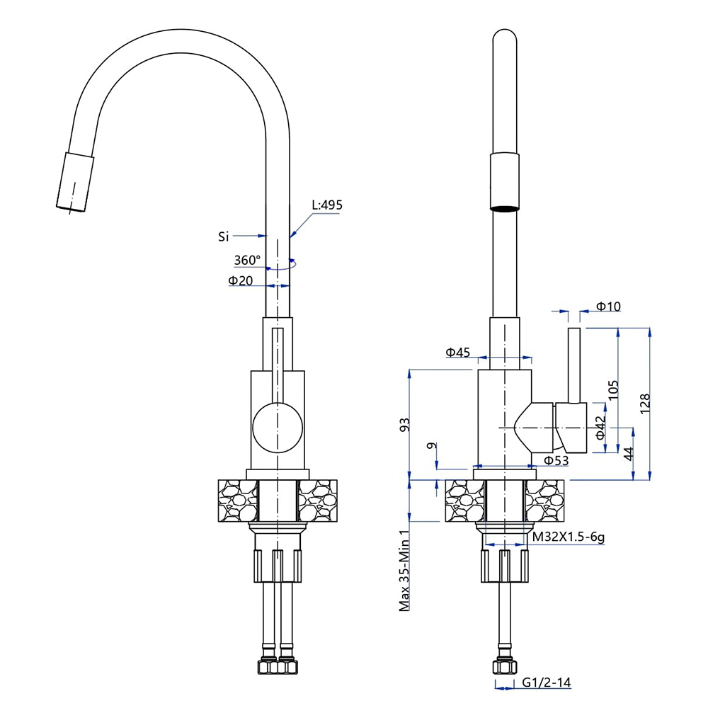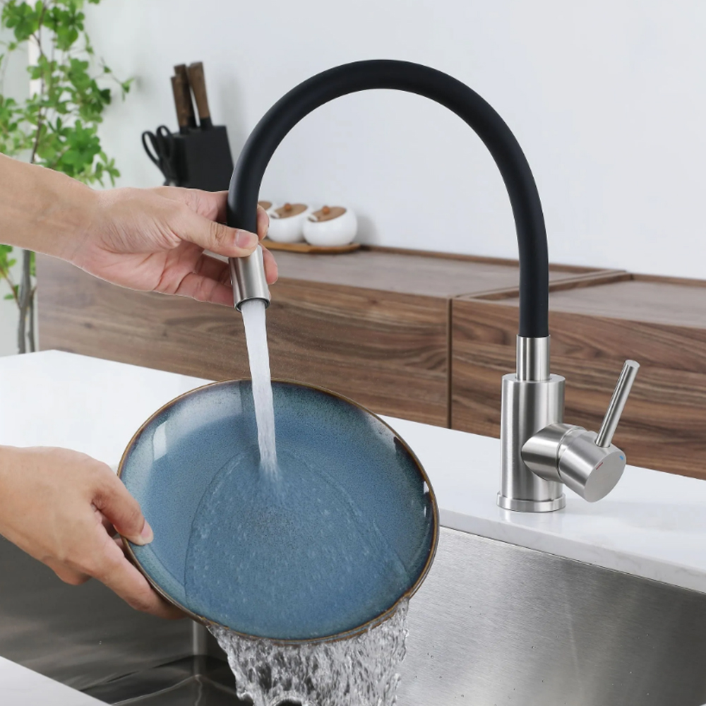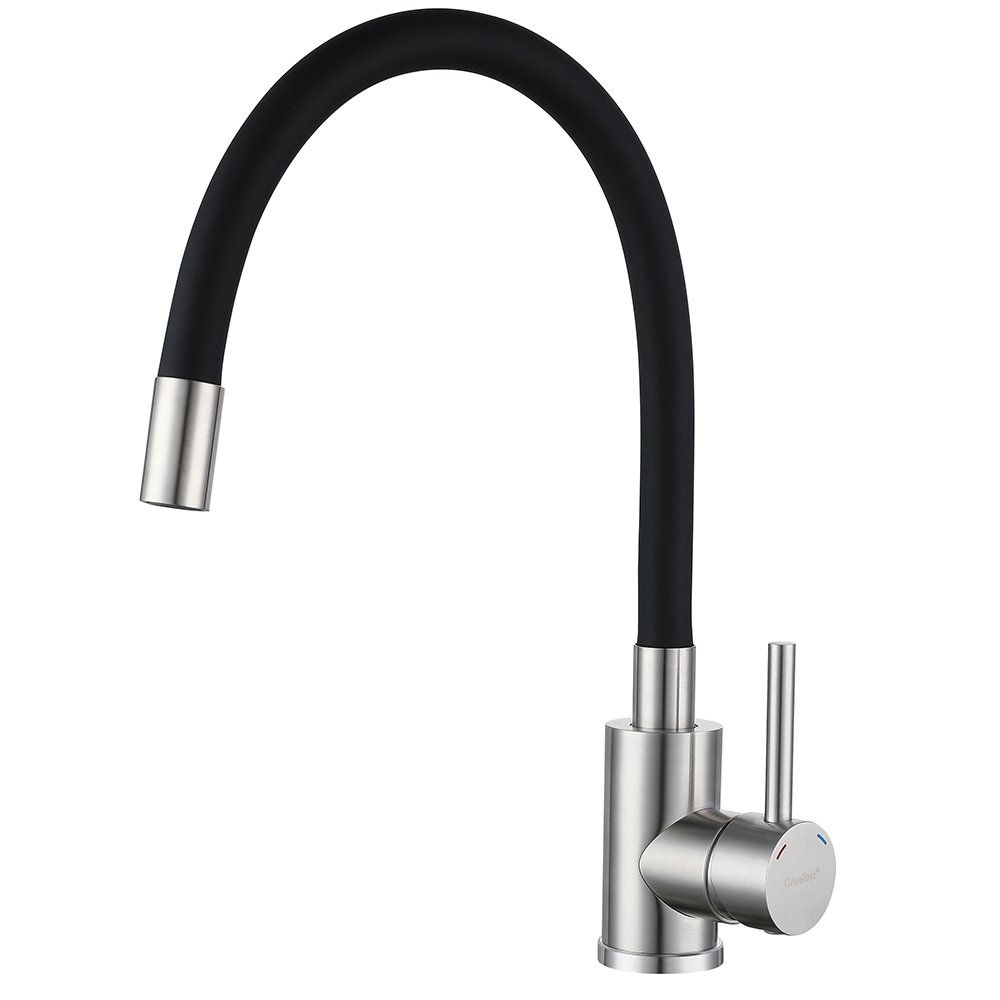Смеситель для кухни с гибким изливом GranFest 5433, черный. Материал: нержавеющая сталь. Управление: рычажное. Подключение фильтра для воды: нет. Гибкая подводка. Отверстия для монтажа: 1.