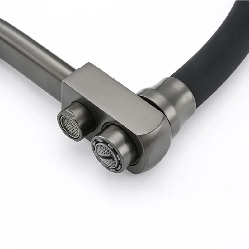 Изготовленный из прочной латуни, этот смеситель отличается высокой прочностью и долговечностью. Керамический картридж и рычажное управление обеспечивают плавный и точный контроль над потоком воды, а гибкий поворотный излив из силикона с аэратором способствует экономии воды и созданию мягкой, комфортной струи.