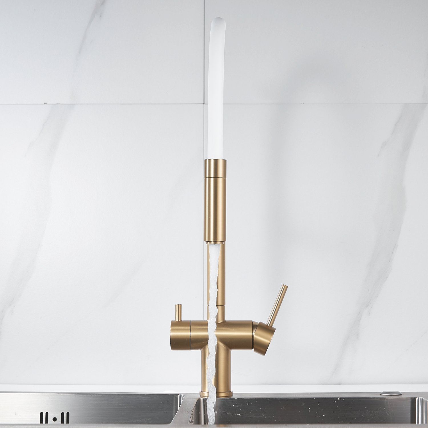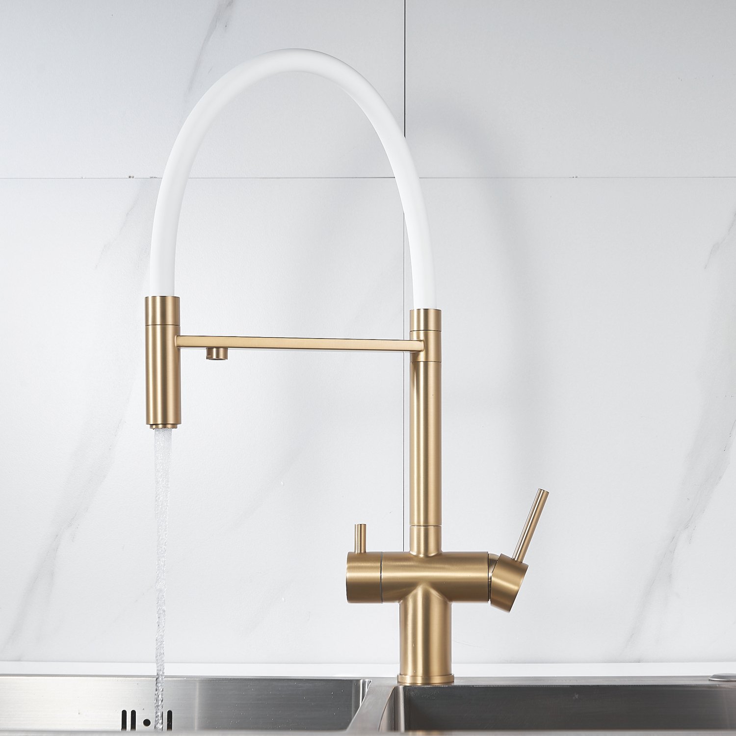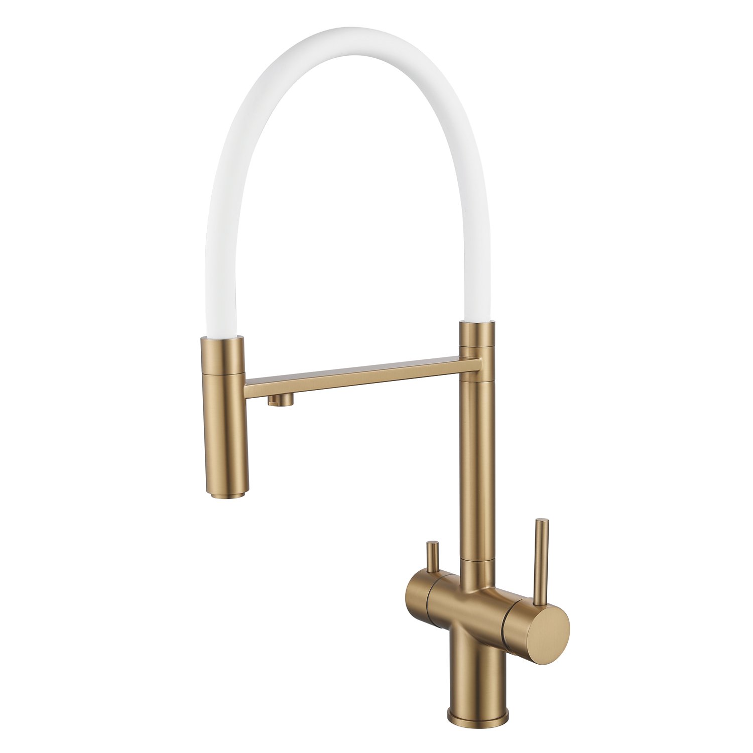 Смеситель для кухни с гибким изливом и подключением фильтра Shevanik S178G, золотой сатин/белый