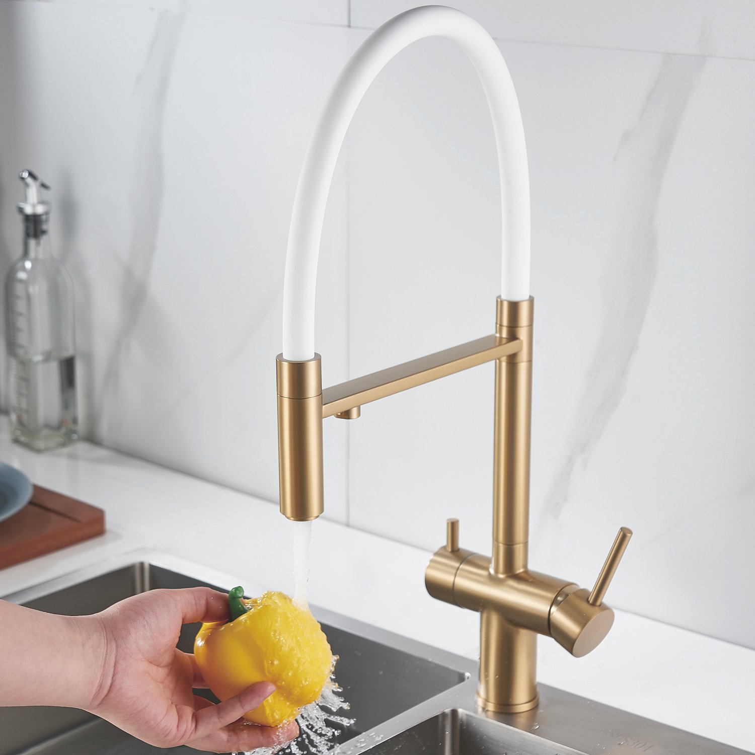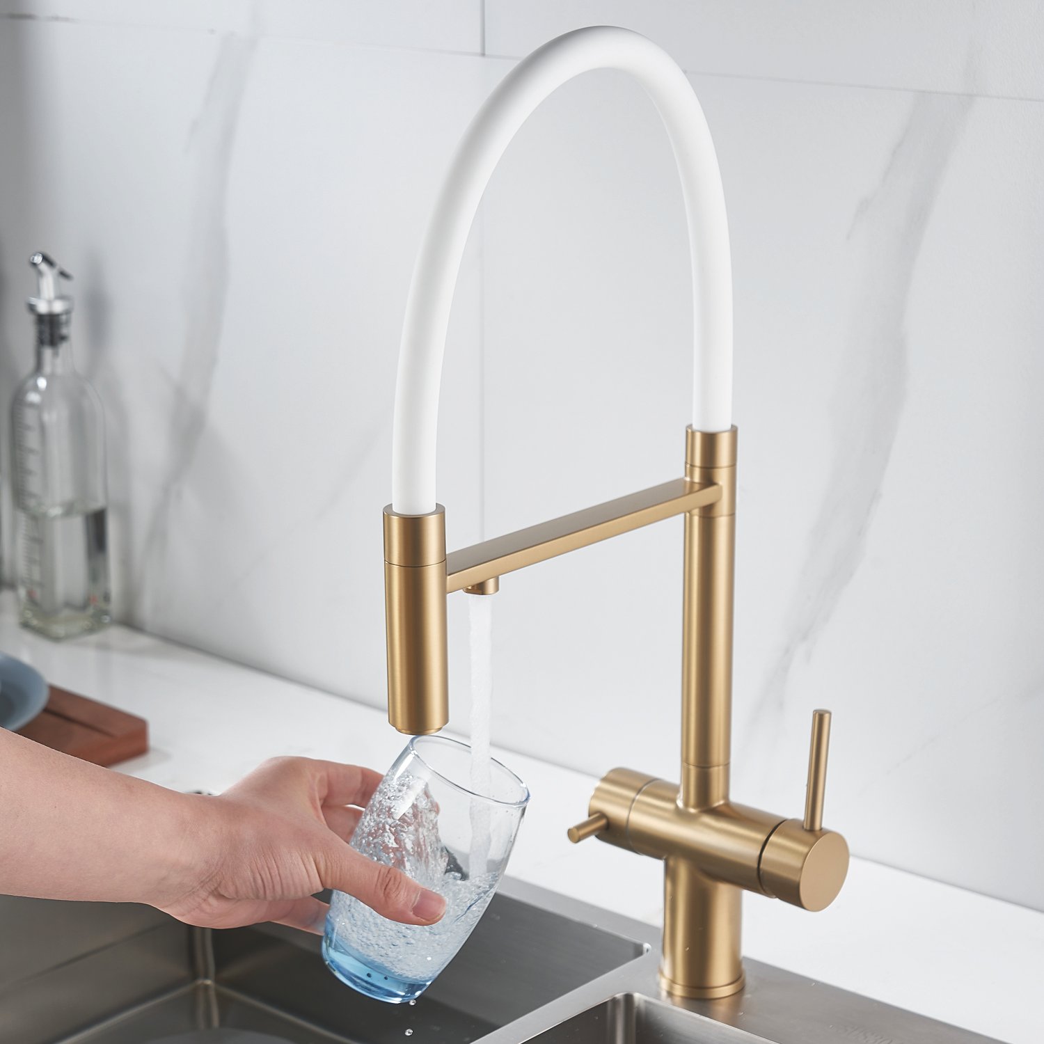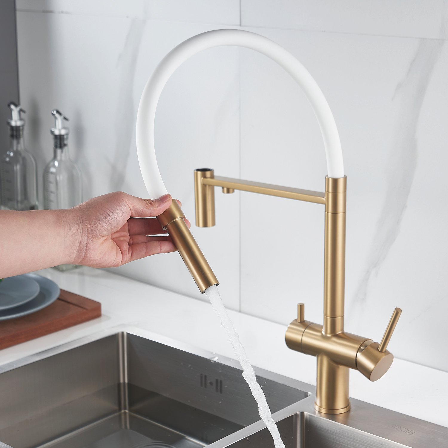 Смеситель для кухни с гибким изливом и подключением фильтра Shevanik S178G, золотой сатин/белый