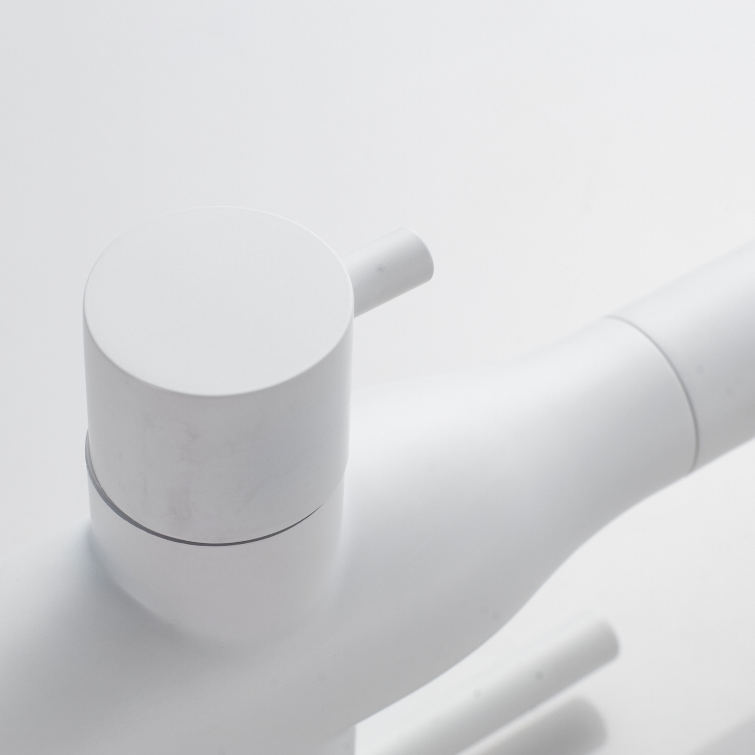 Для водопроводной воды предусмотрен гибкий излив с дополнительным режимом «душ»: достаточно повернуть кончик излива, чтобы переключиться на мягкий рассеивающий поток. В положении покоя излив надёжно фиксируется на основании смесителя с помощью магнитов. Особая деталь конструкции — поверхность вокруг магнитов выполнена из ABS‑пластика, что полностью исключает риск повреждения лакокрасочного покрытия соприкасающихся элементов и сохраняет эстетичный вид смесителя на долгие годы.