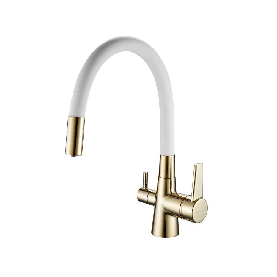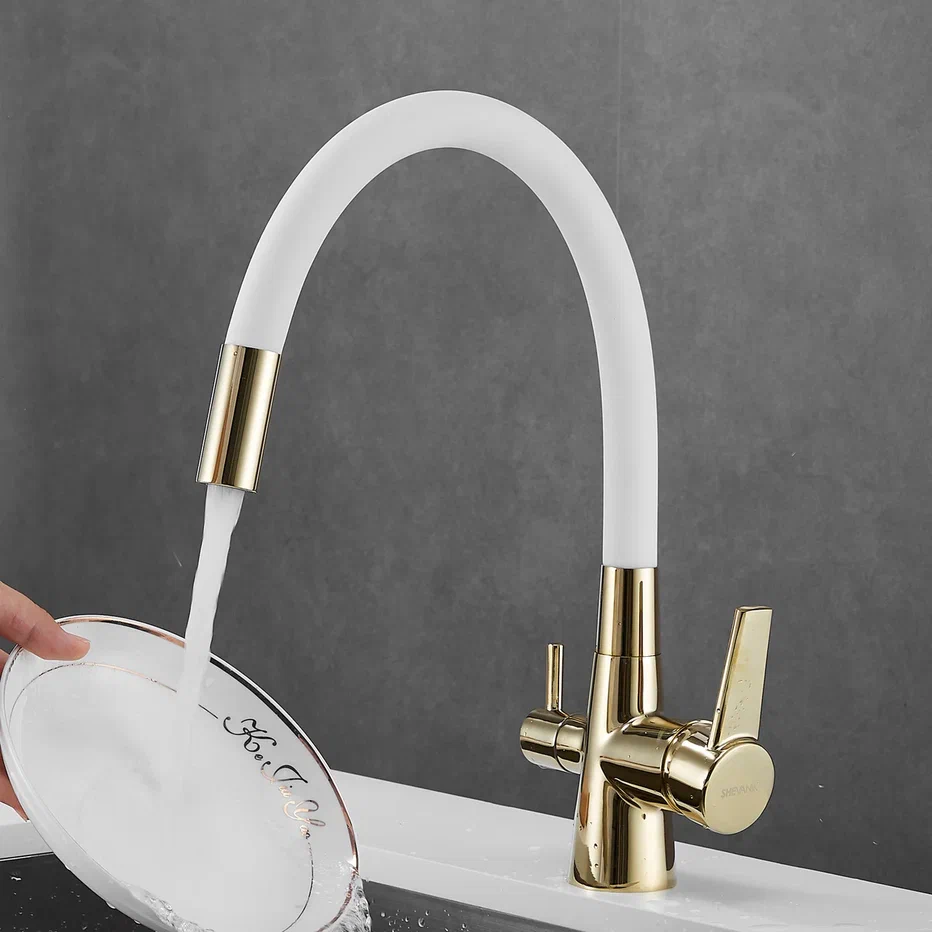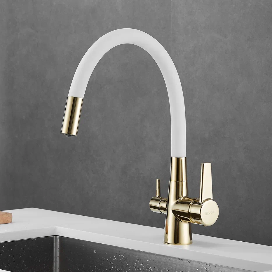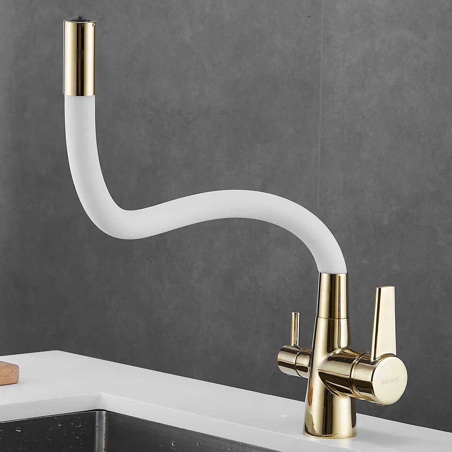 Смеситель для кухни с гибким изливом и подключением фильтра Shevanik S668E, золото/белый
