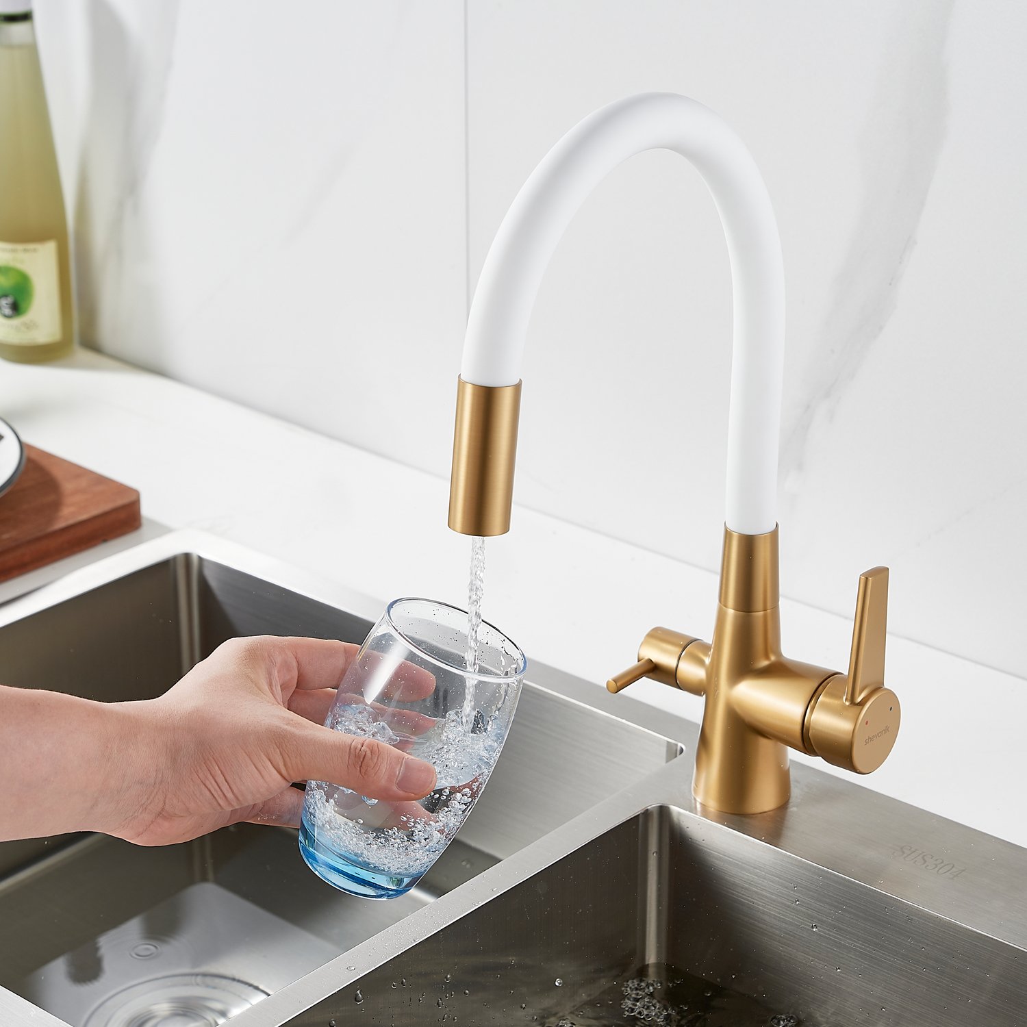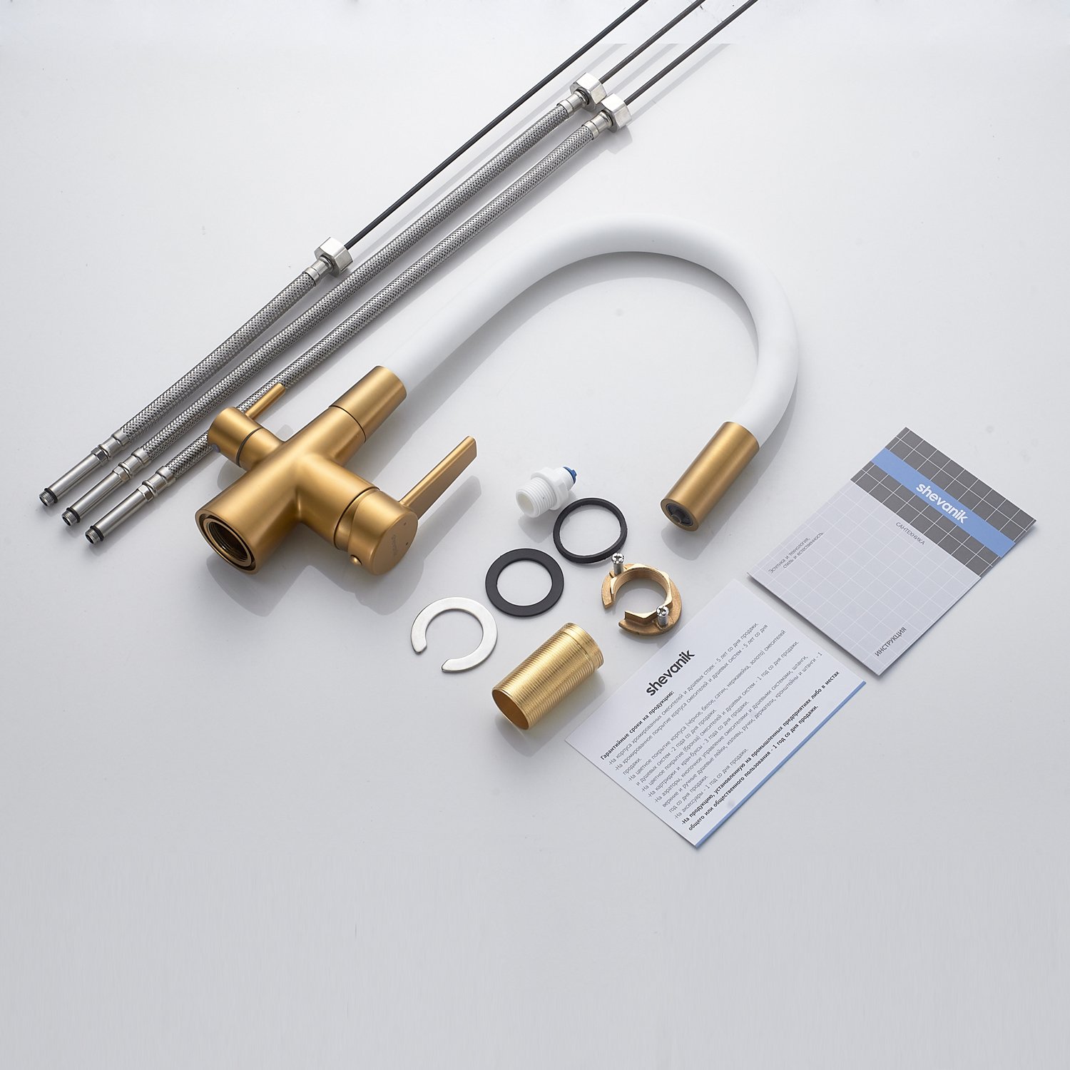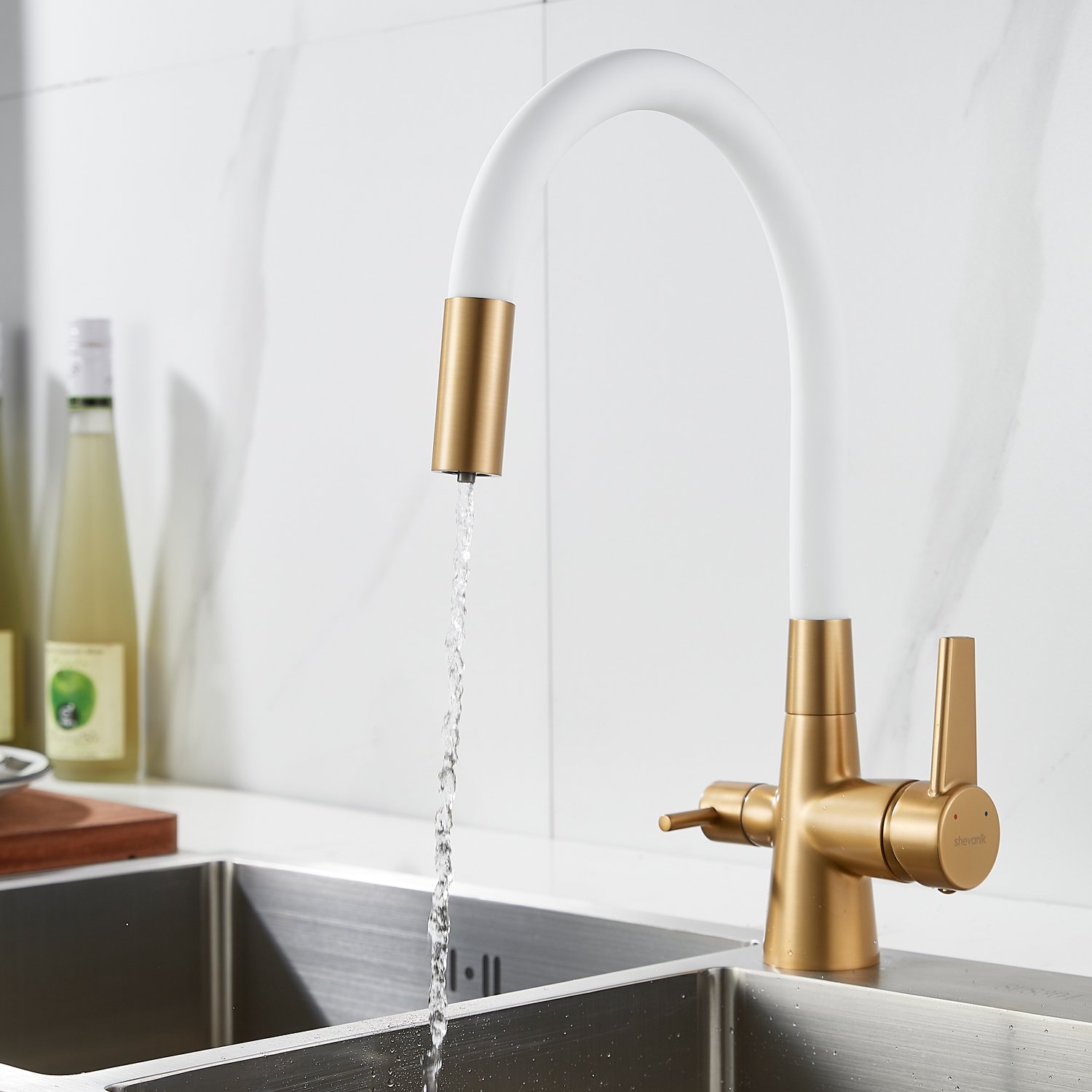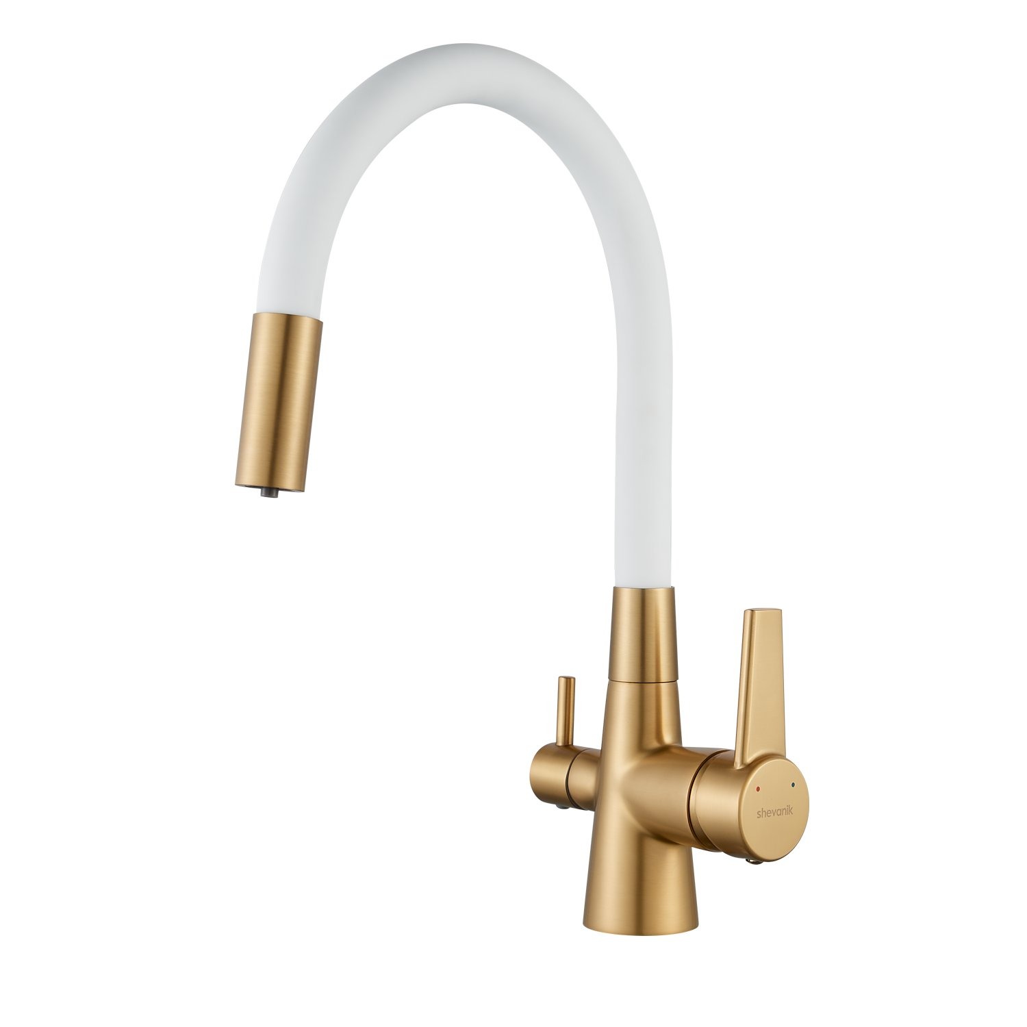 Смеситель для кухни с гибким изливом и подключением фильтра Shevanik S668G, золотой сатин/белый