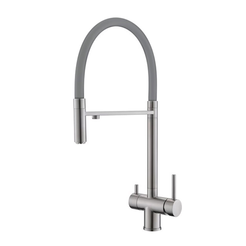 Смеситель для кухни с гибким изливом (серый) под фильтр из нержавеющей стали EKO, EKO05-161. Смеситель изготовлен из нержавеющей стали SUS304. Данный материал отличается особой прочностью, износостойкостью и гигиеничностью. 0% Pb – нержавеющая сталь не содержит свинец, является экологически чистым материалом. Цвет корпуса: сатин. Цвет излива: серый. Керамический картридж 35 мм. Пластиковый аэратор с каналом для питьевой воды. Гибкая подводка EPDM в оплетке из нержавеющей стали 1/2″ 50 см. Подводка для подключения к фильтру 35 см. Пьедестал из нержавеющей стали. Крепеж.