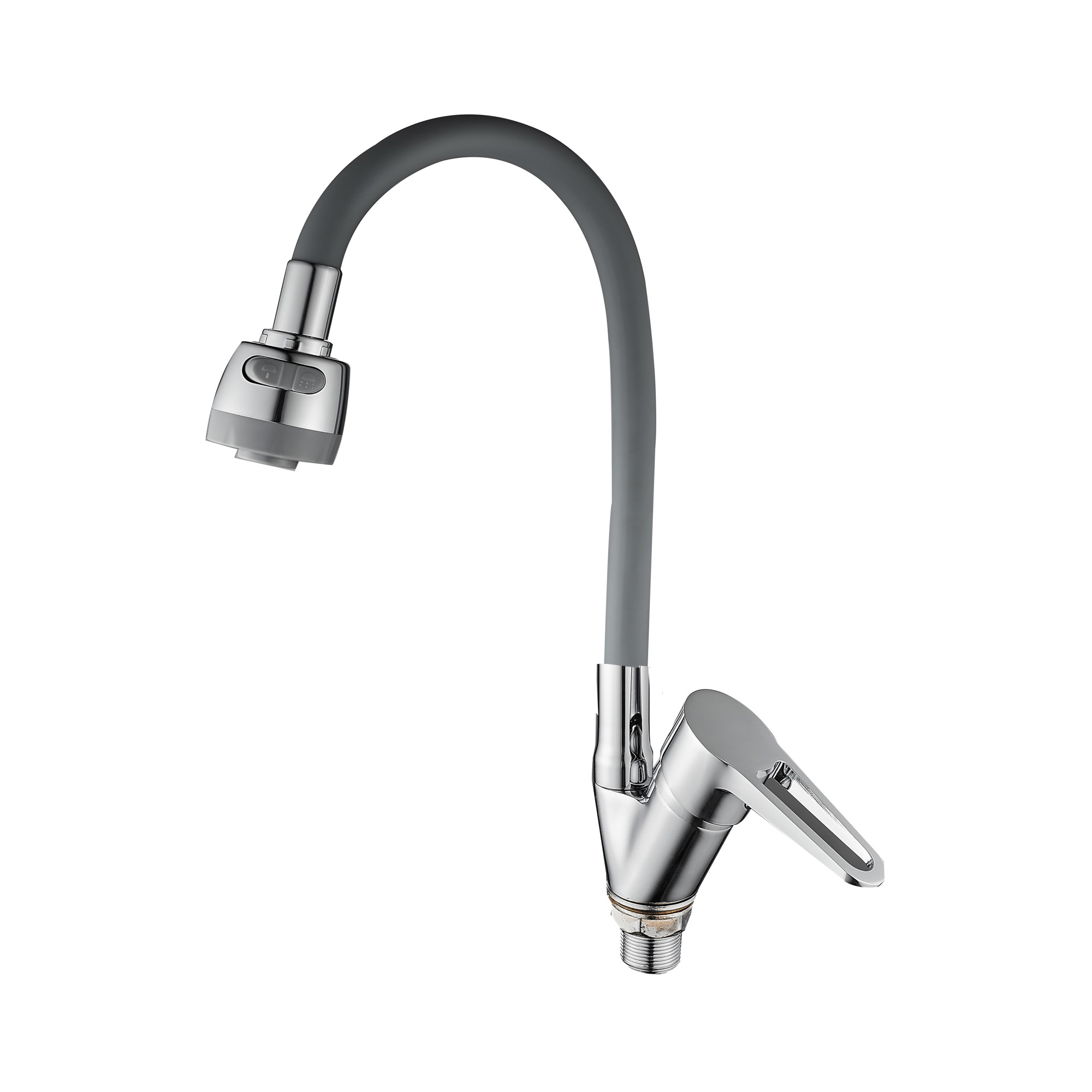 Гибкий силиконовый излив серого цвета с аэратором позволяет легко направлять поток воды в нужном направлении, а также обеспечивает равномерное распределение воды и её смягчение.