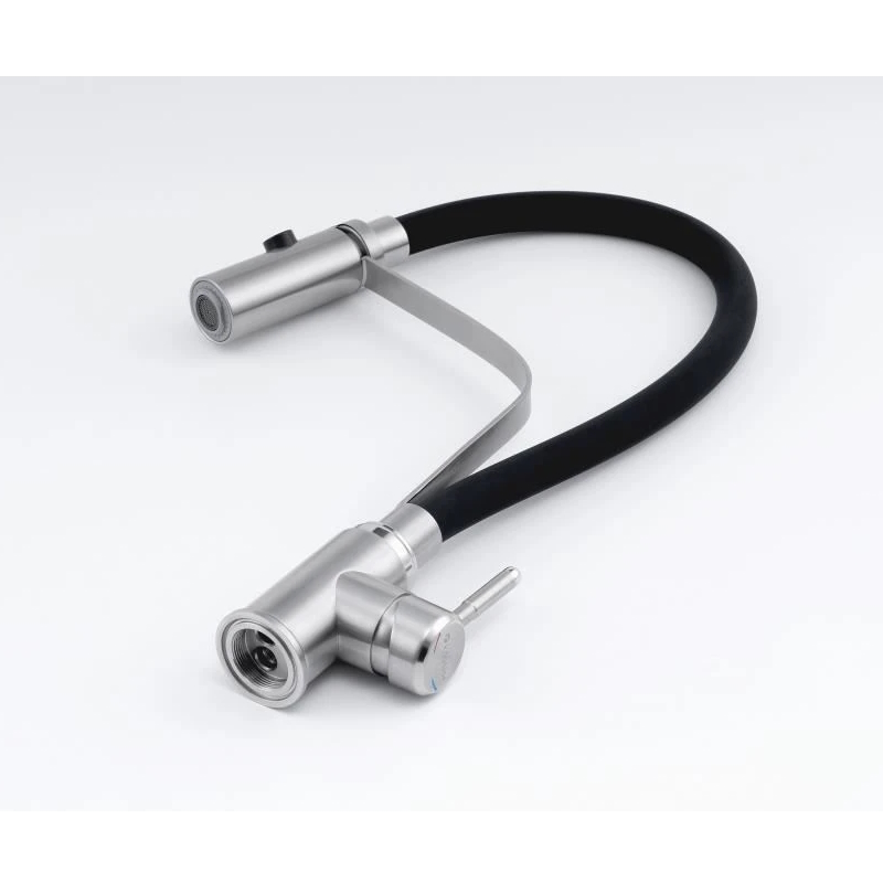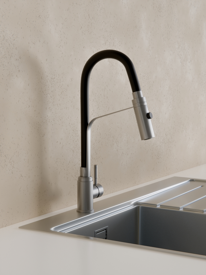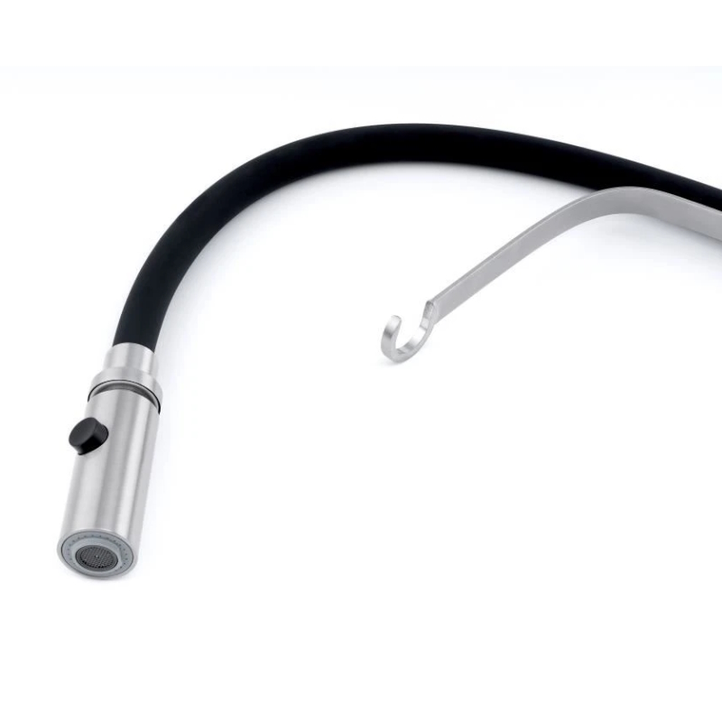 Функциональность гибкого излива и матовая стальная поверхность создают гармонию современного дизайна и удобства.