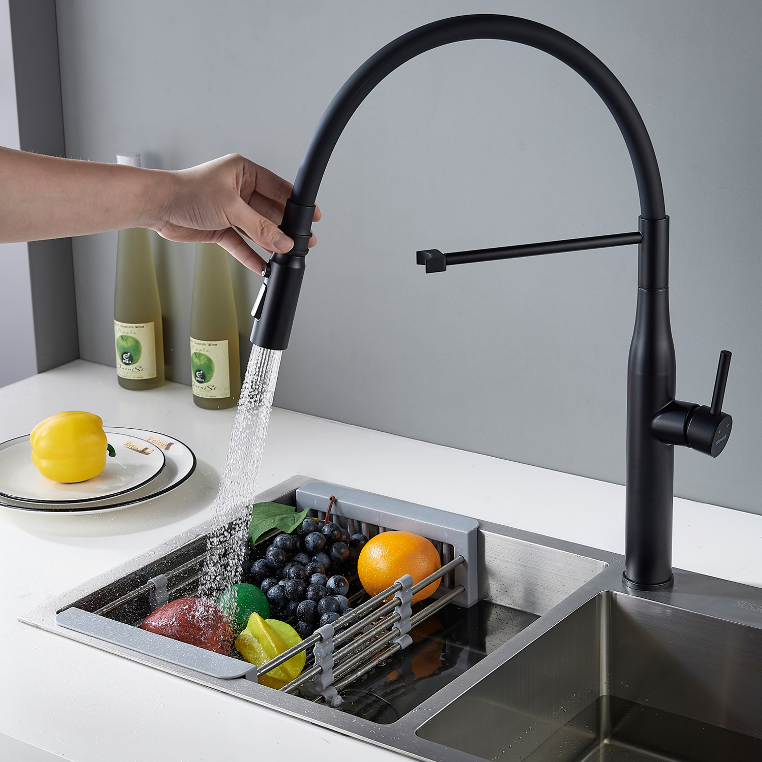 Особое внимание уделено изливу: он высокий, поворотный и гибкий, что позволяет легко мыть посуду любой формы, наполнять ёмкости и даже удобно ополаскивать крупные кастрюли. Благодаря магнитному держателю, излив аккуратно фиксируется на месте, не болтается и не мешает.