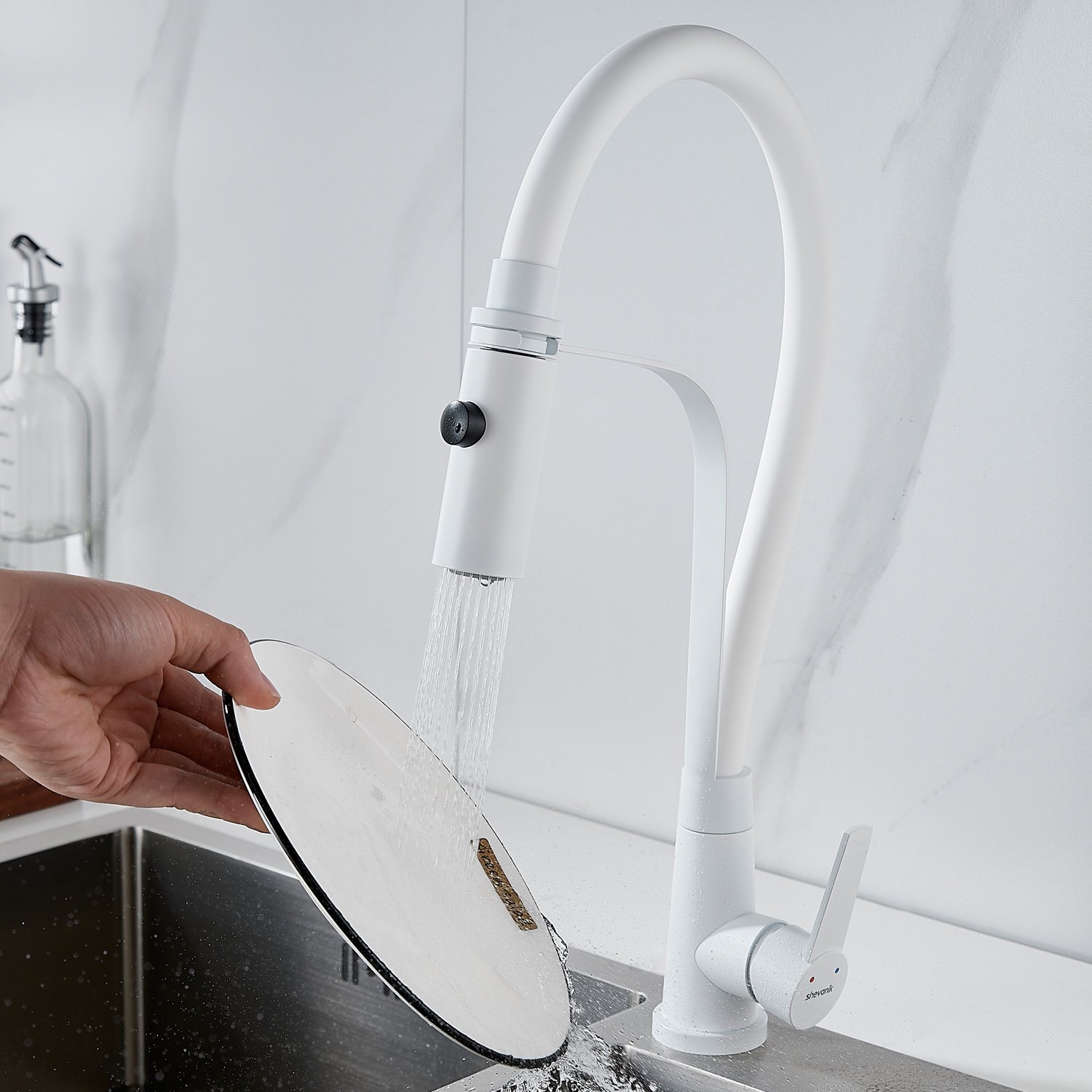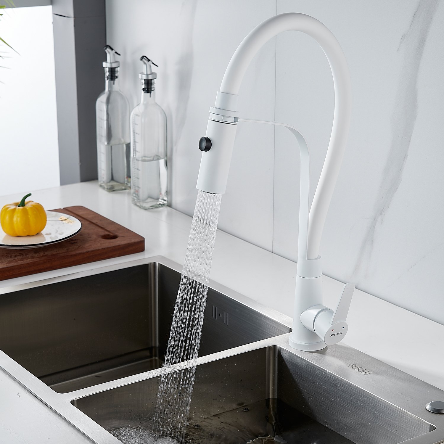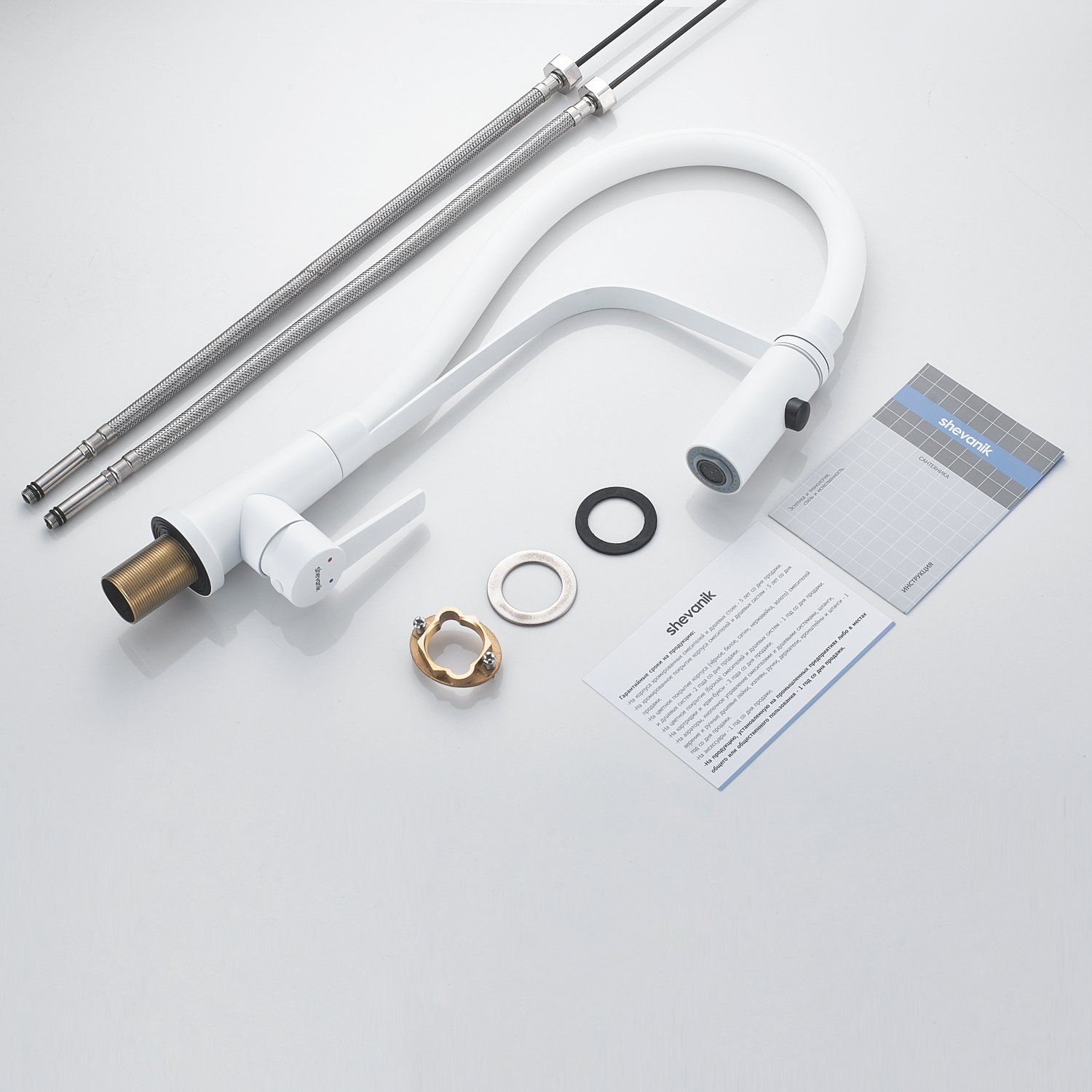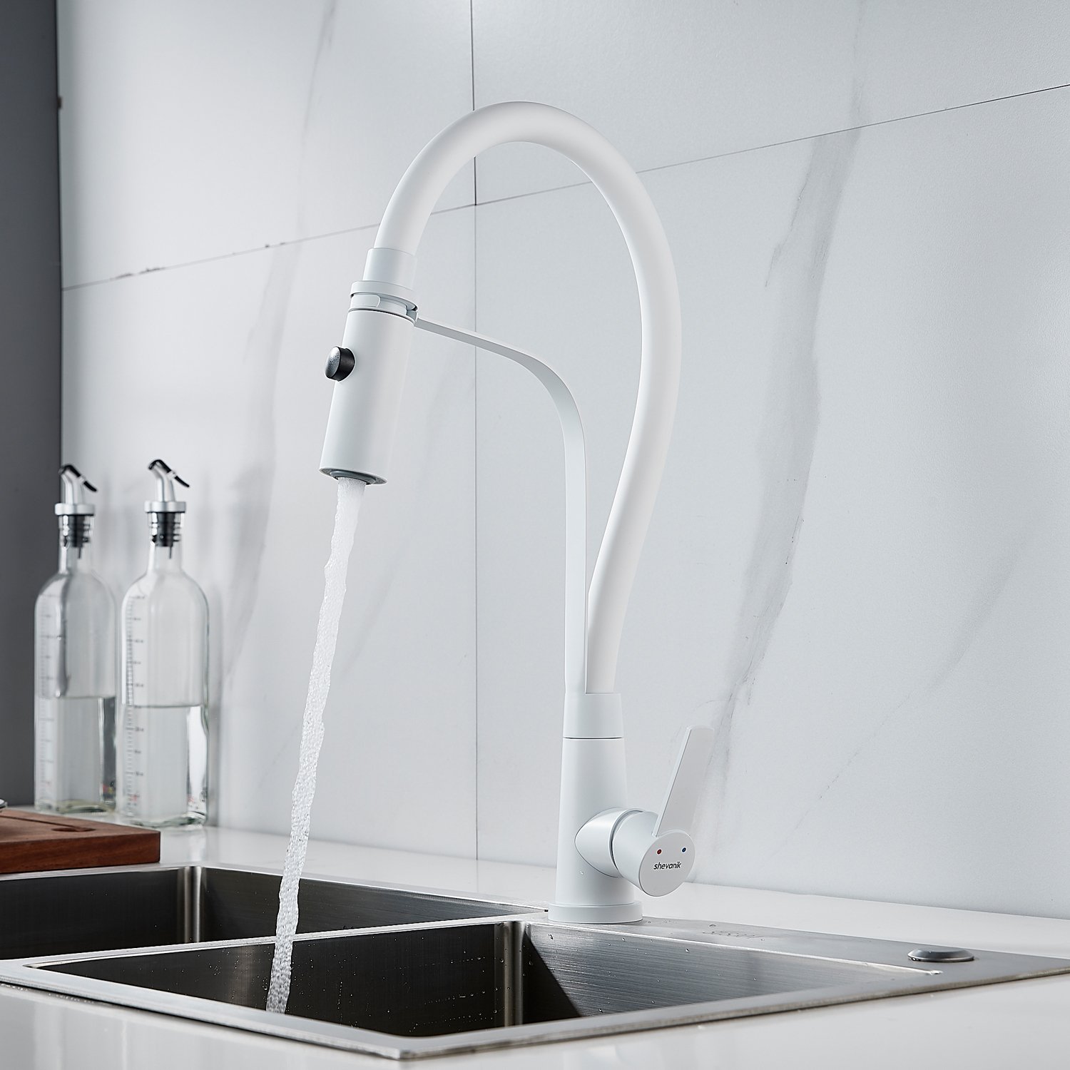 Смеситель для кухни с гибким изливом и режимом "душ" Shevanik S943C-1, белый