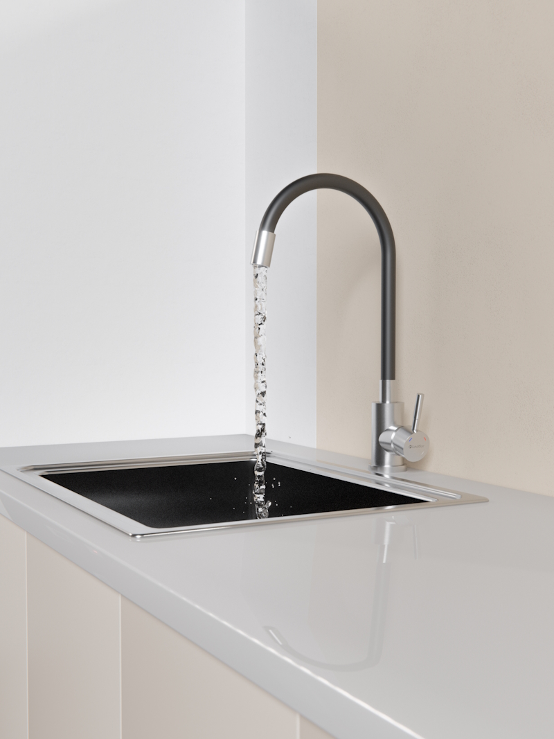 Рычажное управление и керамический картридж гарантируют плавное и точное регулирование напора воды, а поворотный гибкий излив позволяет легко настроить направление струи.