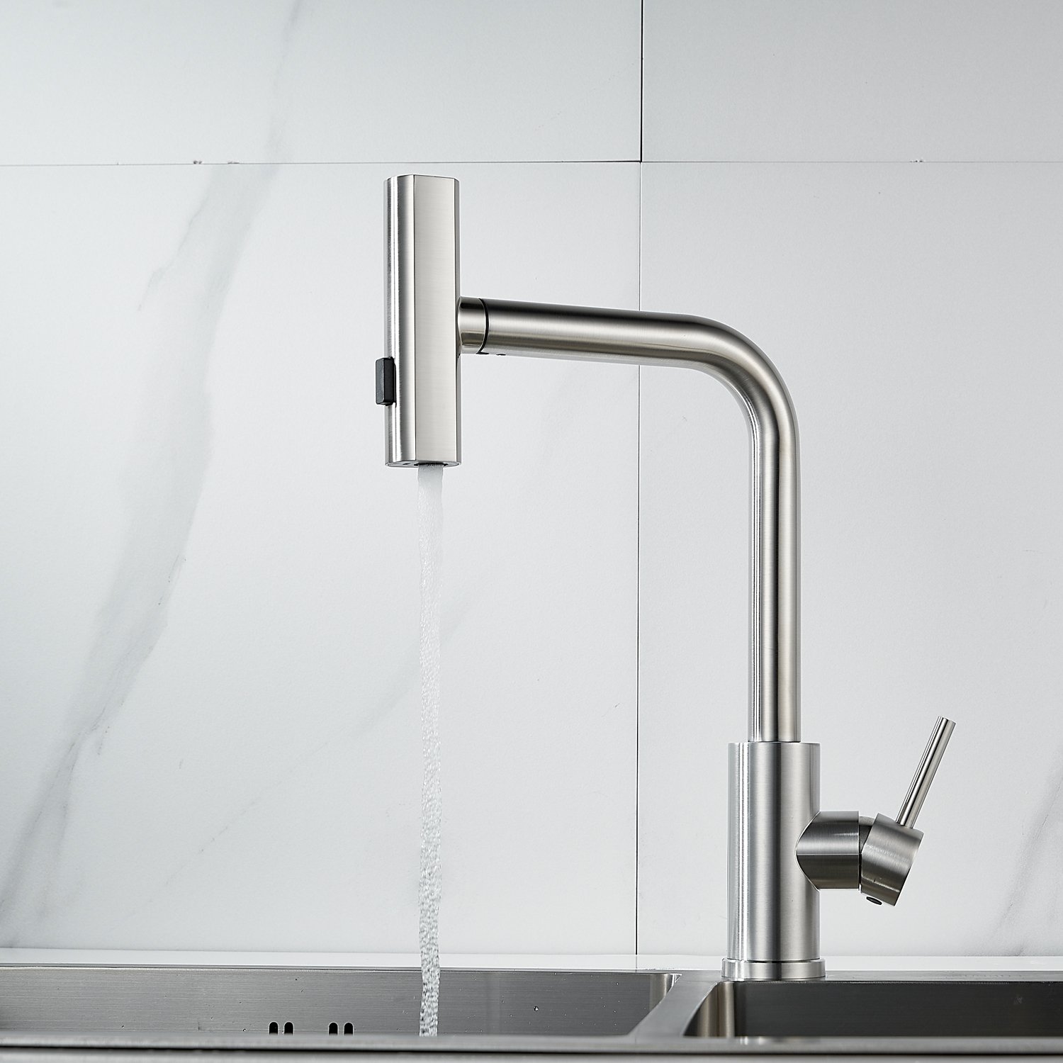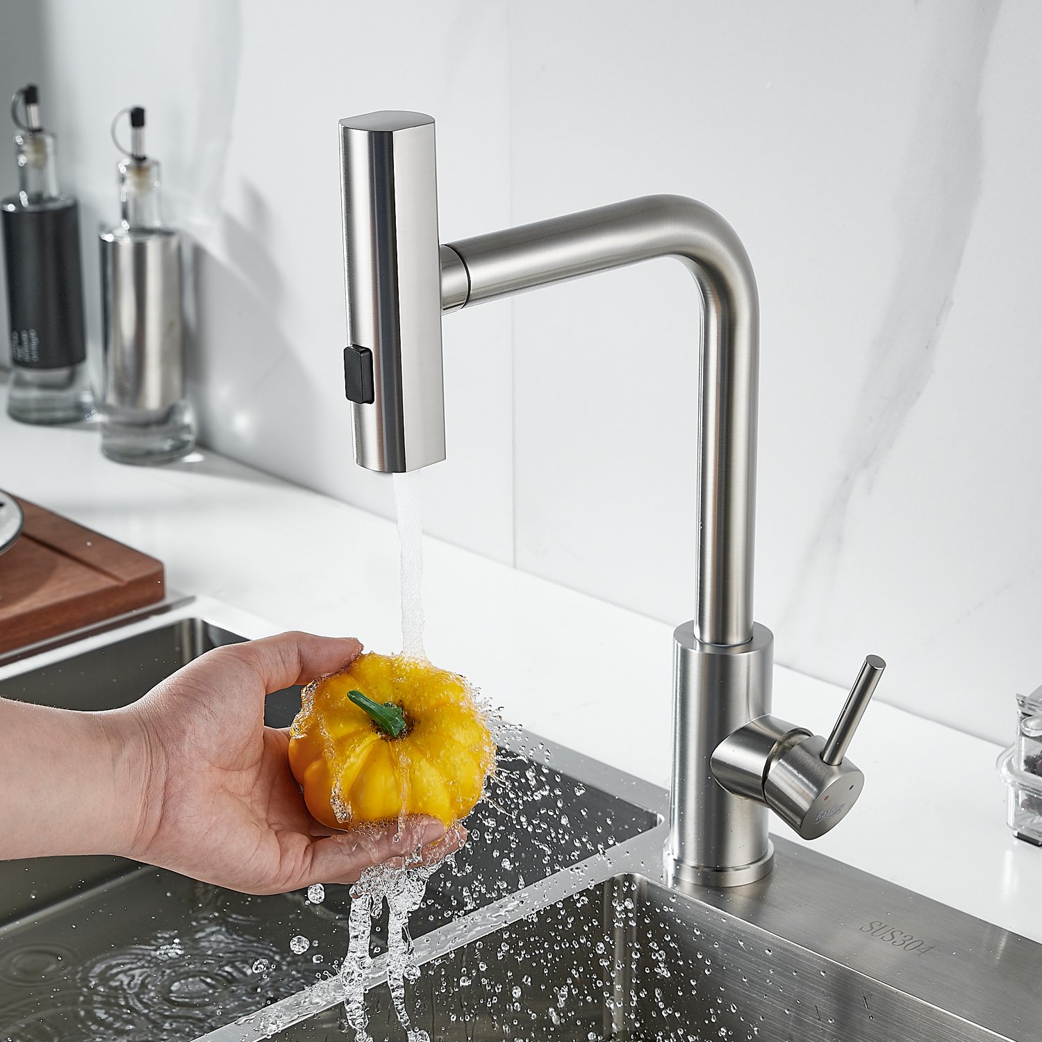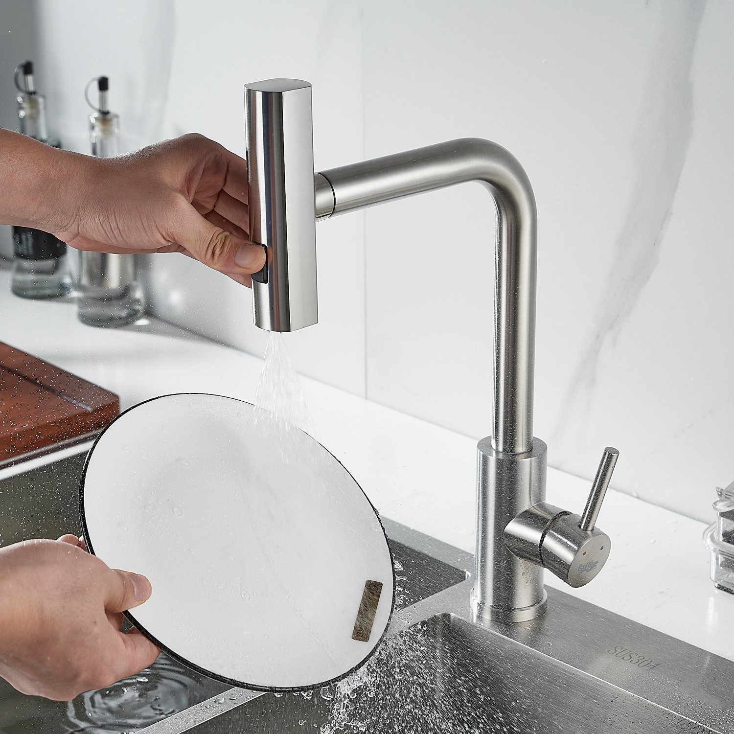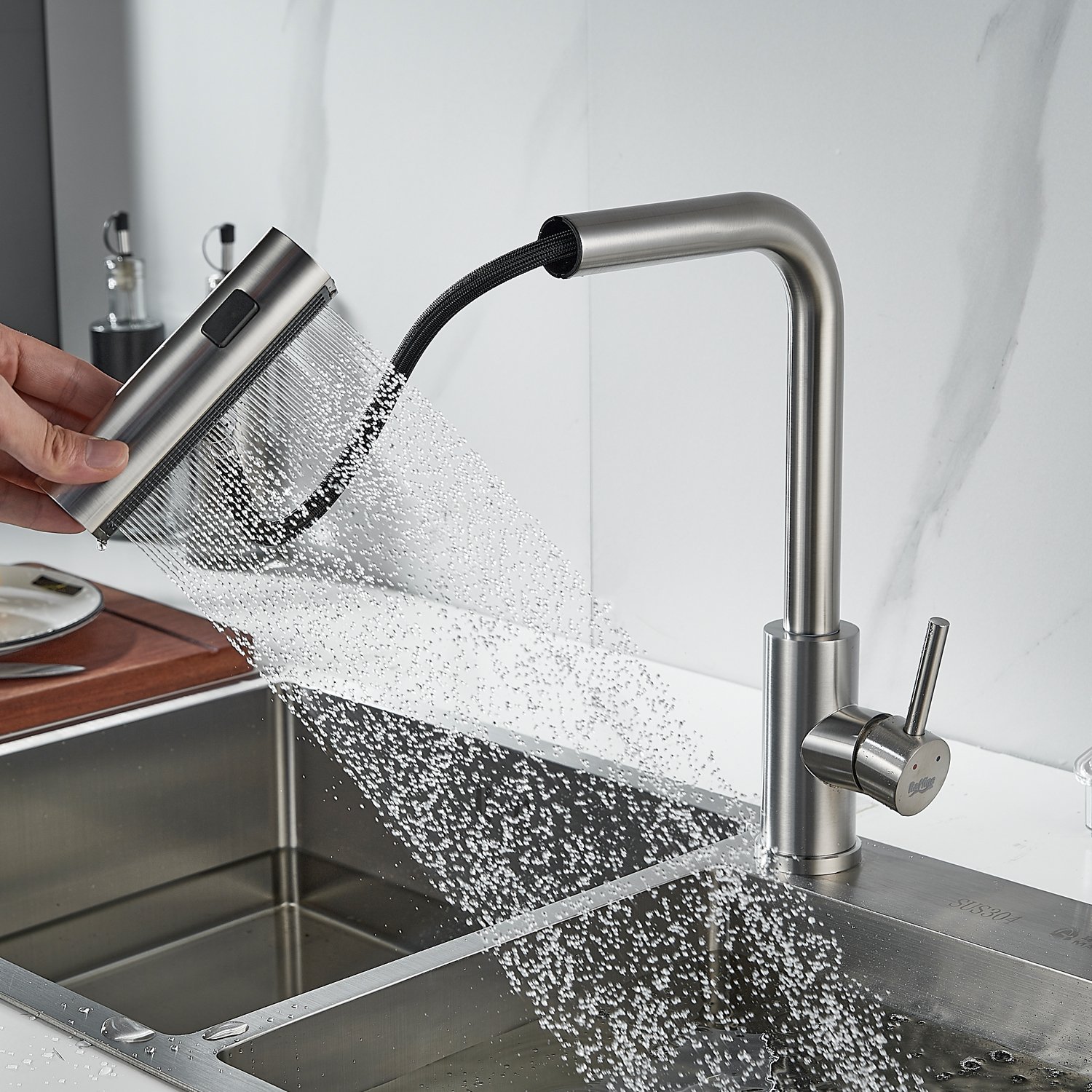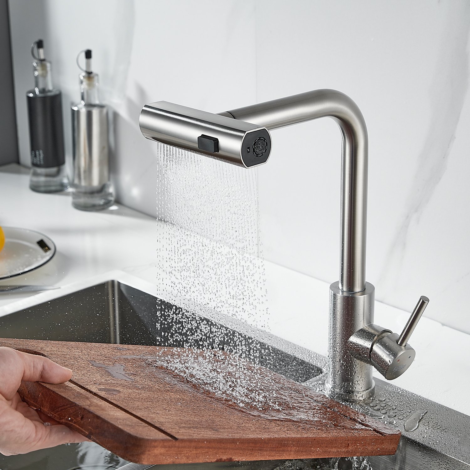 Излив предлагает 3 различных режима подачи воды: стандартный режим подходит для повседневного использования, турбо-струя идеальна для удаления сложных загрязнений, а режим широкой струи с мягким напором идеально подходит для быстрой очистки больших поверхностей, например, кухонной посуды с большим диаметром и разделочных досок.