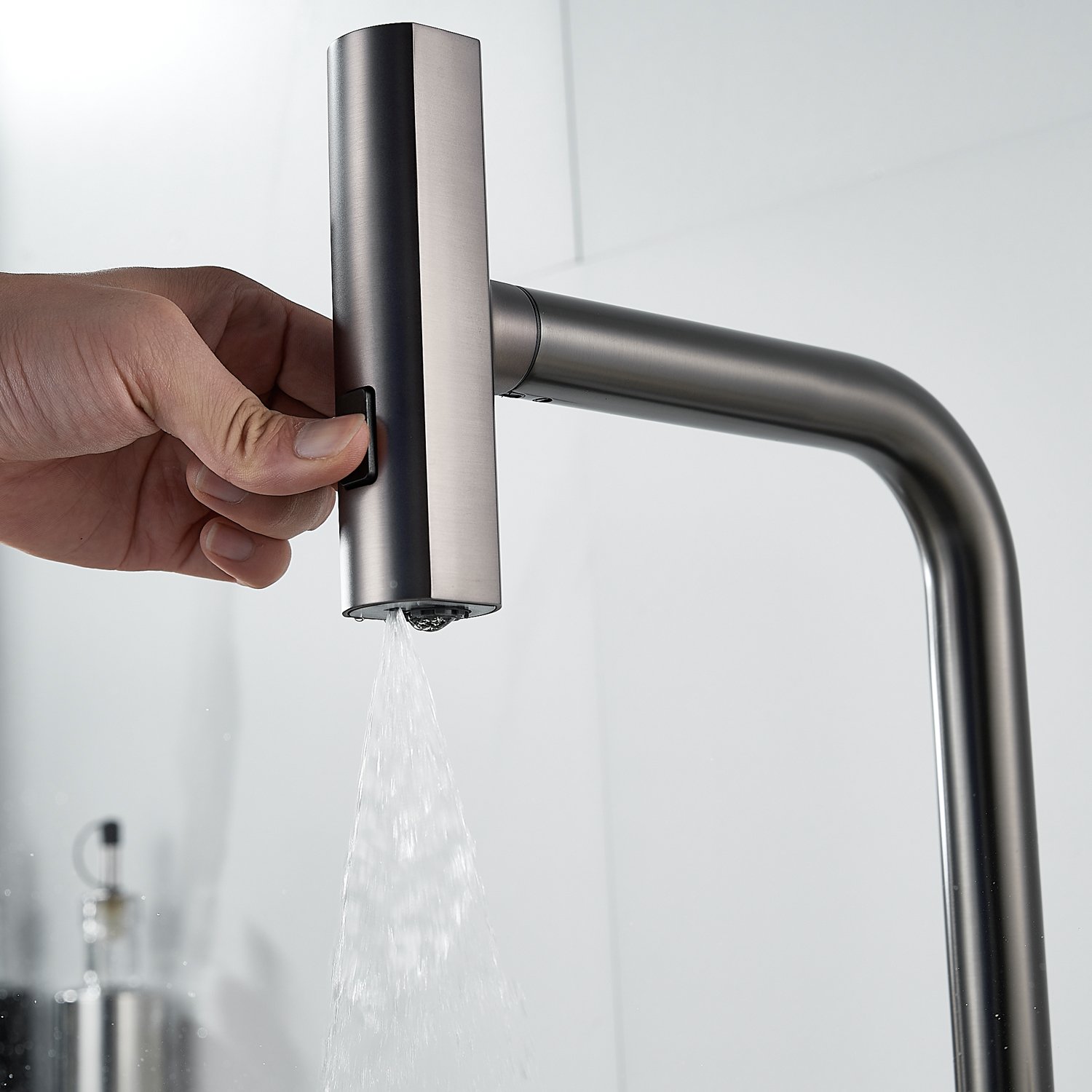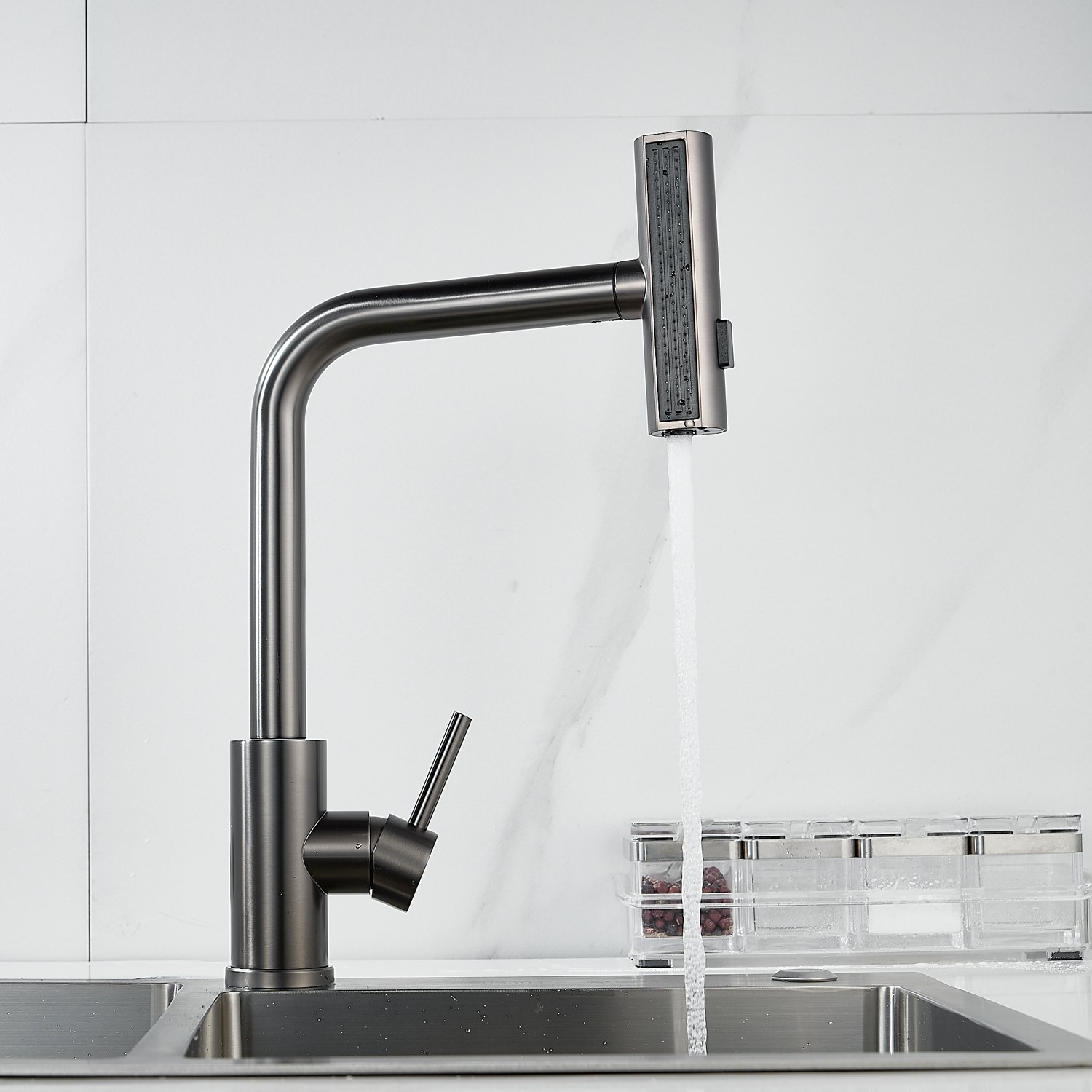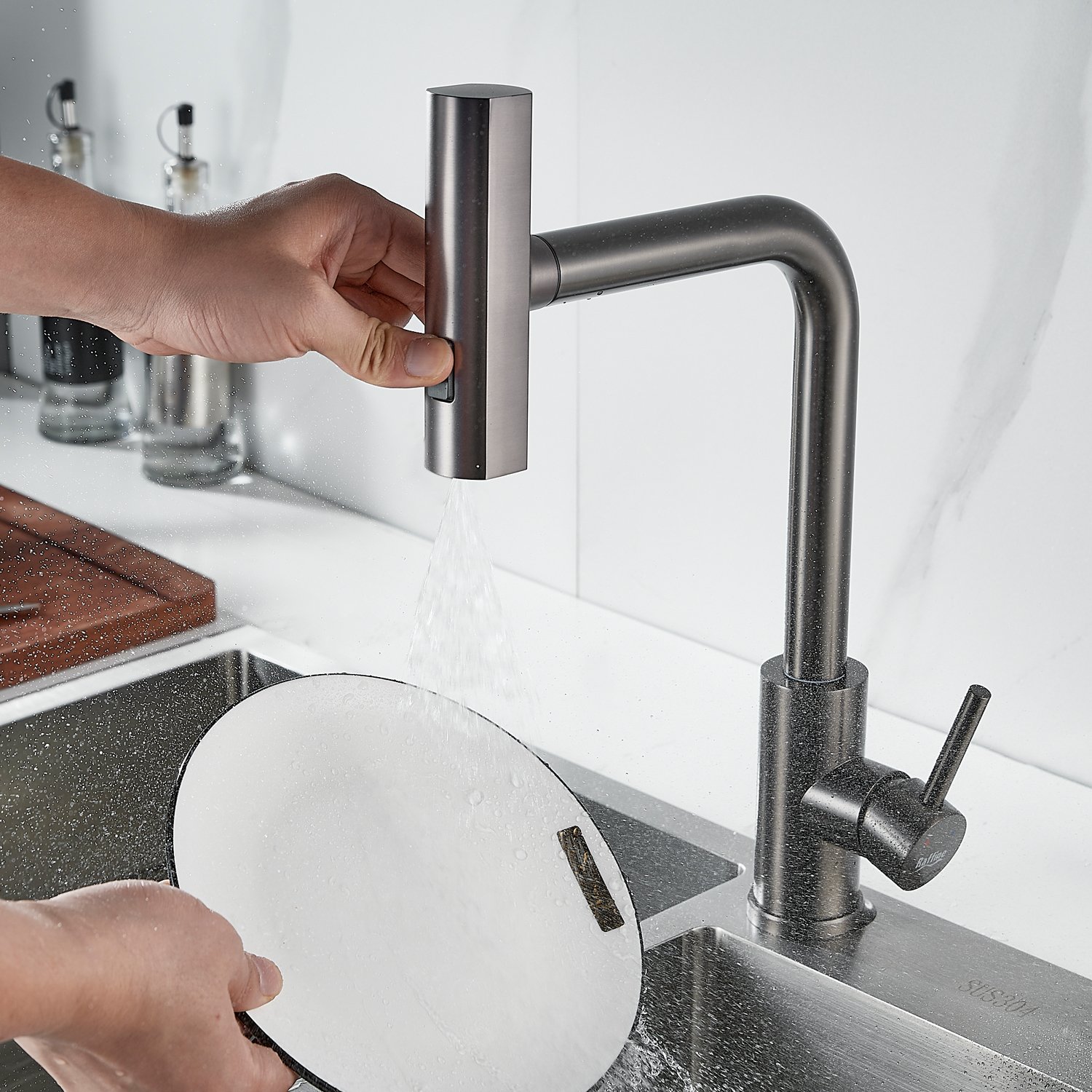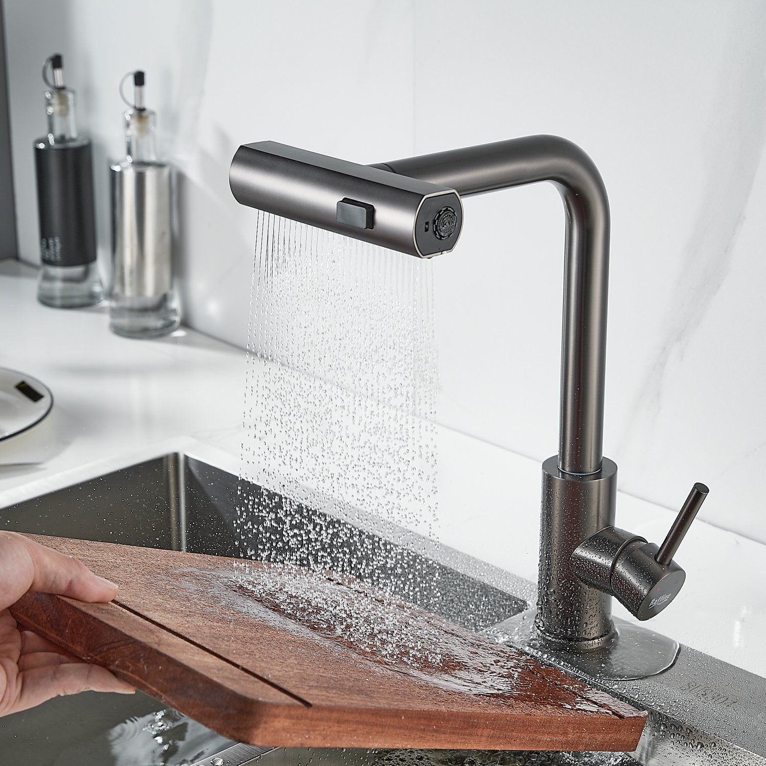Излив предлагает 3 различных режима подачи воды: стандартный режим подходит для повседневного использования, турбо-струя идеальна для удаления сложных загрязнений, а режим широкой струи с мягким напором идеально подходит для быстрой очистки больших поверхностей, например, кухонной посуды с большим диаметром и разделочных досок.