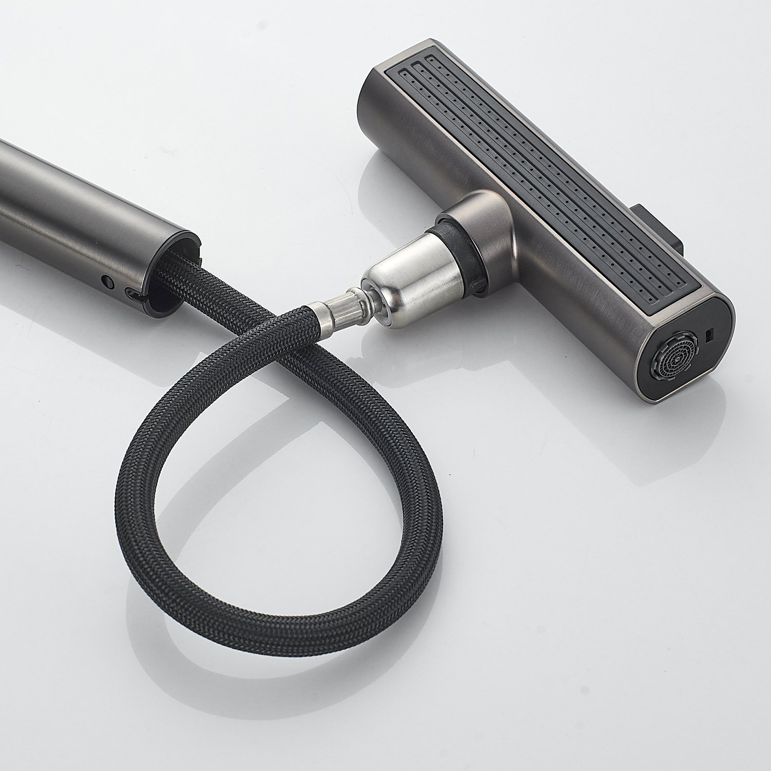 Одним из ключевых преимуществ данного смесителя является съемный выдвижной поворотный излив, который можно легко снять и повернуть в любую сторону. Излив выполнен в том же цвете, что и корпус смесителя, что позволяет ему идеально сочетаться с любым кухонным интерьером.