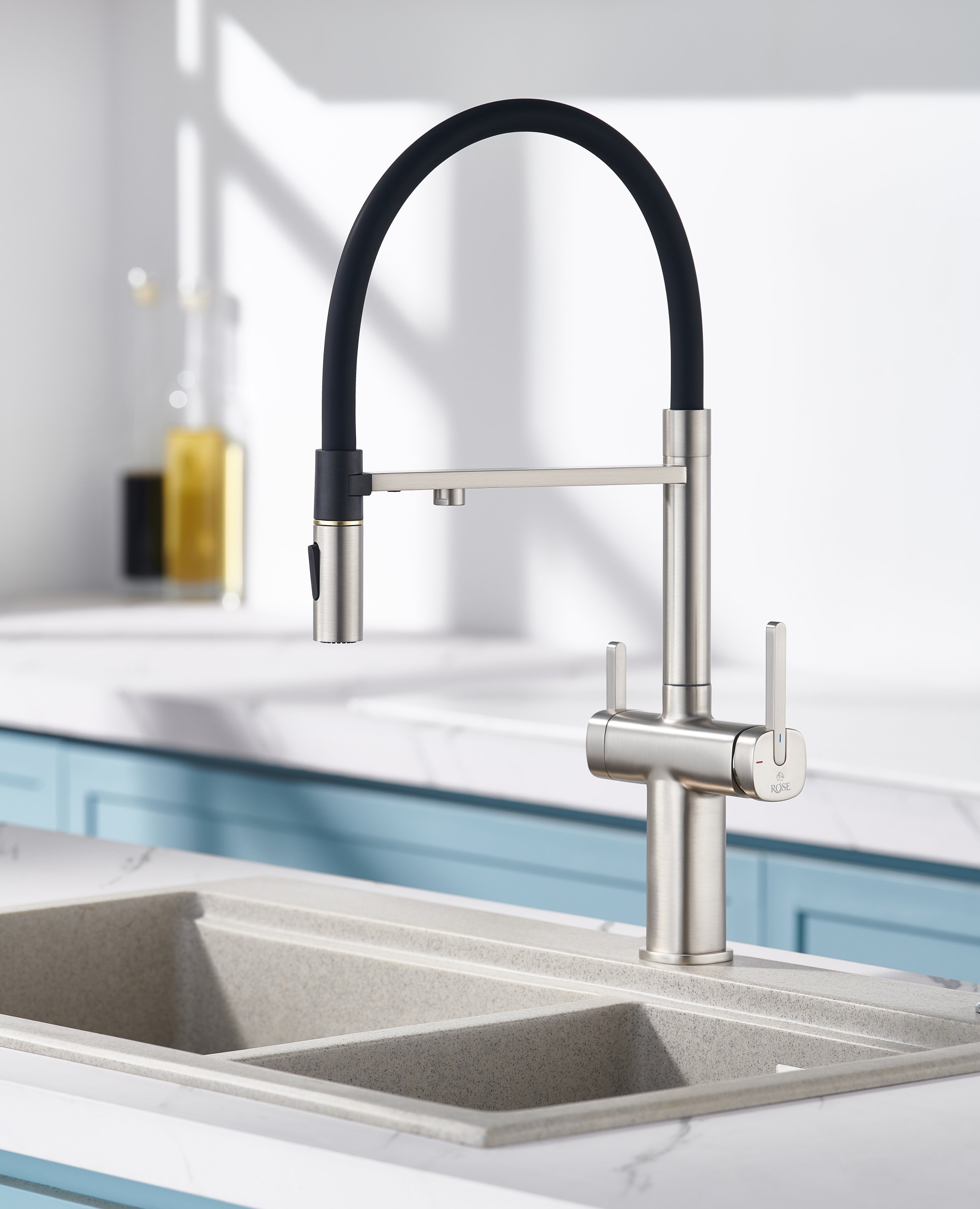 Одним из ключевых преимуществ смесителя Rose является возможность подключения фильтра для воды. Теперь у вас всегда будет доступ к чистой и свежей воде прямо из вашей мойки. Дополнительный излив служит не только для подачи фильтрованной воды, но и как держатель для гибкого излива, когда тот не используется, что добавляет удобства в повседневном использовании.