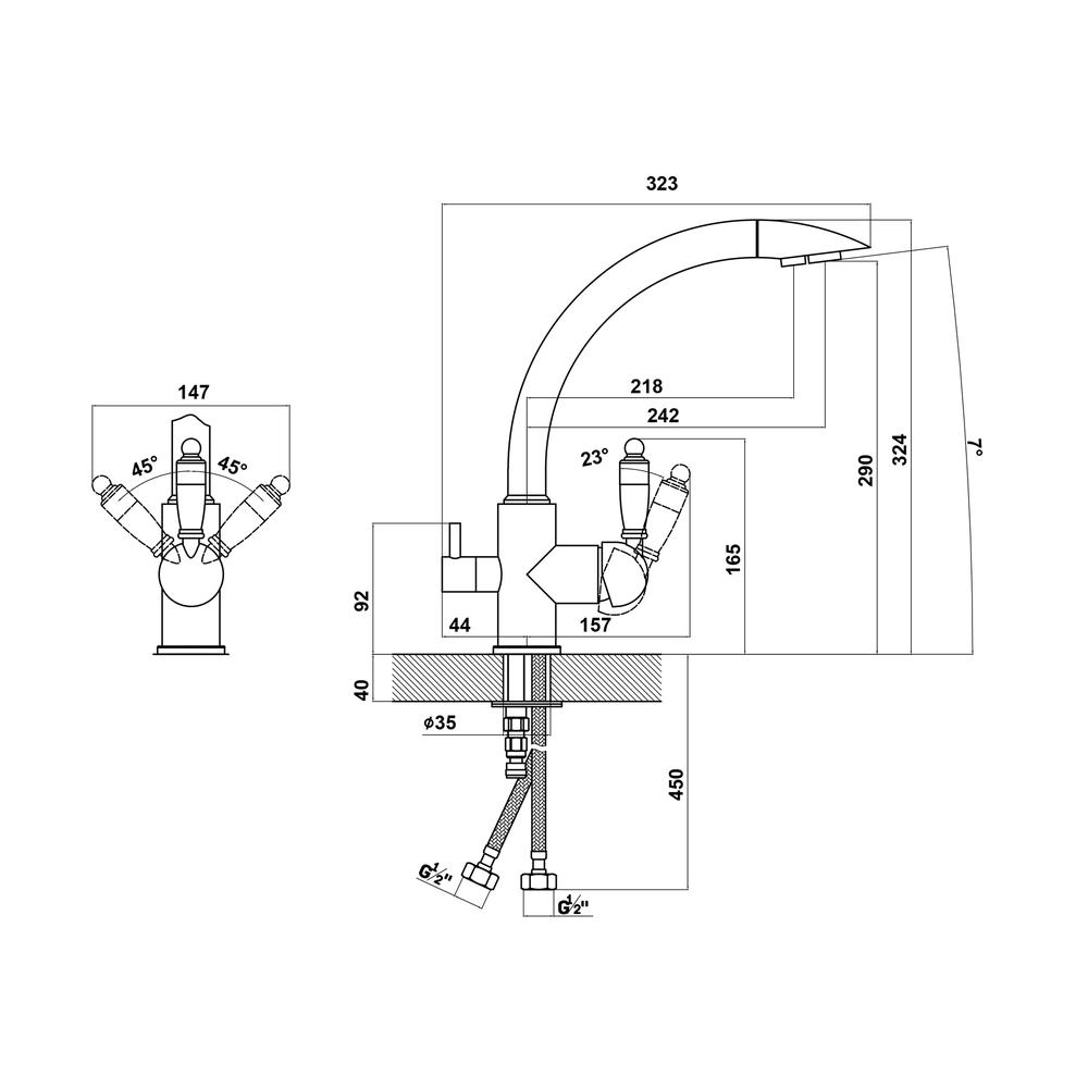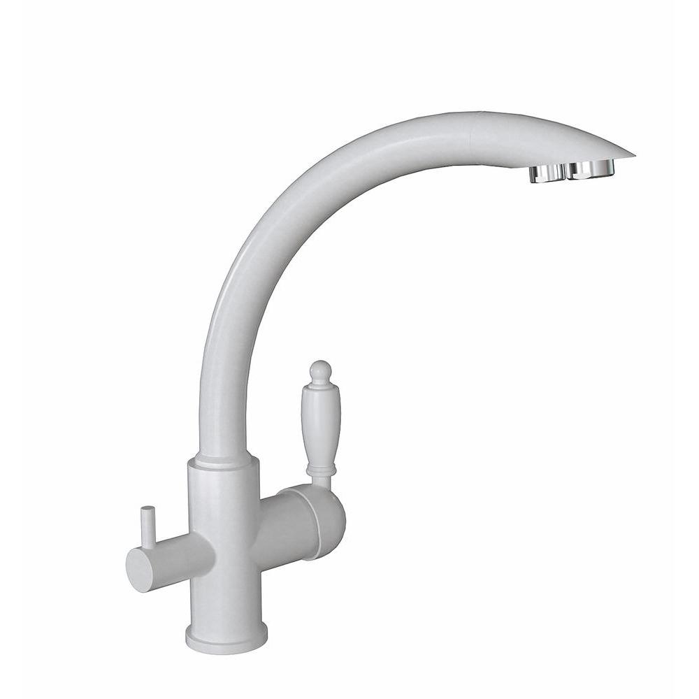 Смеситель однорычажный с подключением к фильтру питьевой воды. Керамические ручки. Материал - латунь. Поворотный излив. Керамический картридж 35мм. Гибкая подводка.