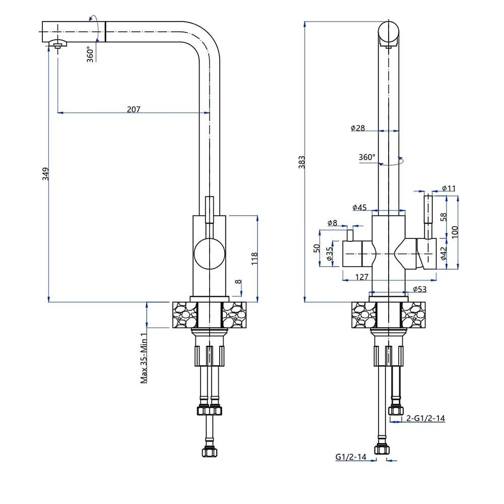 Смеситель для кухни с подключением фильтра GranFest Z-5421, графит. Материал: нержавеющая сталь. Управление: рычажное. Подключение фильтра для воды: да. Гибкая подводка. Отверстия для монтажа: 1.