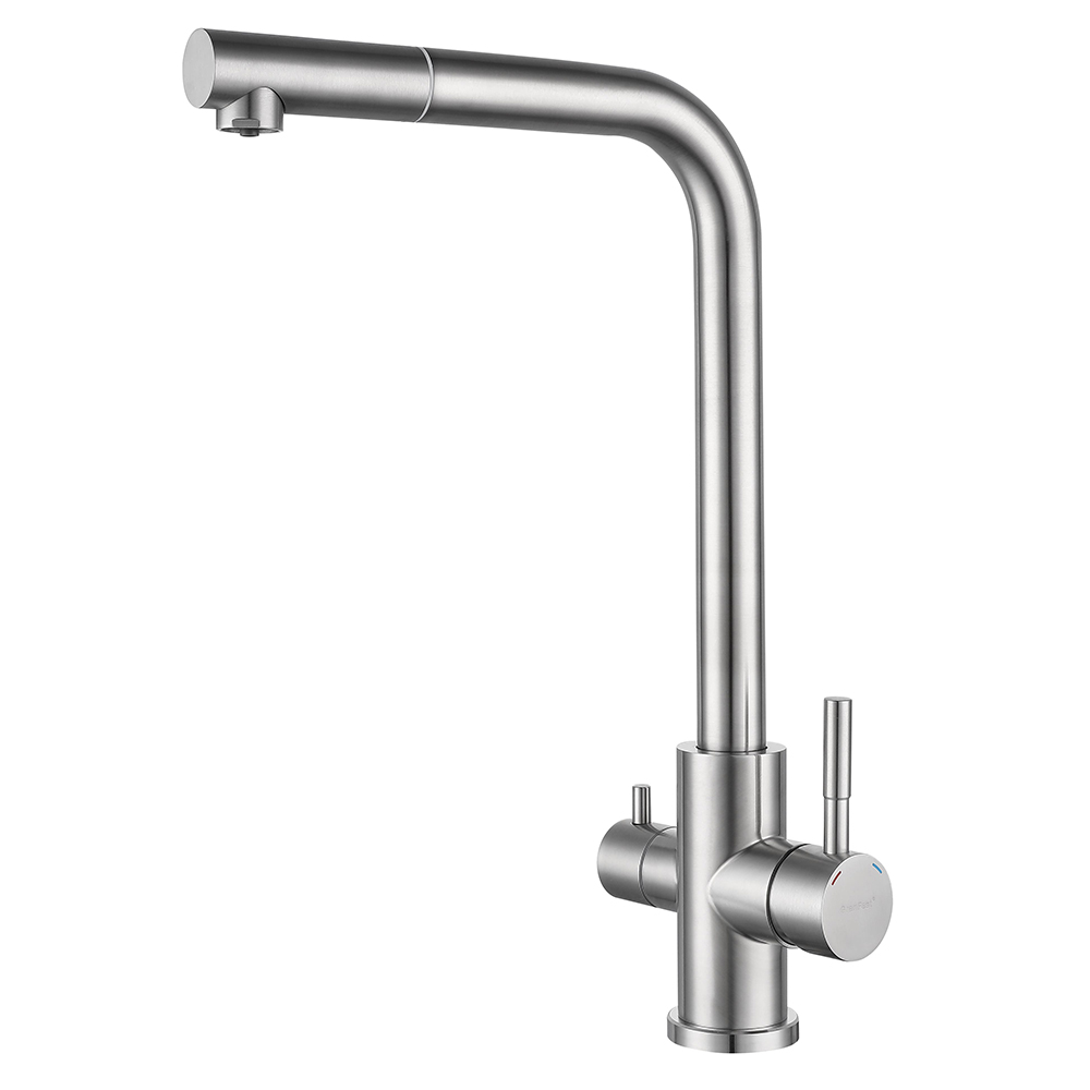 Смеситель для кухни с подключением фильтра GranFest Z-5421, нержавейка. Материал: нержавеющая сталь. Управление: рычажное. Подключение фильтра для воды: да. Гибкая подводка. Отверстия для монтажа: 1.