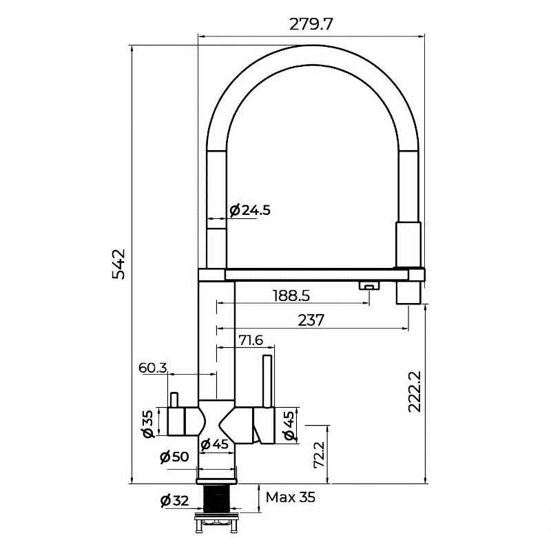 Дополнительный излив служит не только для подачи фильтрованной воды, но и как держатель для гибкого излива, когда тот не используется, что добавляет удобства в повседневном использовании.