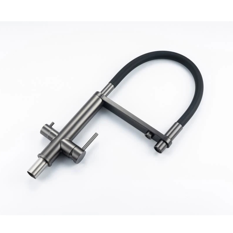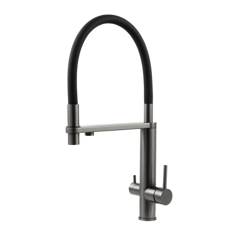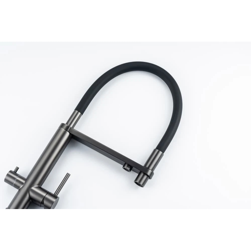 Современный смеситель с гибким изливом и функцией фильтрации. Практичность и эффектный дизайн: оттенок "вороненая сталь" дополнит кухню в стиле лофт.