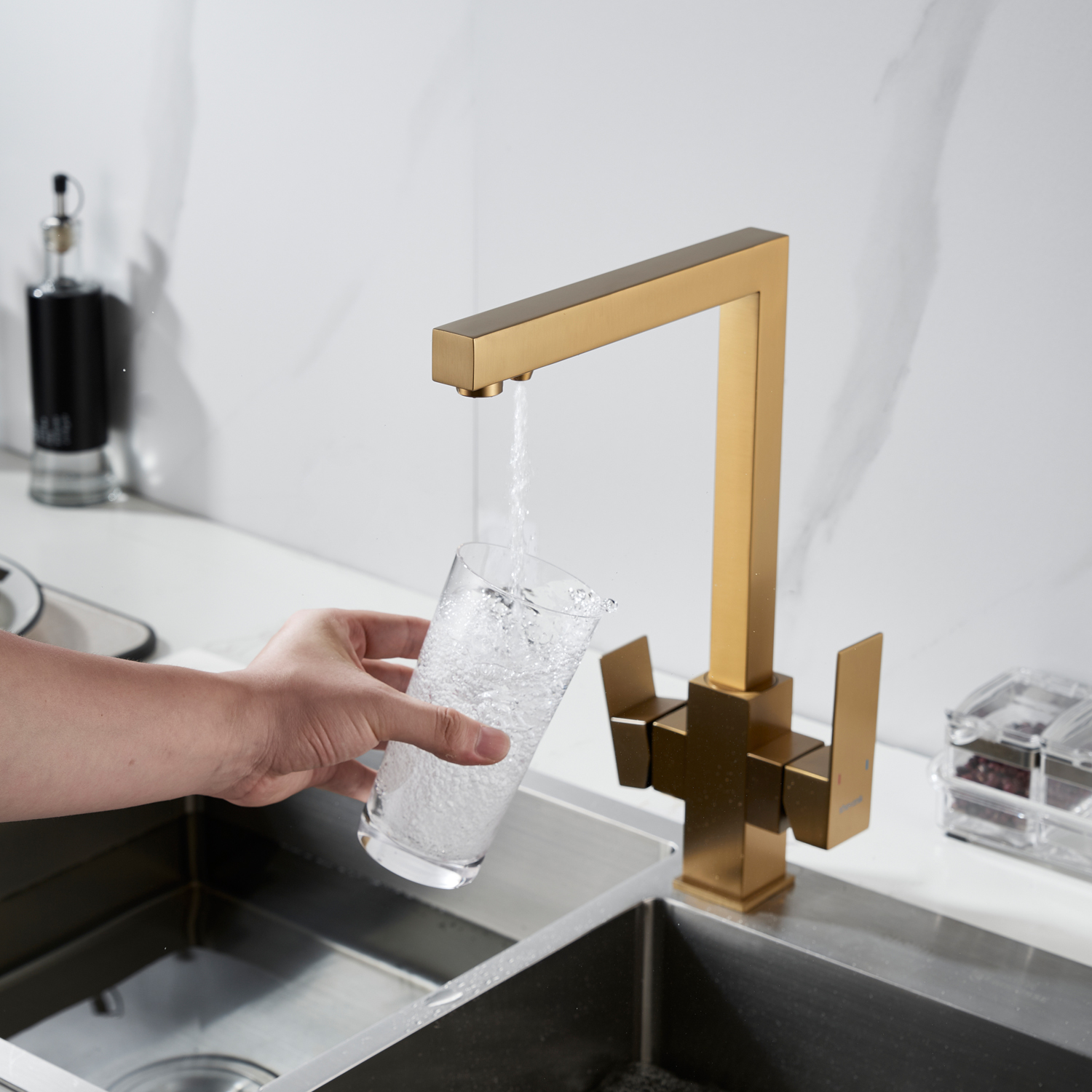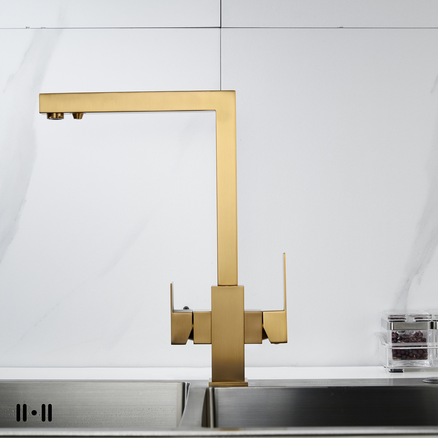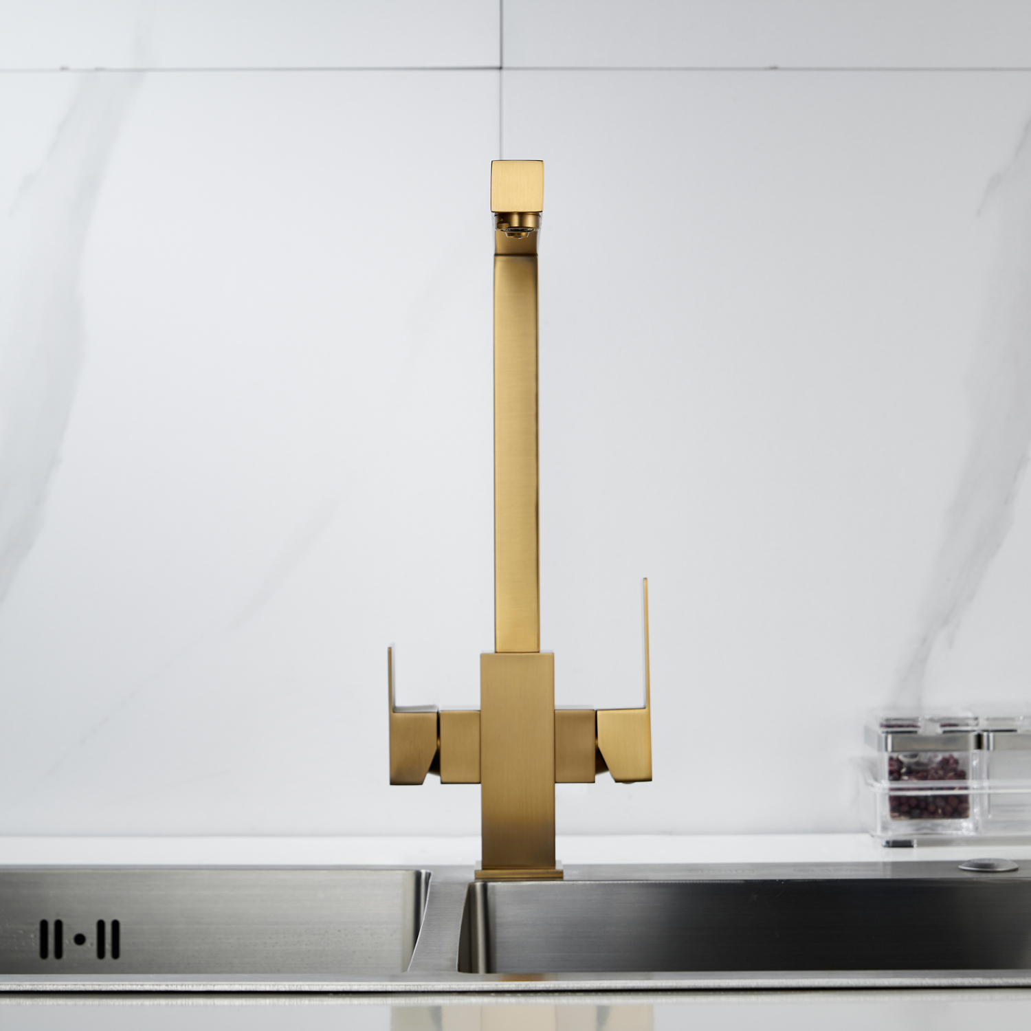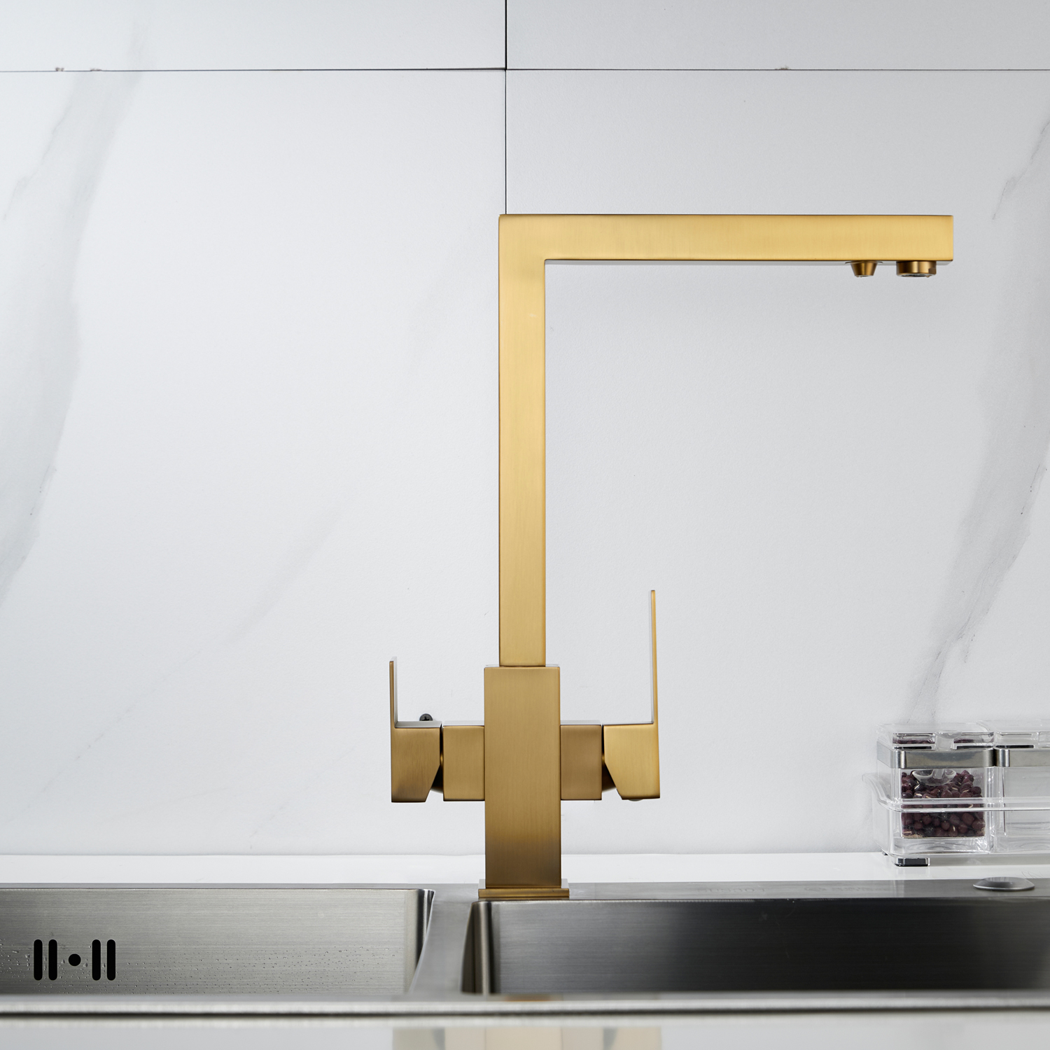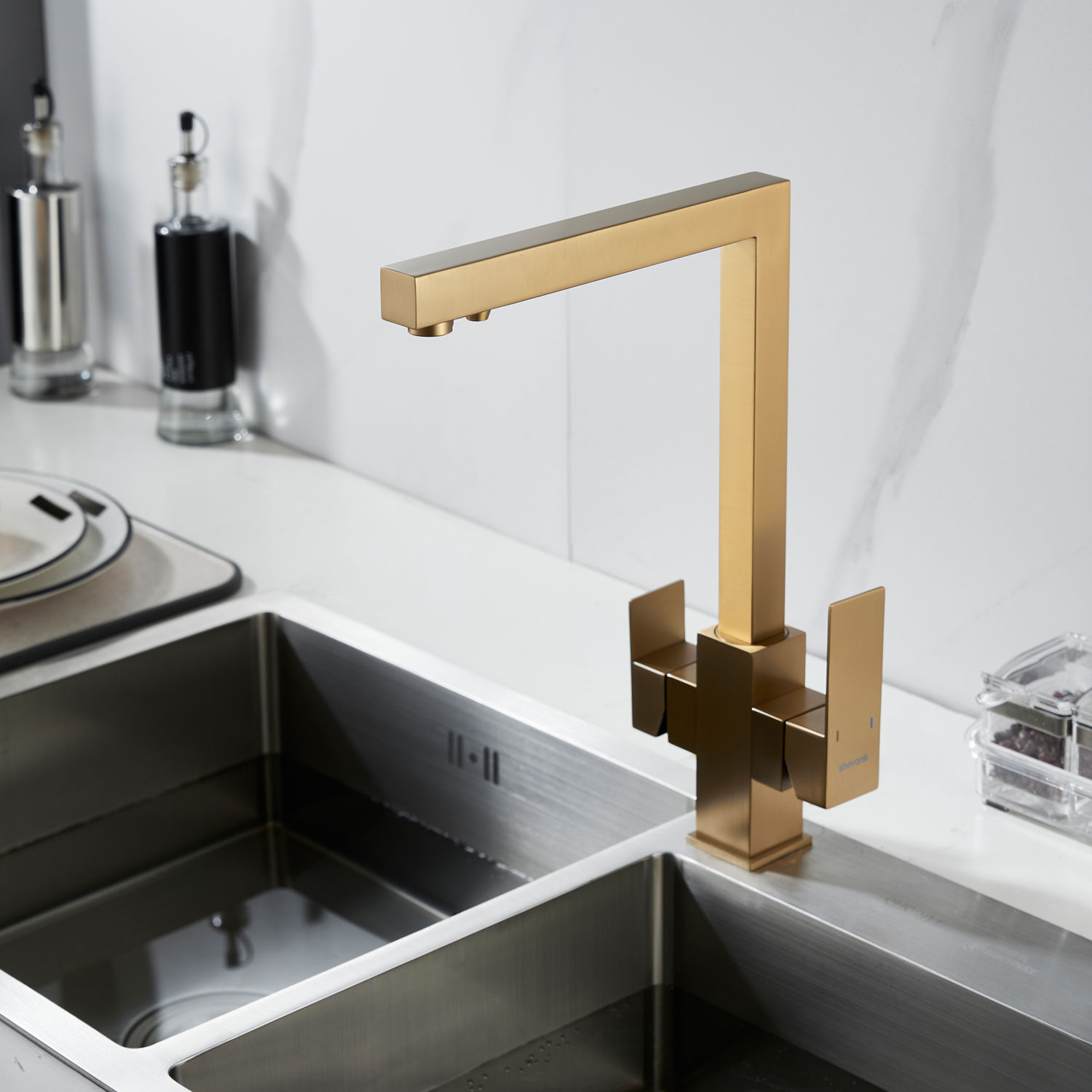 Смеситель для кухни Shevanik S148G в цвете "золотой сатин" — это современное решение для тех, кто хочет сочетать стиль, функциональность и заботу о здоровье. Его корпус из прочной нержавеющей стали выдерживает ежедневные нагрузки, сохраняя безупречный вид даже спустя годы, а угловатый, лаконичный дизайн придаёт кухне строгой выразительности и технологичного шарма, идеально вписываясь в современные интерьеры. Управление осуществляется с помощью одного рычага и надёжного керамического картриджа, обеспечивающего плавное регулирование температуры и напора без протечек.