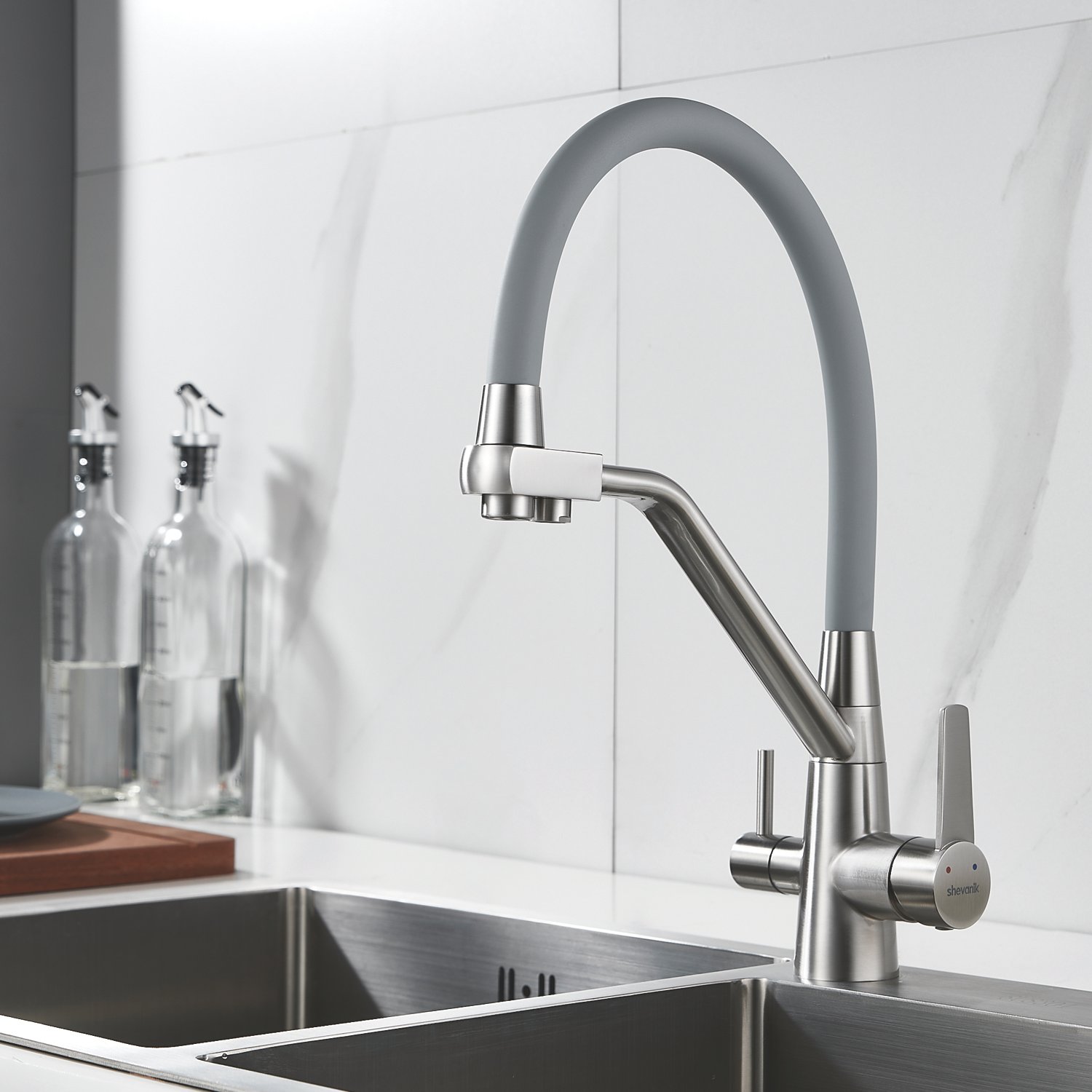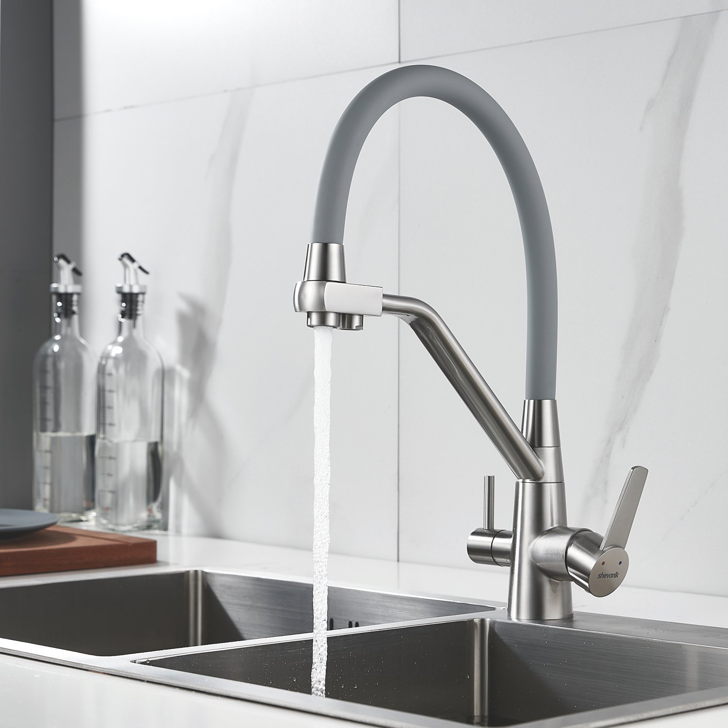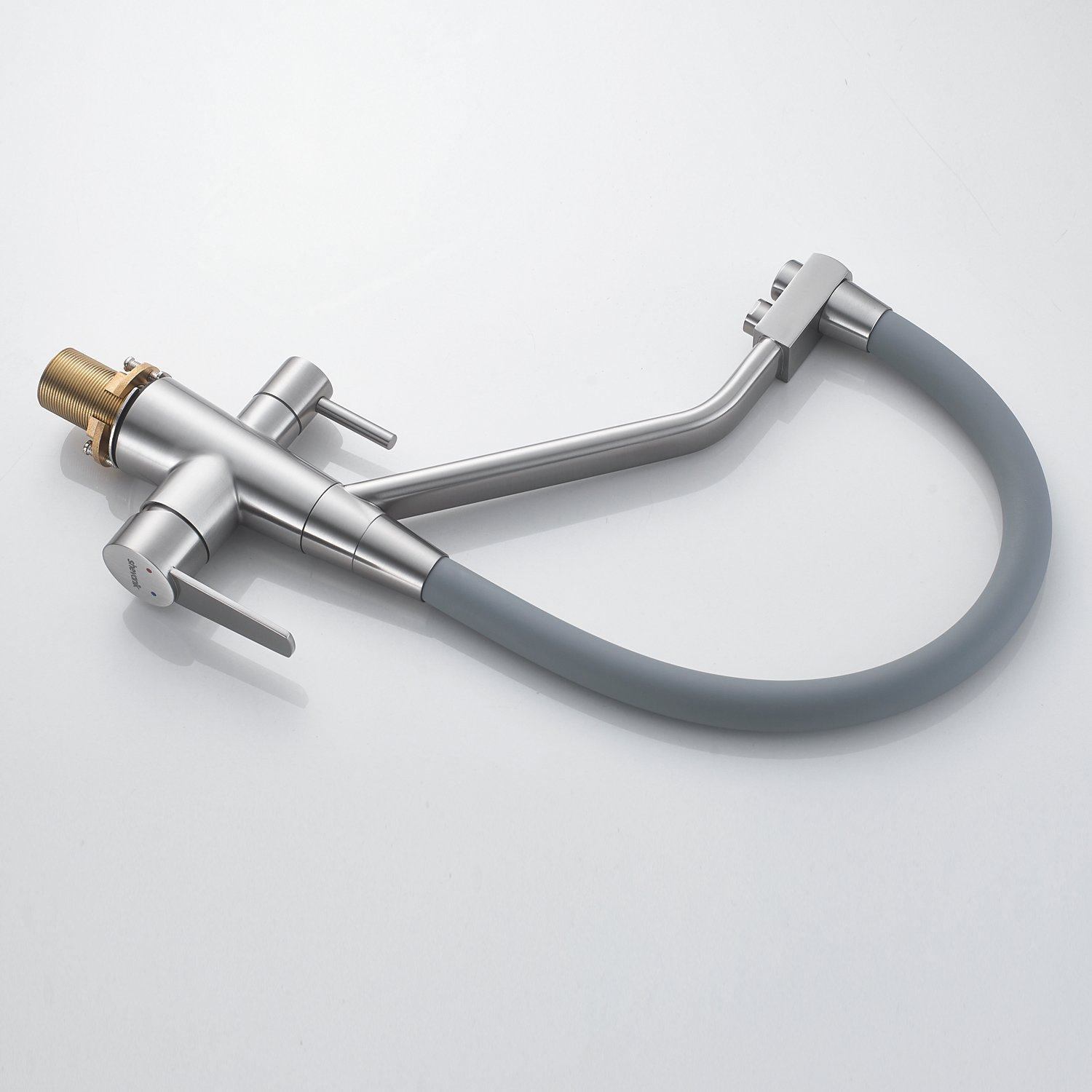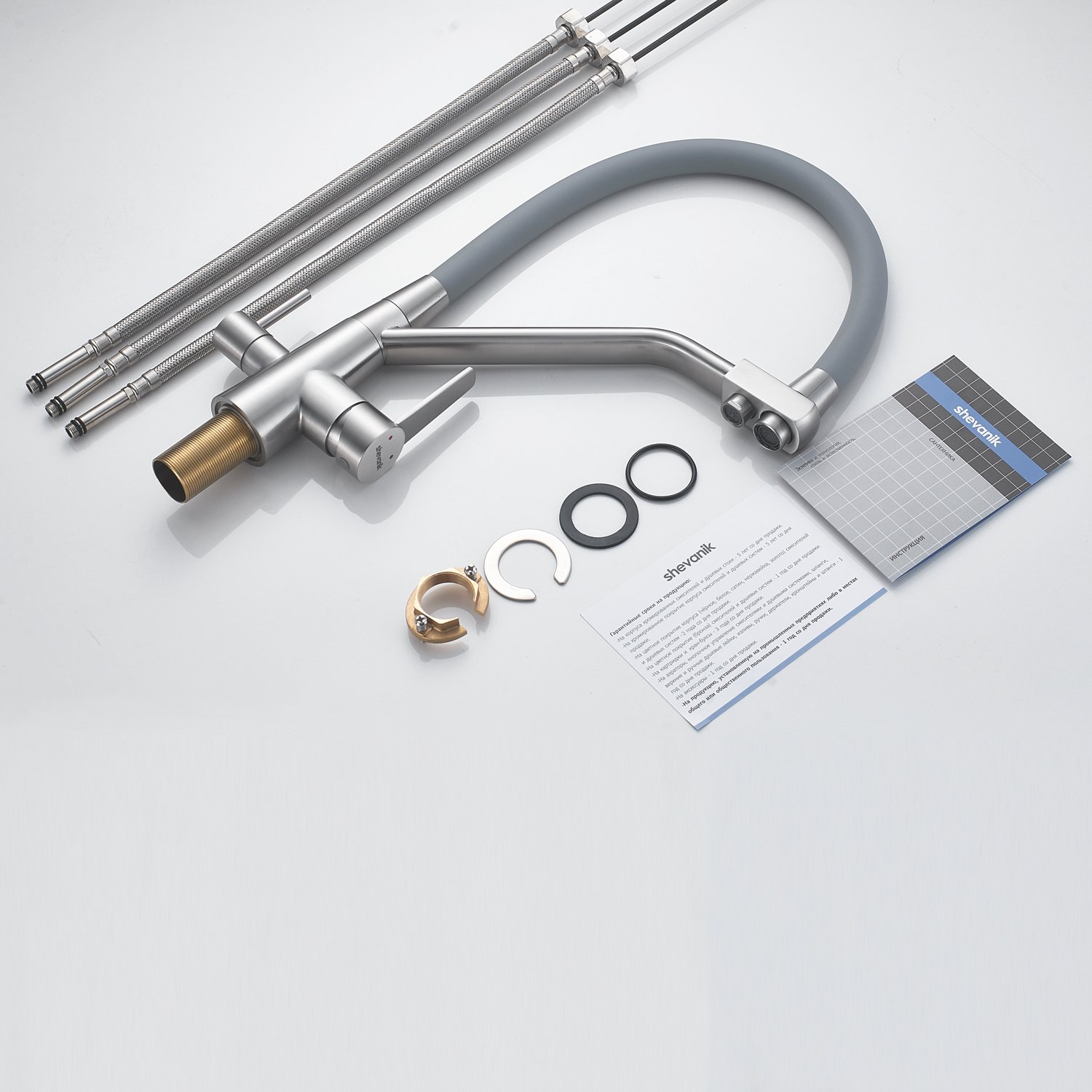 Смеситель для кухонной мойки Shevanik - идеальное решение для вашей кухни! Изготовленный из латуни, он гарантирует долговечность и стабильность на многие годы. Гибкий поворотный силиконовый излив обеспечивает максимальный комфорт при использовании, позволяя легко настроить струю воды под ваши нужды.