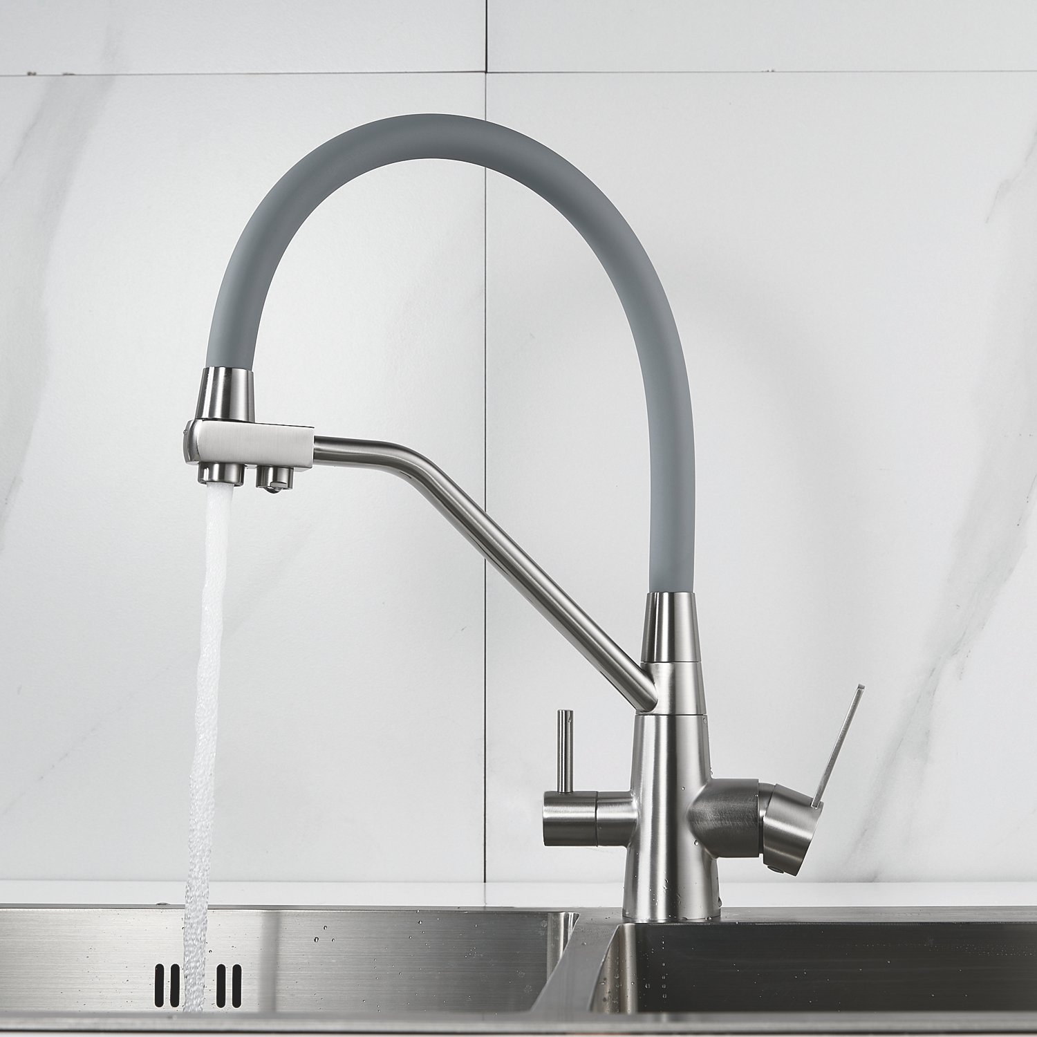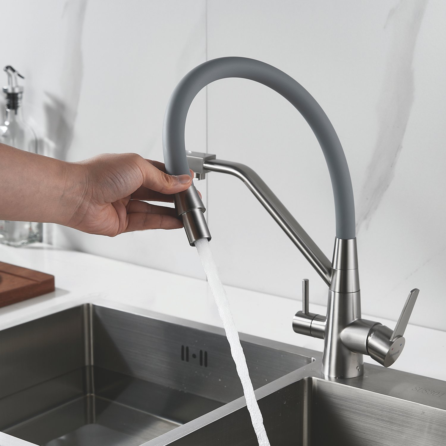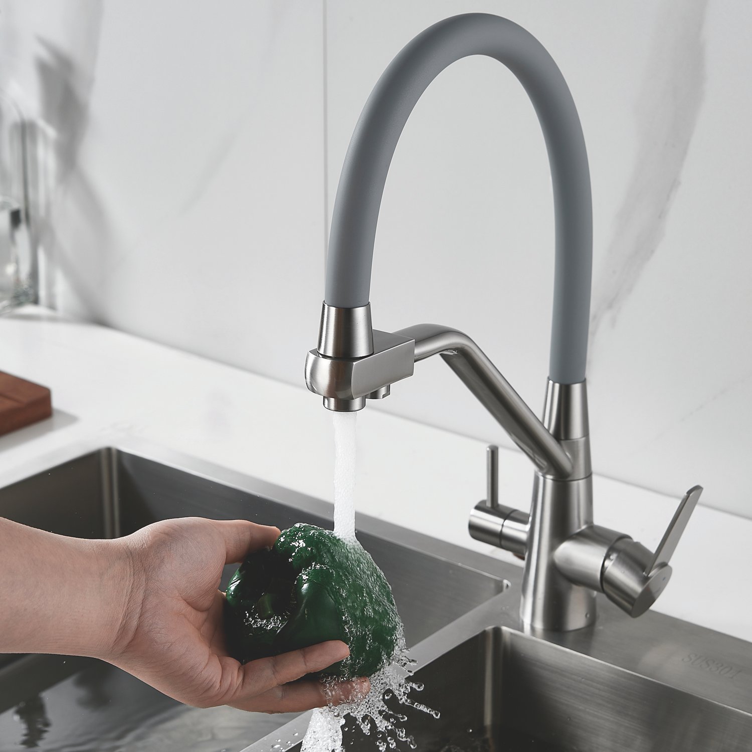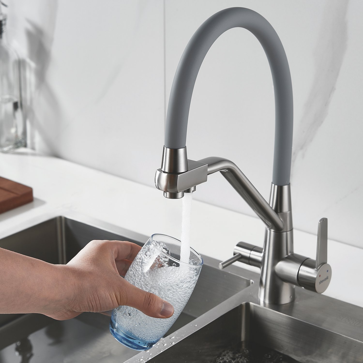 Одним из ключевых преимуществ смесителя Shevanik является возможность подключения фильтра для воды. Теперь у вас всегда будет доступ к чистой и свежей воде прямо из вашей мойки. Дополнительный излив служит не только для подачи фильтрованной воды, но и как держатель для гибкого излива, когда тот не используется, что добавляет удобства в повседневном использовании.