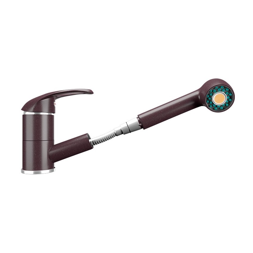 ULGRAN U-002 - кухонный смеситель с низким выдвижным изливом, имеющий два режима подачи воды: "стандартный" и "режим душ". Конструкция излива с выдвижным механизмом специально разработана для удобства мытья труднодоступных мест и негабаритной посуды (кастрюлей и сковород любой конфигурации), не прибегая к дополнительным ухищрениям. Также это хорошее решение для больших кухонных моек и моек с двумя чашами (двойных). Материал корпуса выполнен из высококачественной латуни, а окрашивание под "искусственный камень" в цвет мойки ULGRAN выполняется на собственном производстве, что позволяет идеально попасть в фирменный цвет ULGRAN. В качестве керамического картриджа используется известный бренд Wanhai диаметром 40 мм с высокой пропускной способностью в 500 тысяч циклов "открывания-закрывания". На подвижные части картриджа Wanhai нанесена специальная невымываемая силиконовая смазка, а керамические пластины изготовлены из 96% оксида алюминия, что, в сочетании с высоким качеством шлифовки обеспечивает долговечность, надежность, плавность хода рукоятки. Смеситель оборудован съемным пластиковым аэратором для экономии воды и поворотным изливом на 360 градусов. В комплектацию входят: керамический картридж Wanhai, гибкая подводка 450 мм, комплект крепежных элементов, выдвижная лейка с двумя режимами струи, технический паспорт и гарантийный талон. Заводская гарантия составляет 3 года на материал корпуса, 1 год на комплектующие к смесителю и 1 год на материал покрытия.