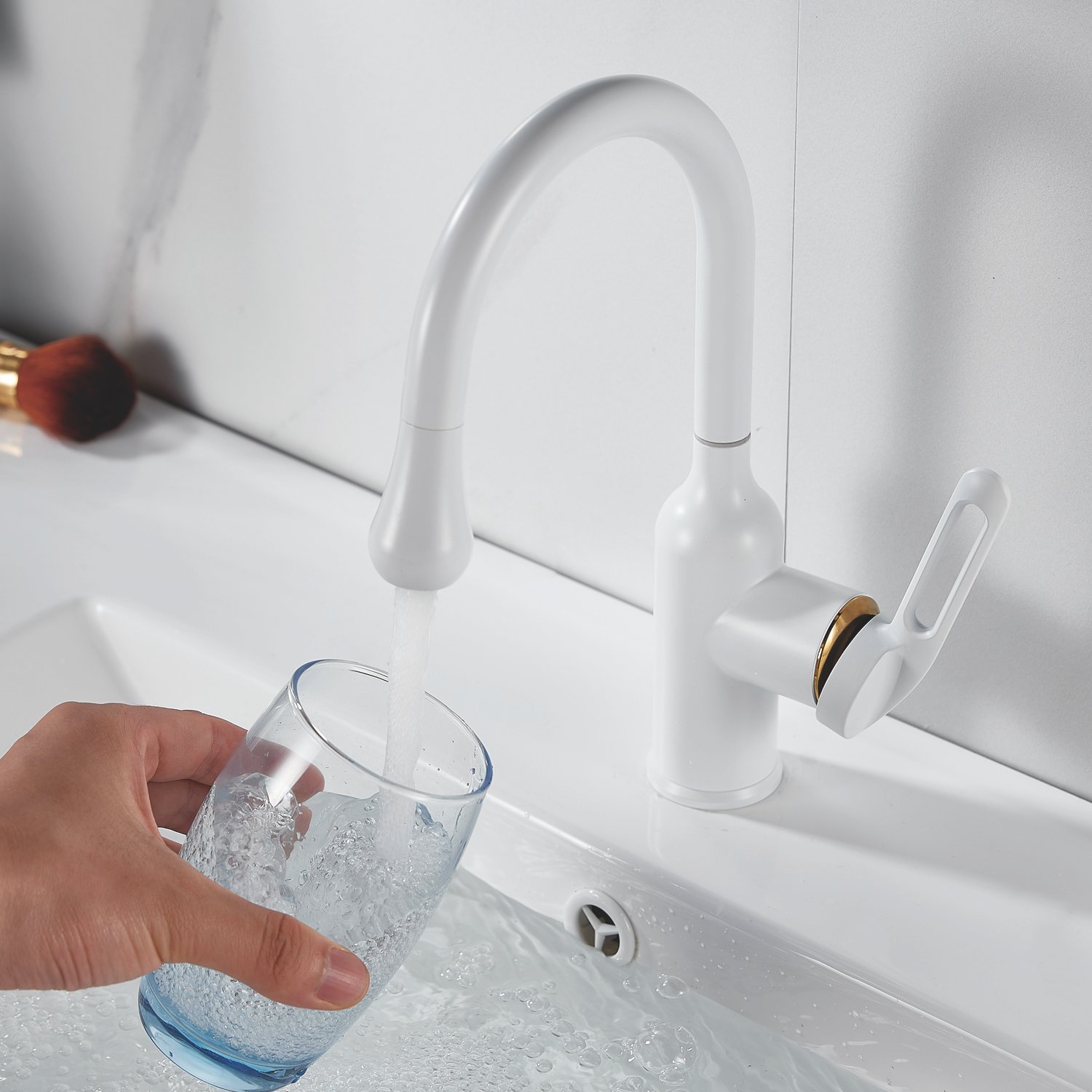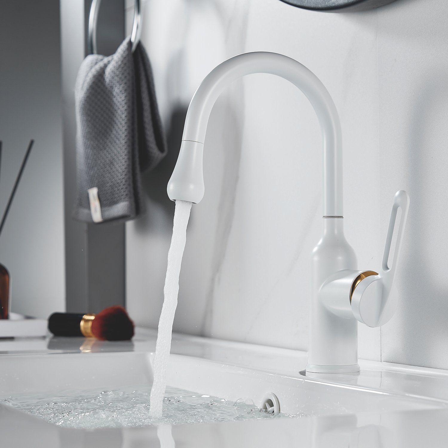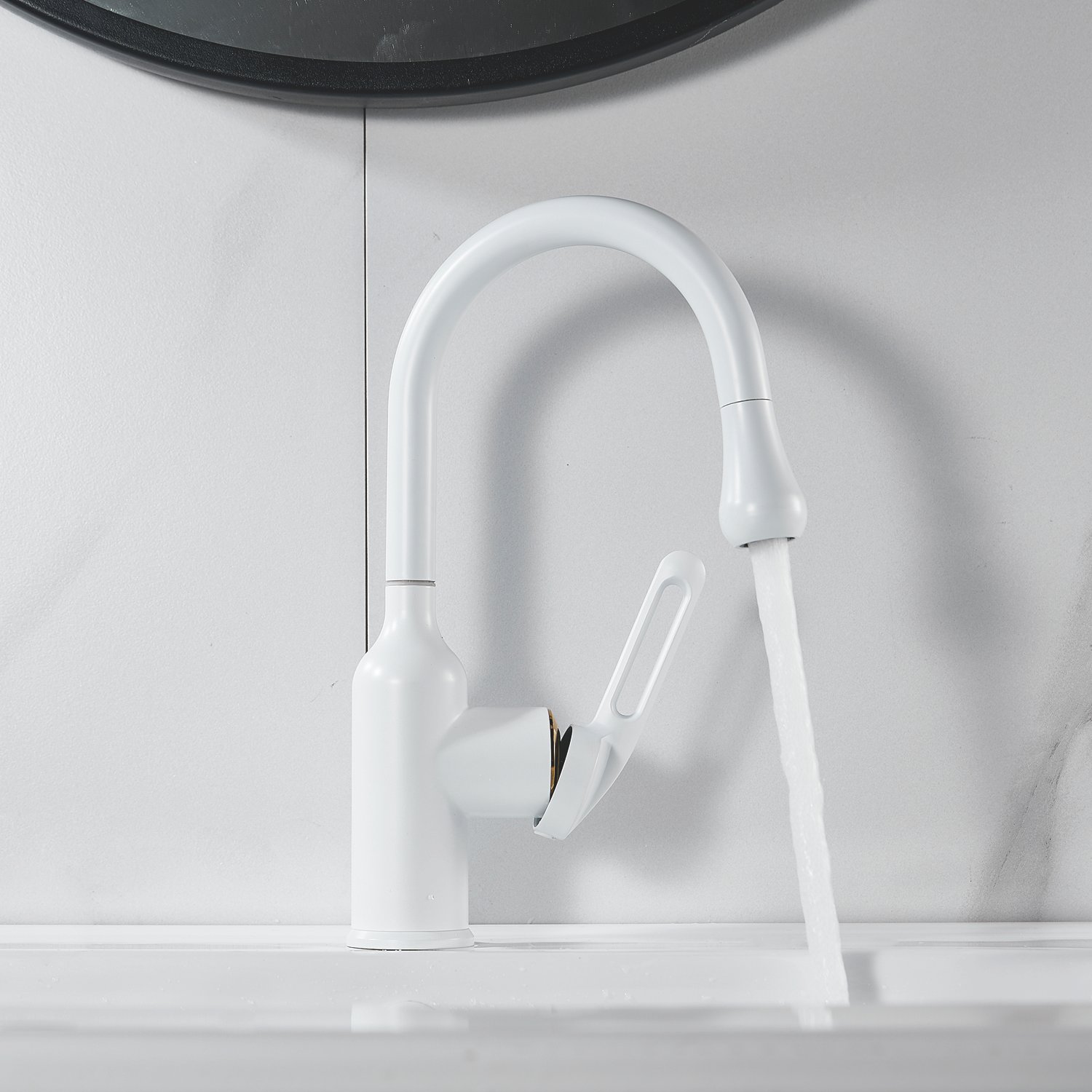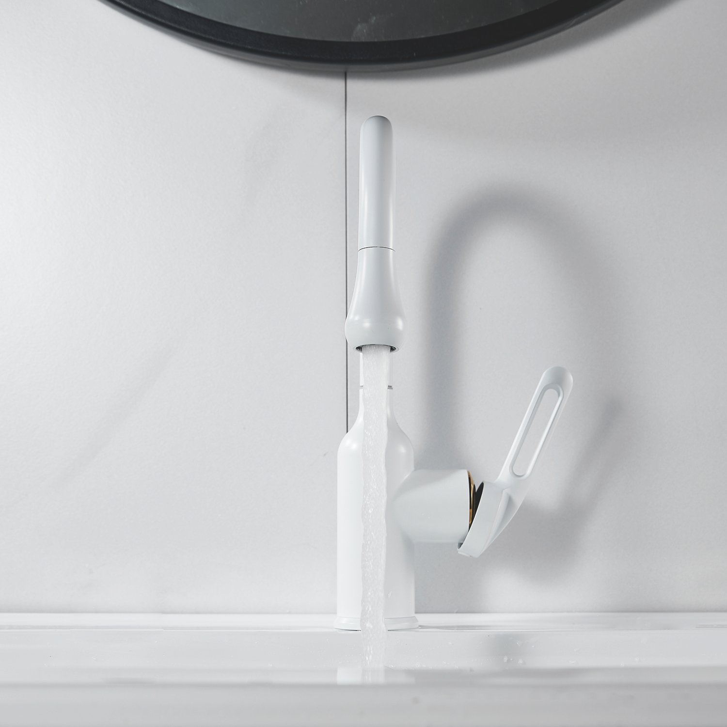 Смеситель для раковины Raffine F101C в белом цвете — это стильное и надёжное решение для вашей ванной комнаты. Изготовленный из высококачественной нержавеющей стали, он обладает прочностью и долговечностью. Поворотный излив с аэратором обеспечивает комфортное использование и экономит воду. Рычажное управление и керамический картридж гарантируют плавное и точное регулирование температуры и напора воды. Монтаж при помощи гайки и гибкая подводка в комплекте облегчают установку. Гарантия на изделие составляет 5 лет.