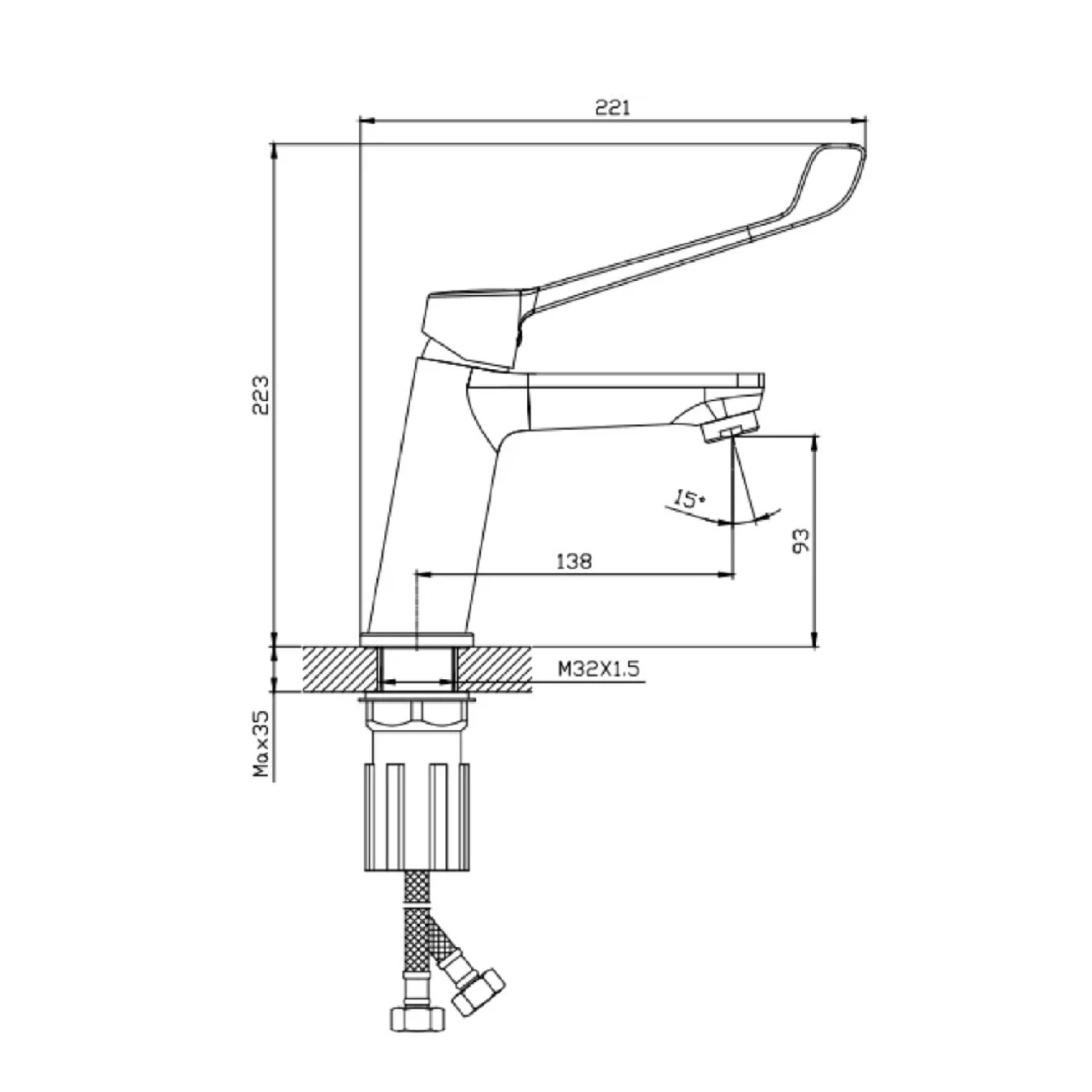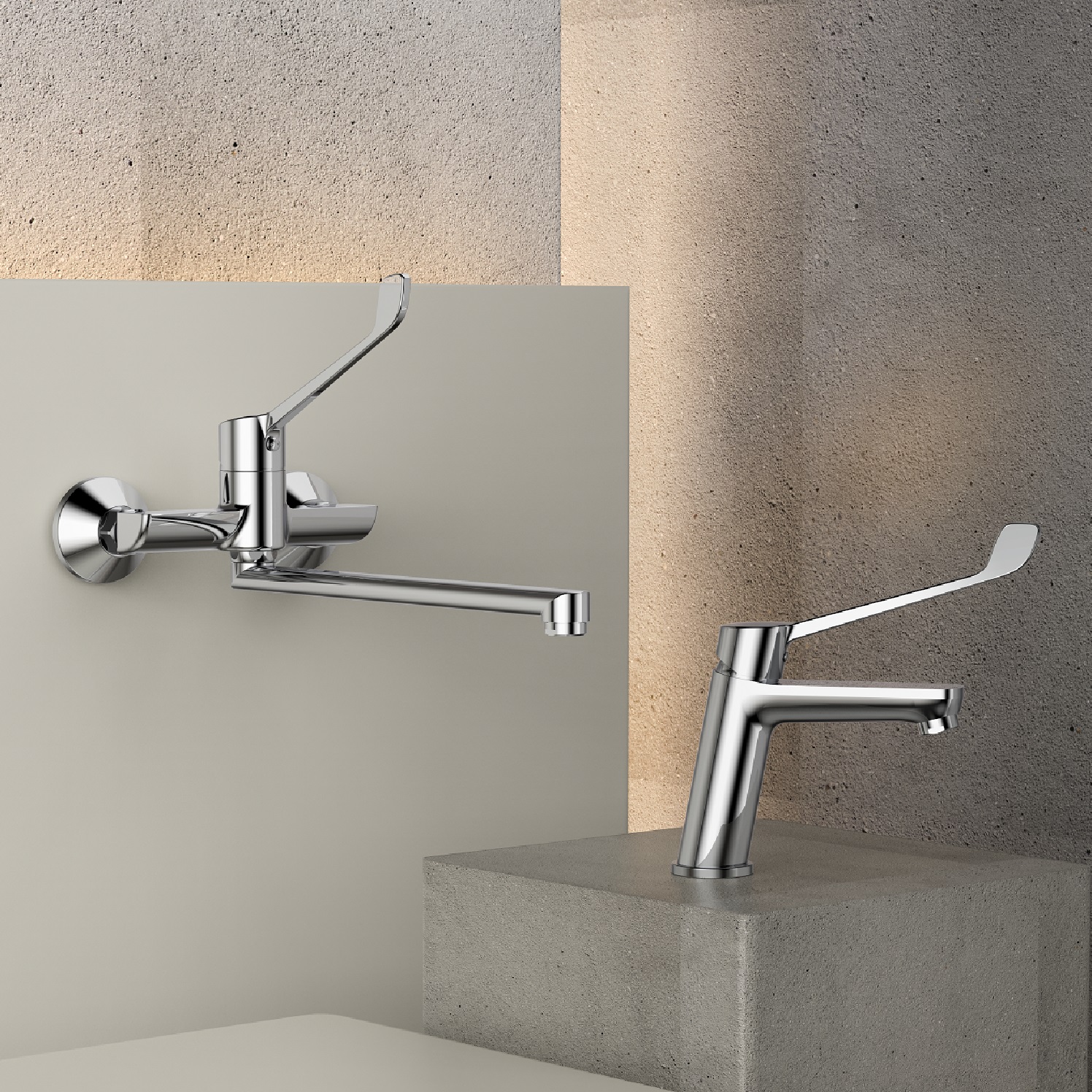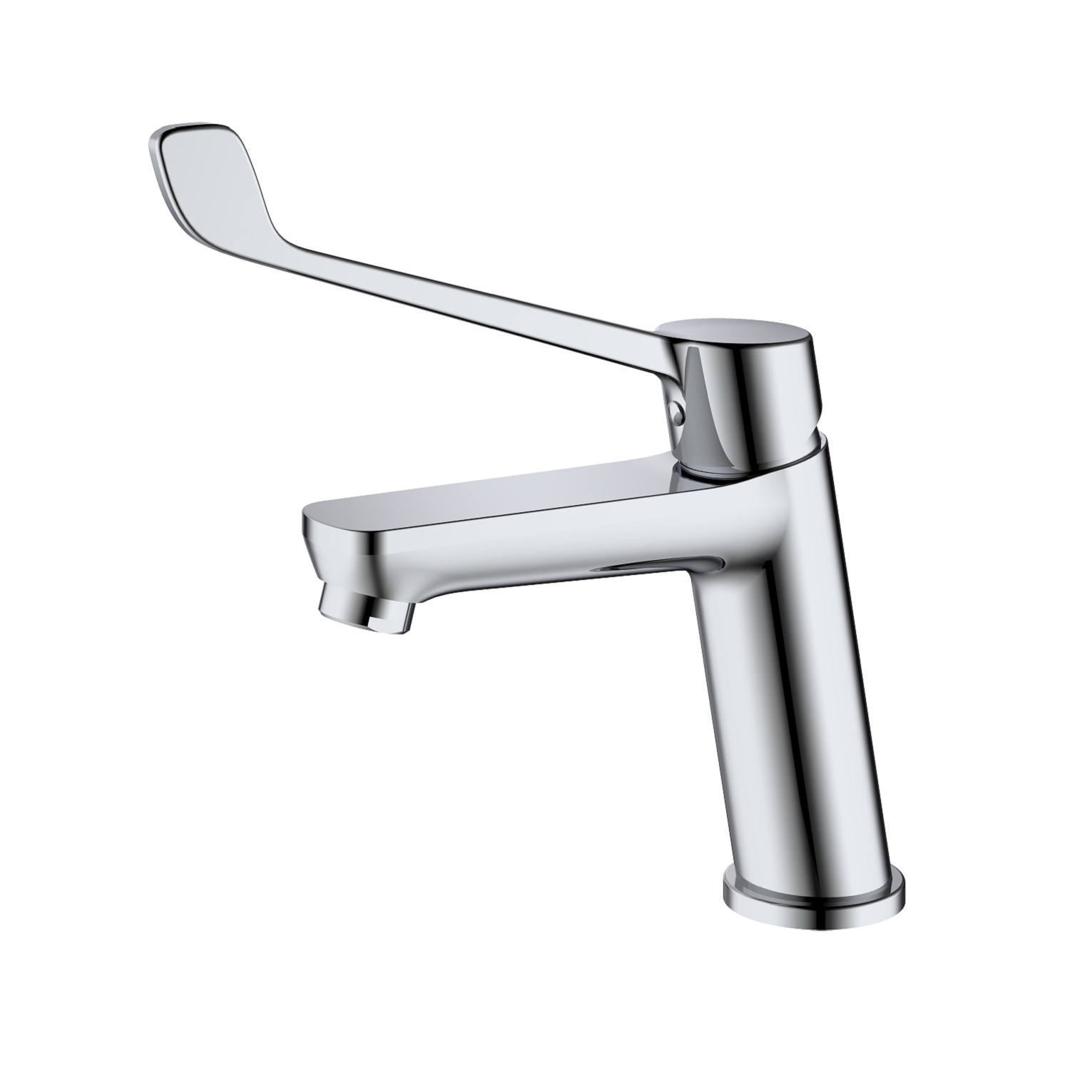 S08.10 Смеситель для раковины с хирургической ручкой локтевой, изготовлен из латуни, керамический картридж 35 мм, хром покрытие. Подводка 50 см, на усиленной гайке. Гарантия 5 лет.