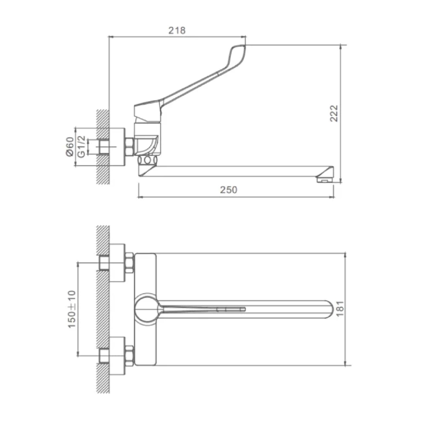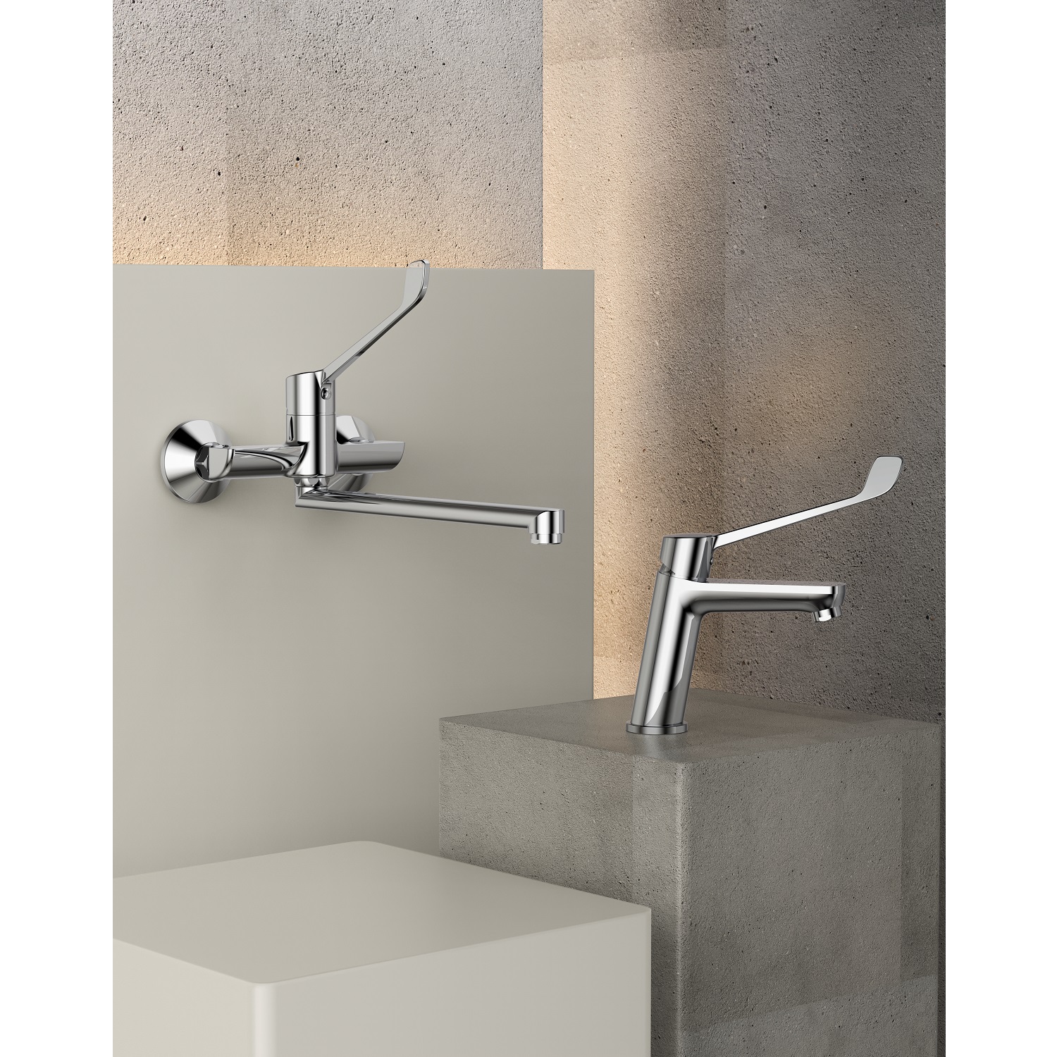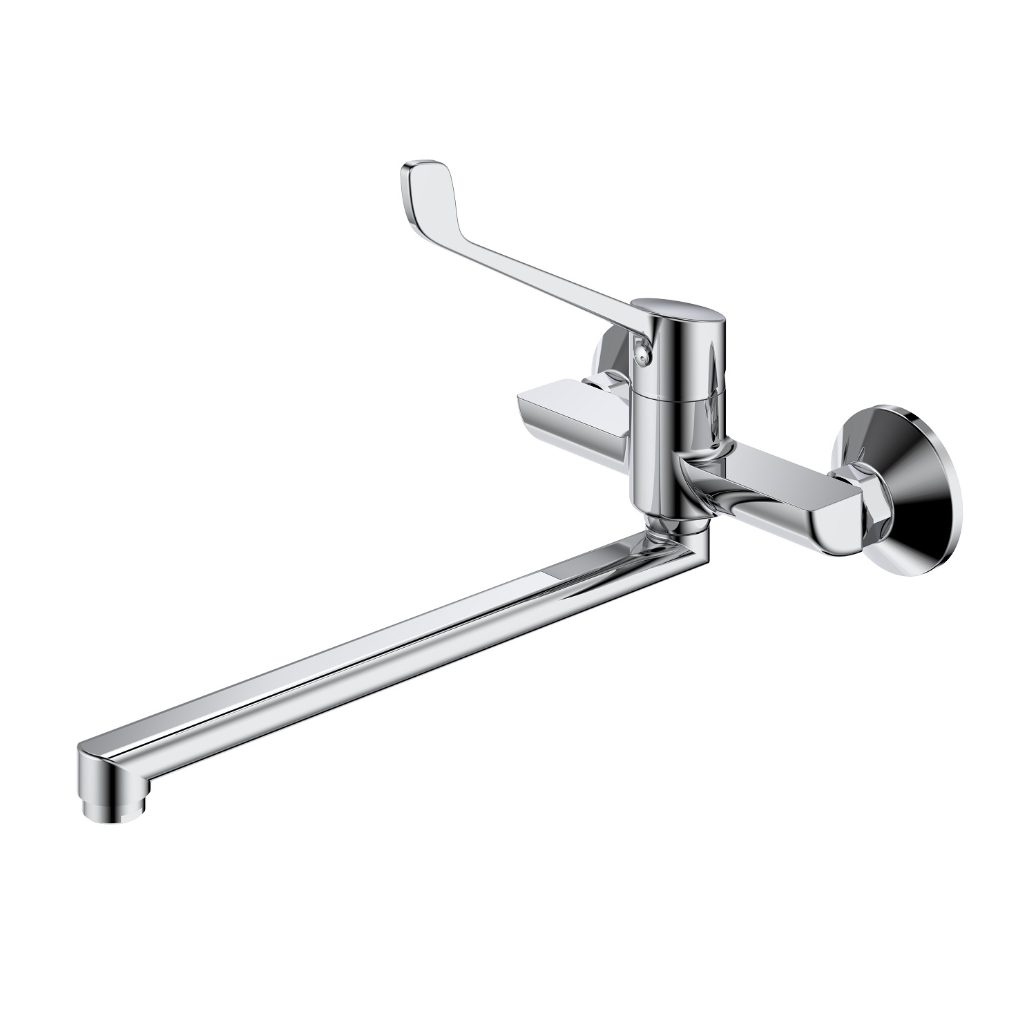 S08.21 Смеситель для раковины настенный с хирургической ручкой локтевой, изготовлен из латуни, керамический картридж 35 мм, хром покрытие. Гарантия 5 лет.
