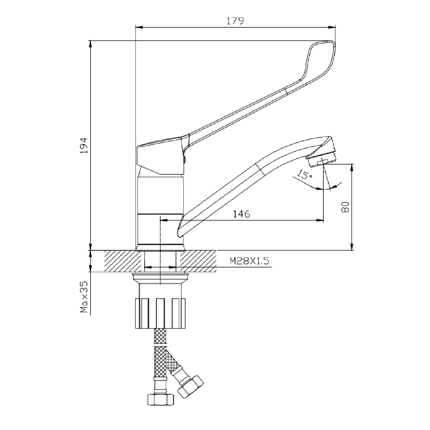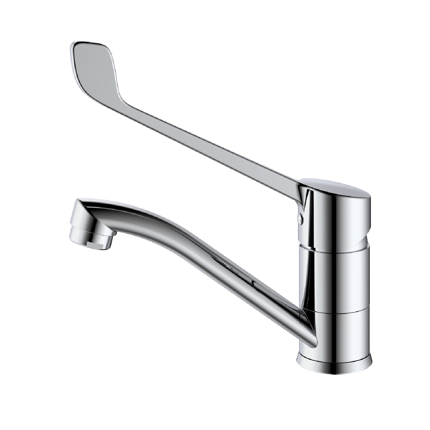 S08.45 Смеситель для раковины/мойки с хирургической ручкой локтевой, изготовлен из латуни, керамический картридж 35 мм, хром покрытие. Подводка 50 см, на усиленной гайке. Гарантия 5 лет.