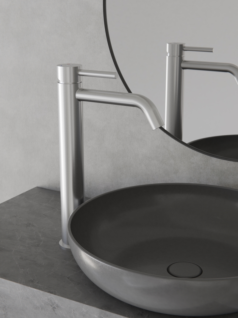 Высокий смеситель с матовым покрытием из нержавеющей стали — гармония функциональности и современного дизайна.