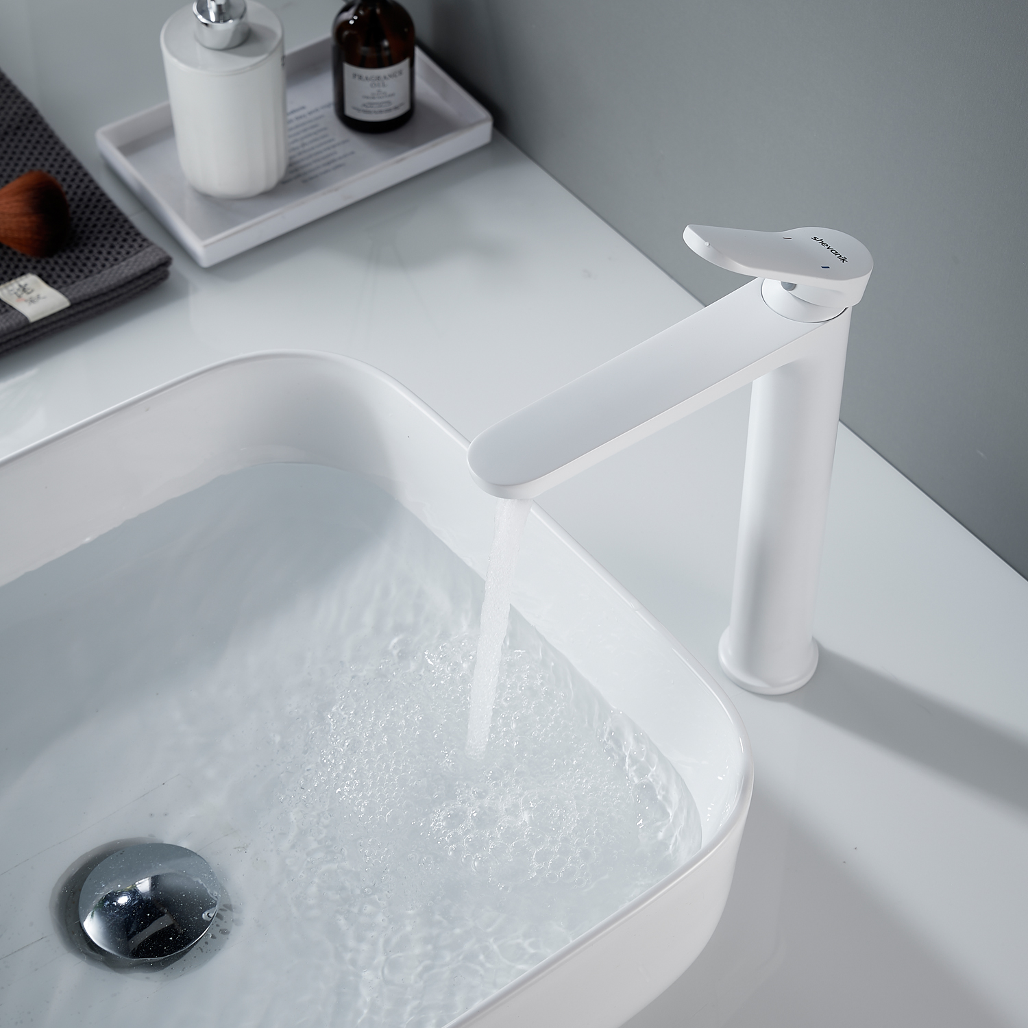 Высокий смеситель для раковины Shevanik S4311C в белом матовом цвете — идеальное решение для современных интерьеров, особенно для раковин-чаш. Его современный дизайн с плавными линиями придаст вашей ванной комнате элегантность и стиль. Смеситель оснащён надёжным керамическим картриджем и удобным рычажным управлением, что обеспечивает долговечность и простоту использования.