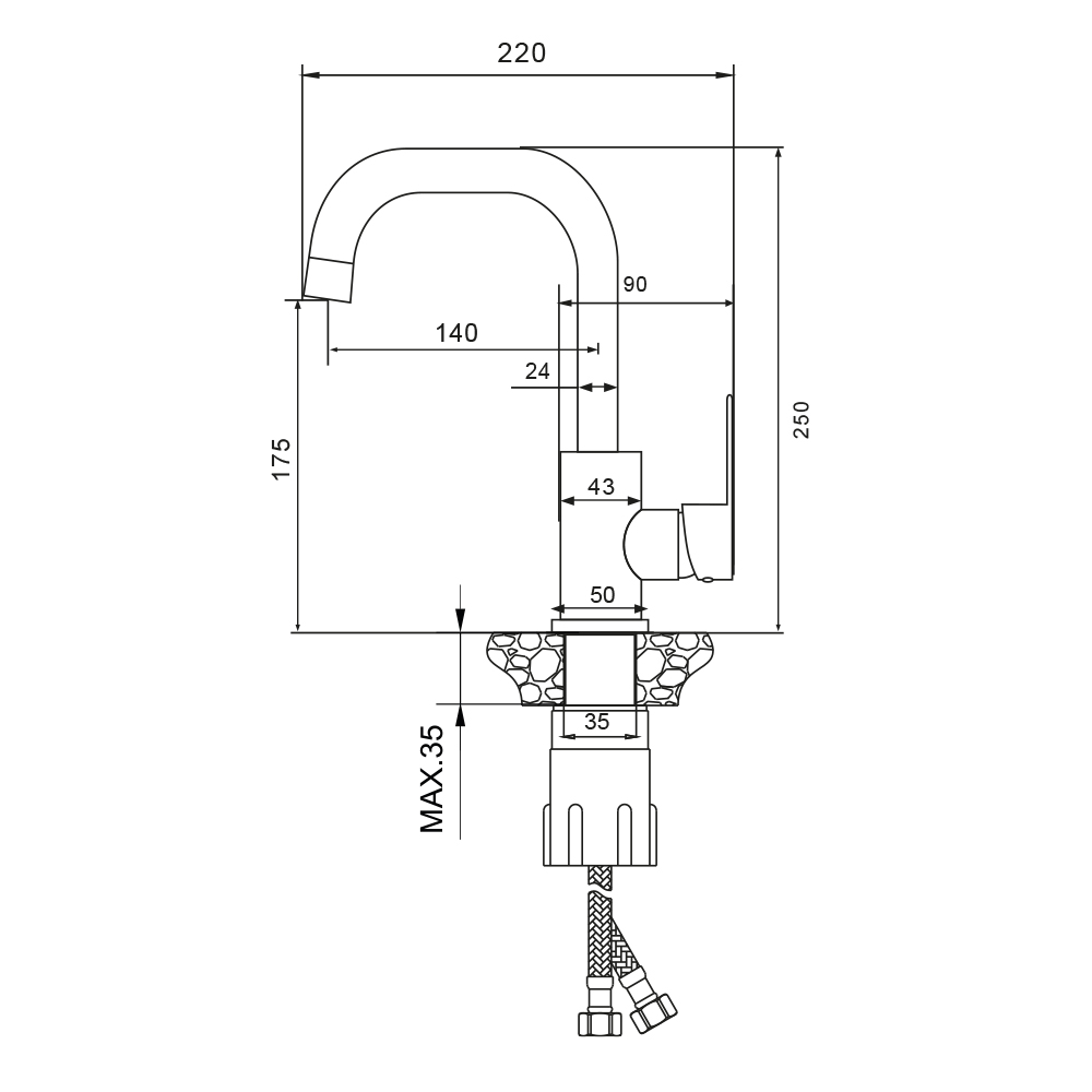 Материал: нержавеющая сталь SUS304. Цвет: черный. Поворотный излив. Керамический картридж 35 мм c противошумной вставкой. ЭКО аэратор 9 л/мин. Гибкая подводка EPDM в оплетке из нержавеющей стали 1/2" 50 см. Пьедестал из нержавеющей стали. Крепеж Easy Fix из нержавеющей стали
